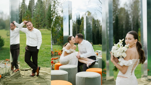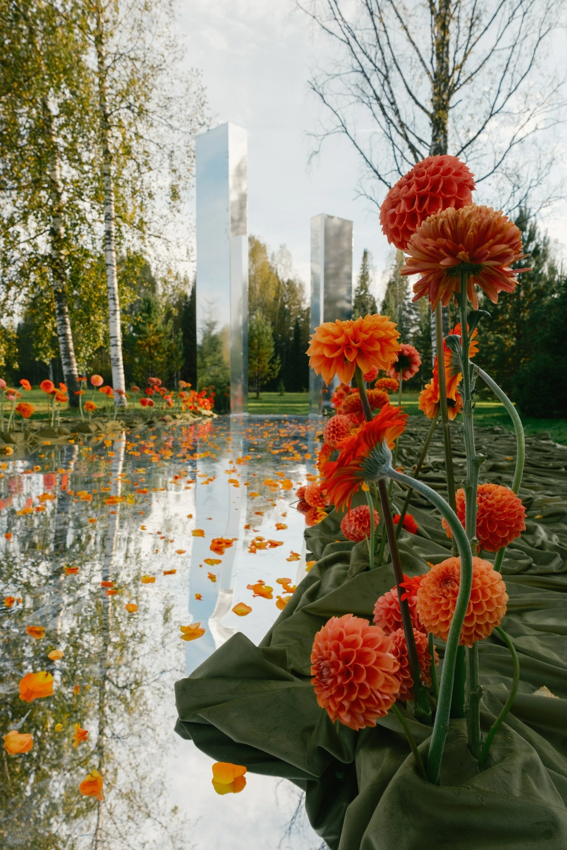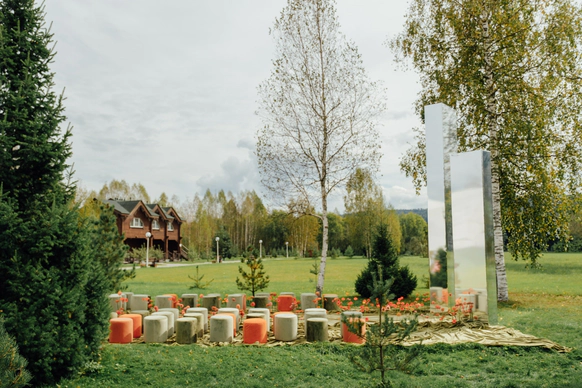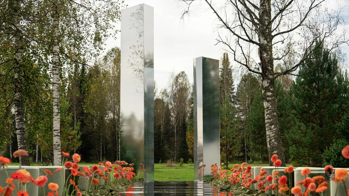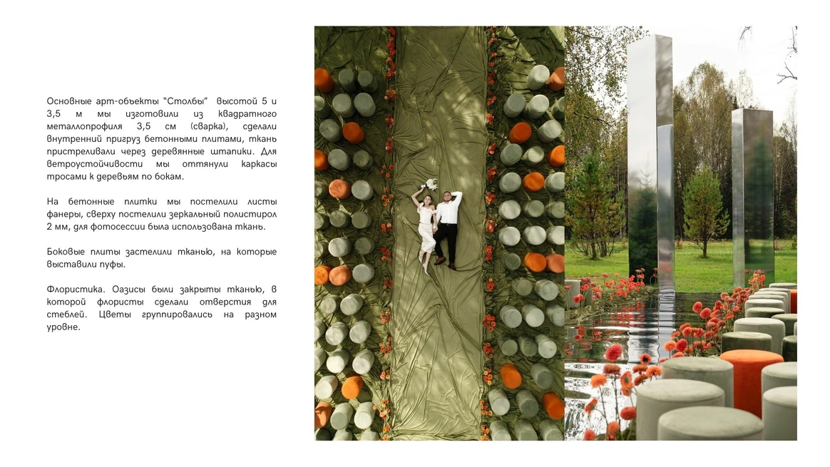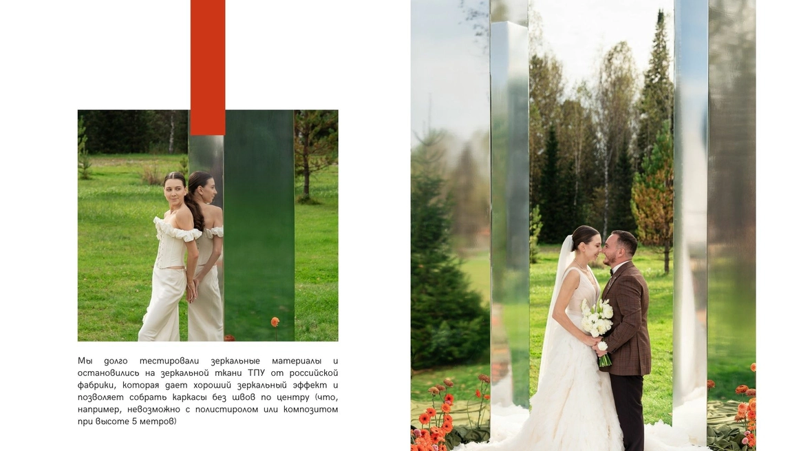 Так как пространство церемонии - это площадка с двумя вертикальными объектами по бокам, березами, то мы решили визуально усилить эффект параллельных прямых при помощи зеркальных столбов.