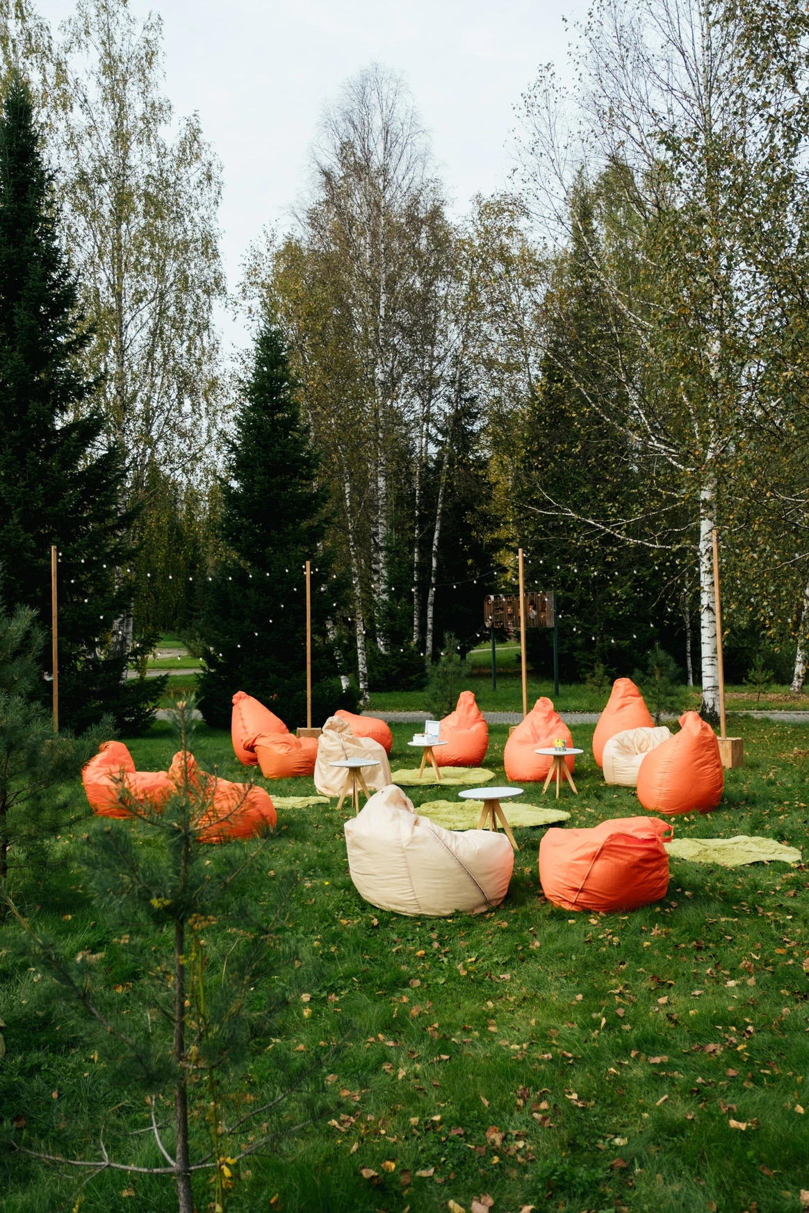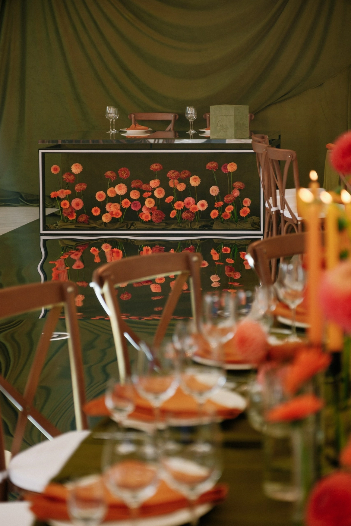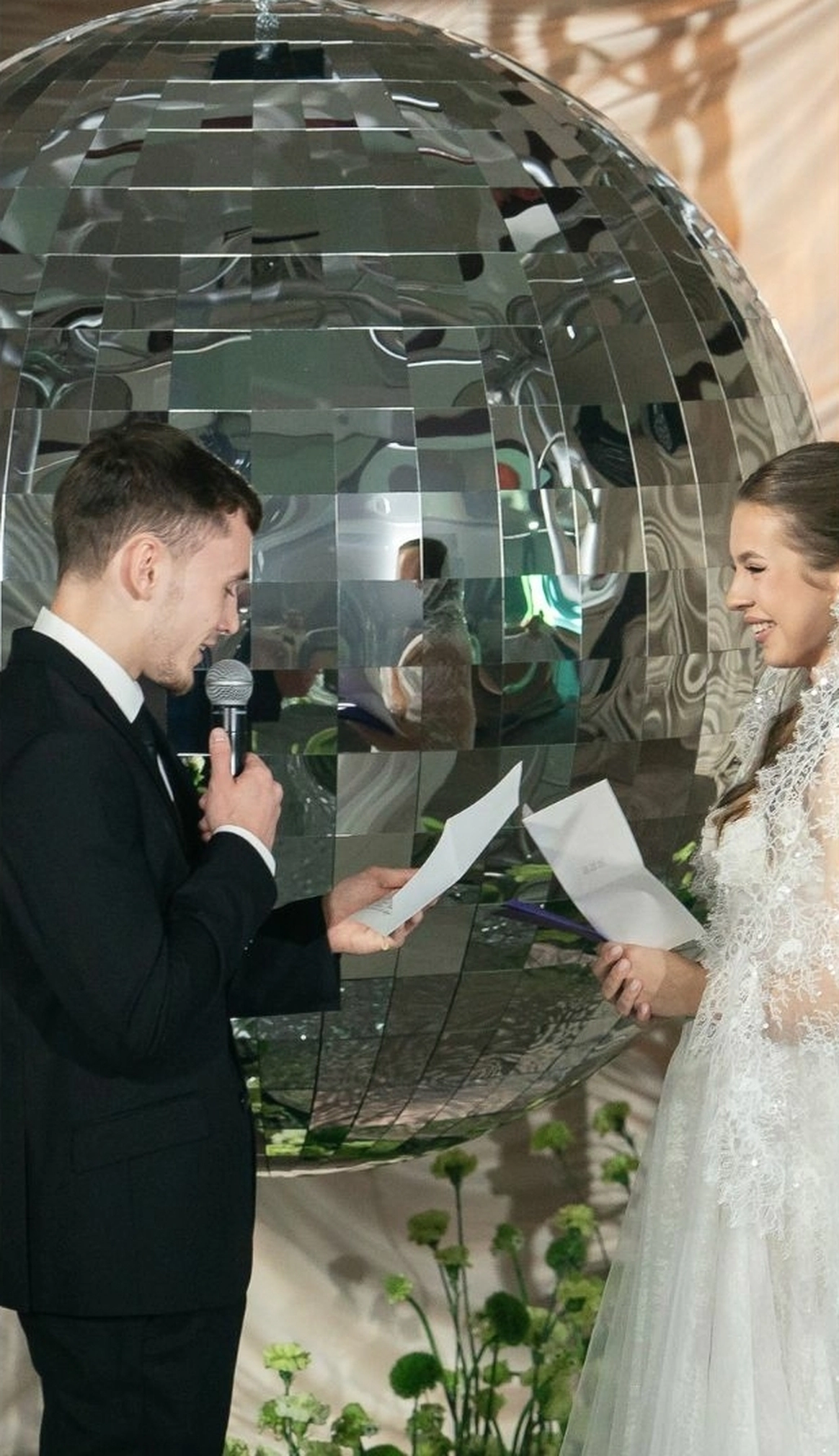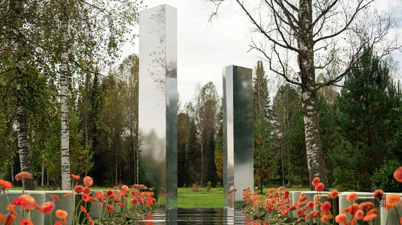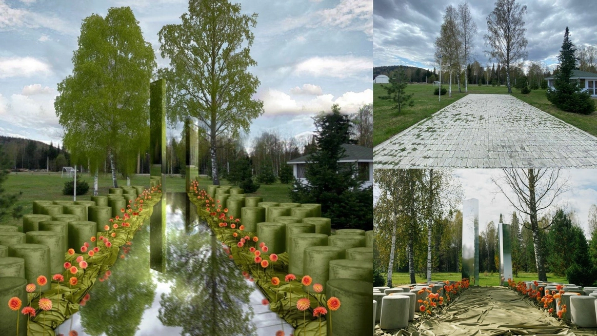 Так как пространство церемонии - это площадка с двумя вертикальными объектами по бокам, березами, то мы решили визуально усилить эффект параллельных прямых при помощи зеркальных столбов.