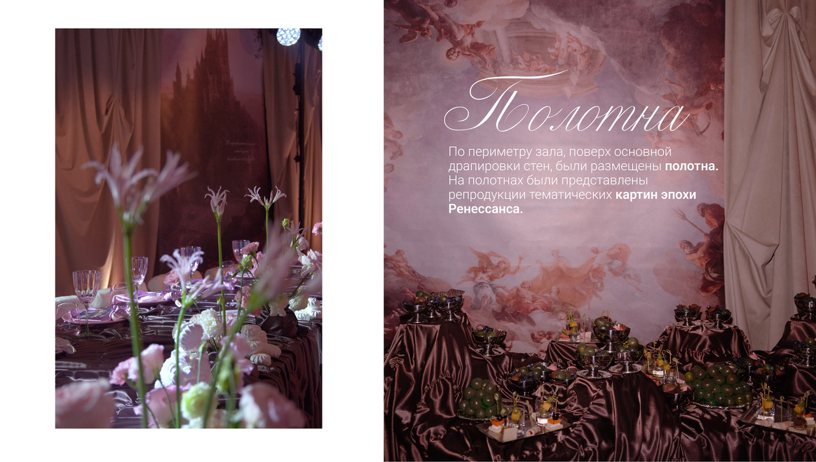Сергей и Кристина рассказали нам, что им обоим близка эстетика эпохи возрождения. А также поделились, что их первая встреча произошла весной, а предложение было сделано в первый день весны. Концепция эпохи Ренессанса и картина "Весна" пришла сама собой и идеально дополнила наших героев.