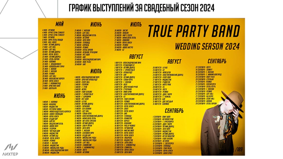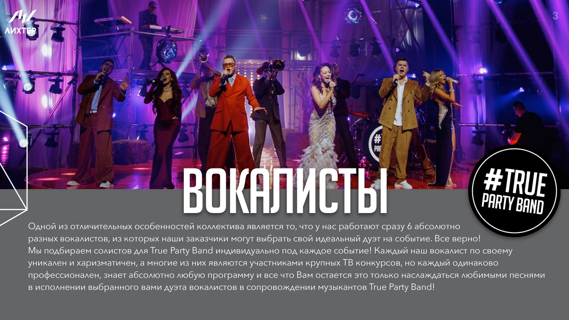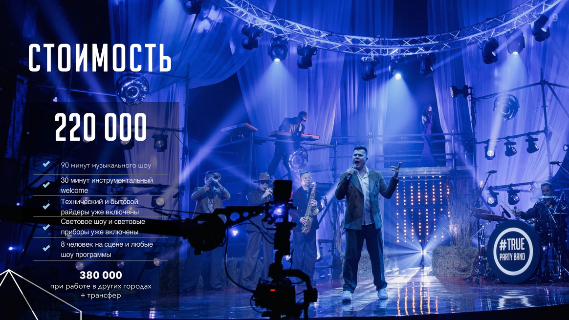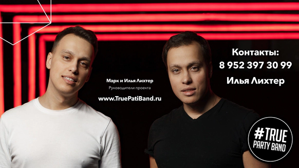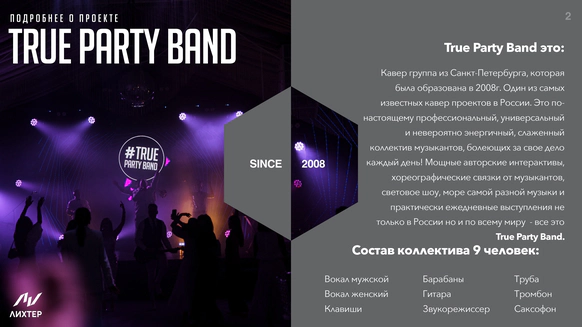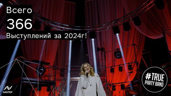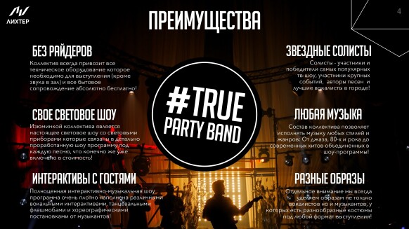 Кавер группа True Party Band за 14 лет успешной работы в event индустрии отыграли более 4000 концертов, в том числе на крупнейших событиях страны. Также выступали на самых больших площадках, таких как: Олимпийский стадион "Фишт" в Сочи, "Ледовый дворец", "Лужники", БКЗ "Октябрьский" и другие. А еще мы стали участниками более 1500 удивительных свадеб по всей России. В нашей команде все музыканты - это профессионалы своего дела, солисты группы являются участниками и победителями самых популярных тв-шоу таких как "Голос", "X-Factor", "Новая Волна", "Фактор А", "Главная сцена" В составе группы два солиста (мальчик и девочка), тромбон, саксофон, труба, клавиши, гитара, барабаны, что позволяет создать яркое и фееричное музыкальное шоу!
