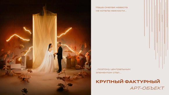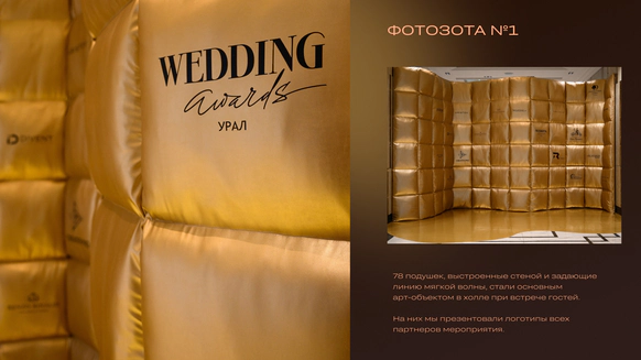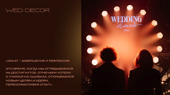 Лучший свадебный декор Wedding Awards Ural’ 2021 Лучший свадебный декор Wedding Awards Ural’ 2022 Генеральный партнер премии Wedding Awards Ural’ 2024 С нашим декором организаторы, видеографы и фотографы забирают статуэтки на Wedding Awards Ural и становятся финалистами на Wedding Awards Russia (Лучшее свадебное агентство региона, Лучший клиентский проект, Лучший проект до 3.000.000, Лучший репортажный фотограф, Лучший видеограф, Лучший кадр, Лучший фотограф) *Публикации в главных свадебных пабликах страны **Печать в глянцевых журналах