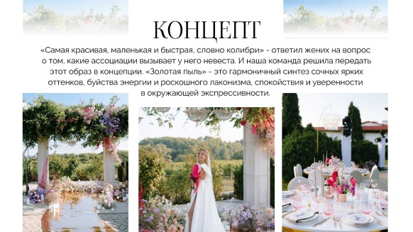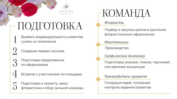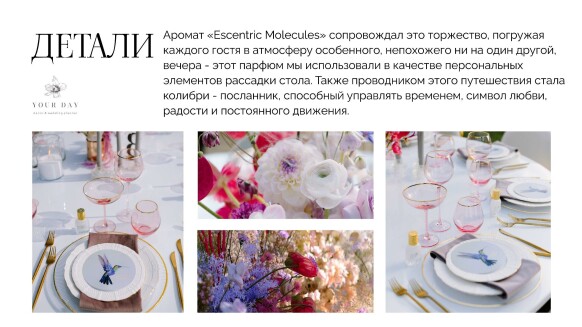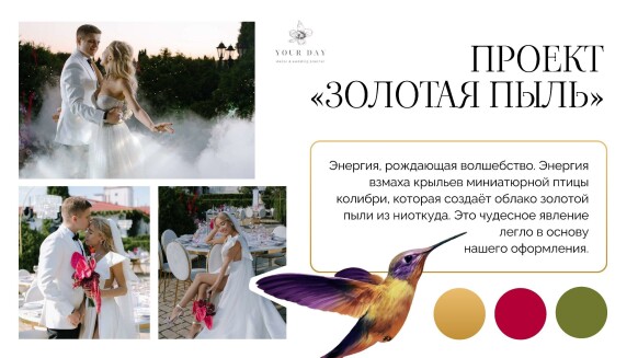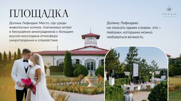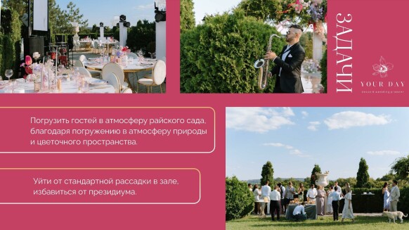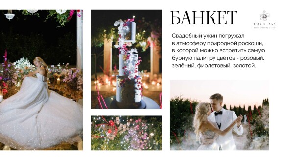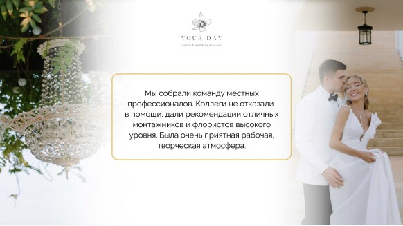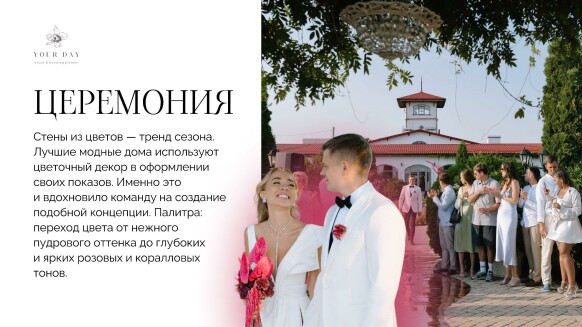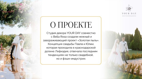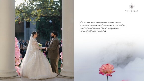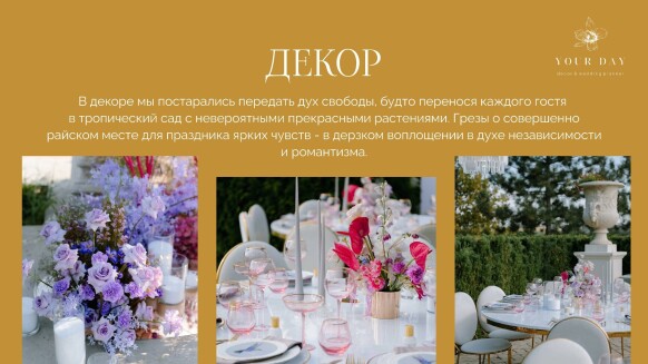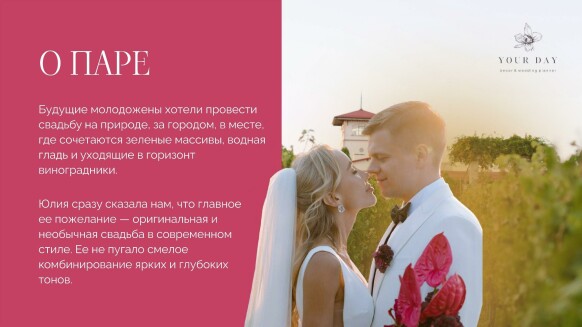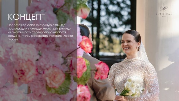 Я — Наталия Бурда, владелица и основатель студии декора Your day. Моя эстетика - это красота вне времени, отраженная в декоре, флористике и общем стиле торжества. Мой фокус внимания — постоянный поиск лучших решений в декоре и дизайне и отслеживание тенденций в мире моды, чтобы создавать самые актуальные события. Я и моя команда много учимся, оформляем проекты любого масштаба и реализуем в декоре самые смелые желания своих клиентов. Мы помогаем создать для наших героев счастливые воспоминания, которые останутся с ними навсегда. Особая философия нашего агентства — мы не делаем шаблонные свадьбы. Мы верим, что свадьба — это отражение уникальности пары и их любви друг к другу. Мы создаём персонализированные концепции декора, которые отражают стиль и воплощают мечты наших молодоженов. С одинаковым удовольствием мы реализуем как масштабные, так и камерные истории.