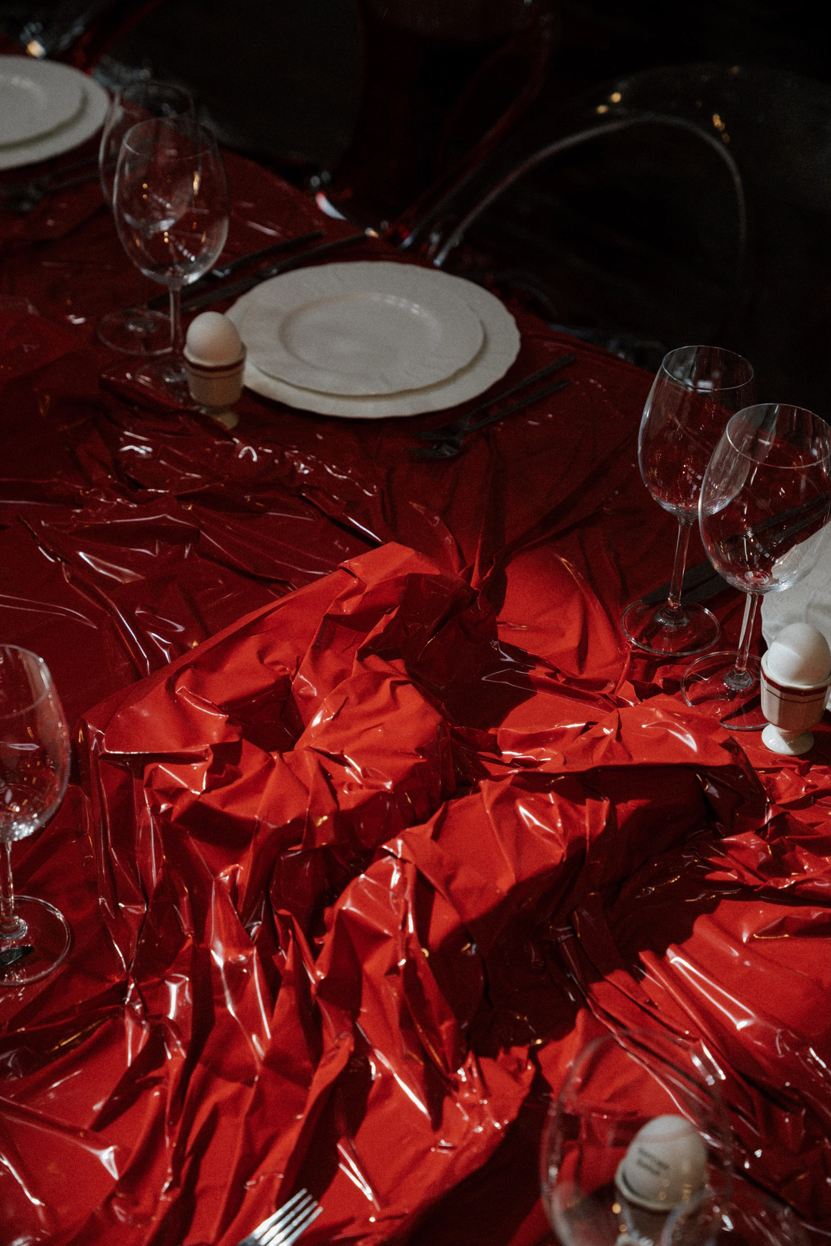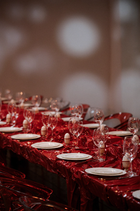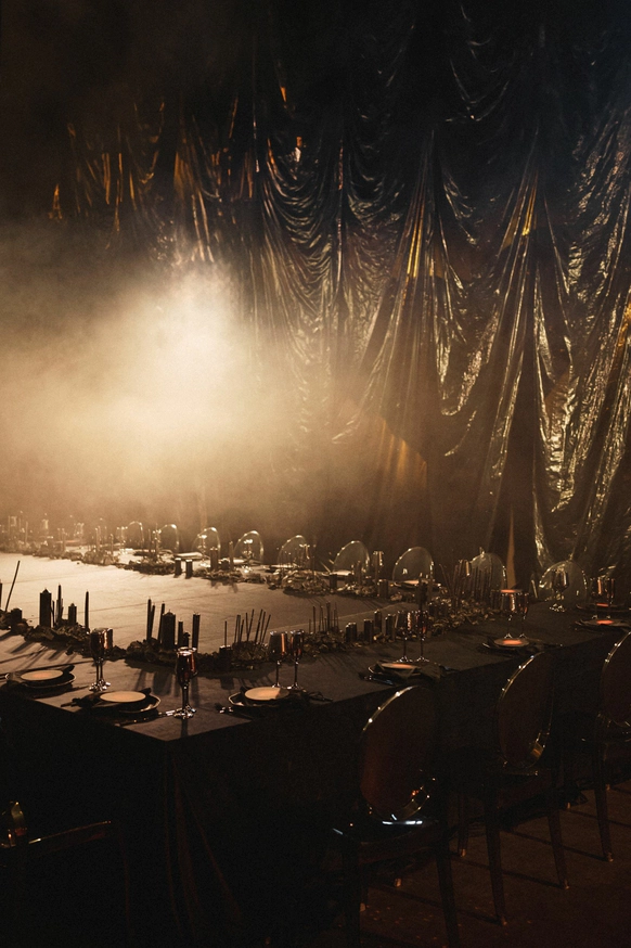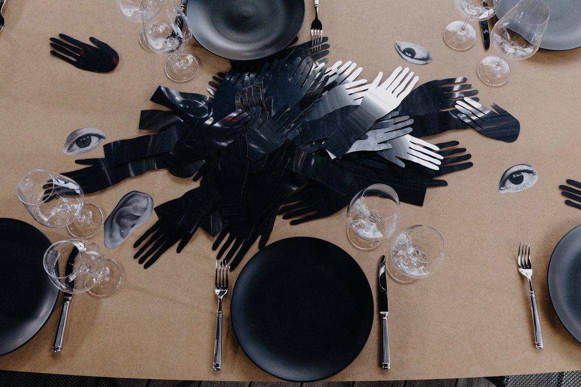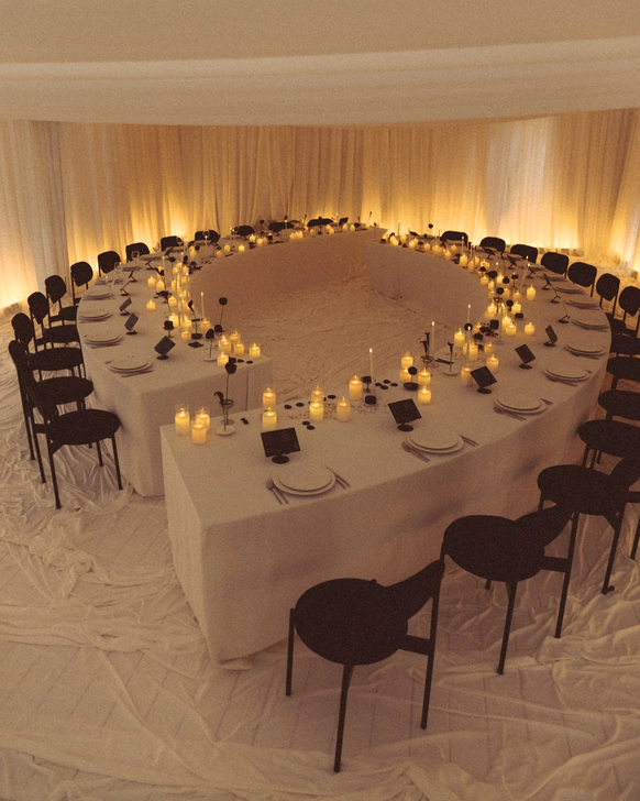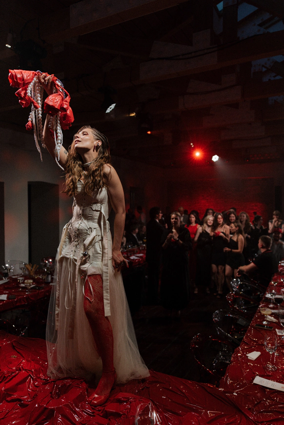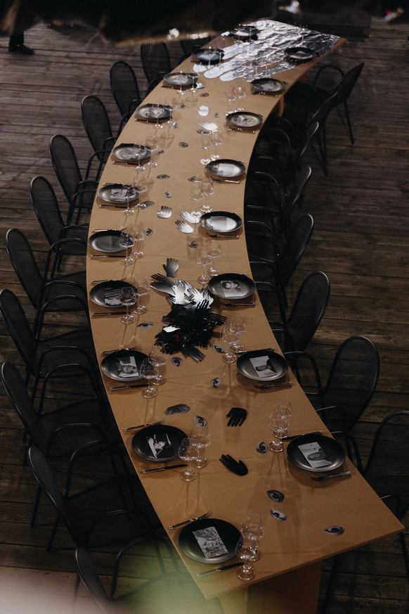 Тема заголовков продолжилась на ужине: по периметру стола тянулось «здесь все ради стиля и драмы». Буквы, обтянутые красной латексной пленкой, выглядели телесно и театрально – прочитать могли лишь любопытные