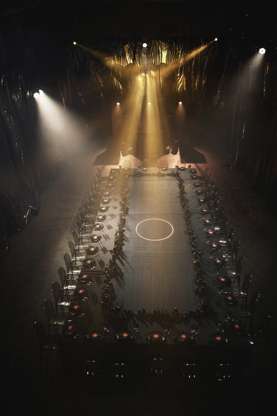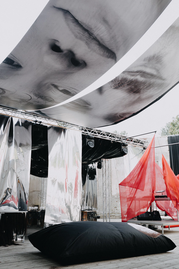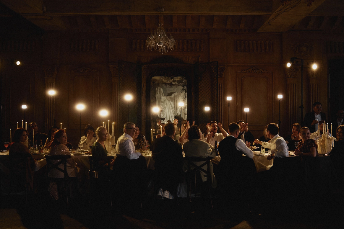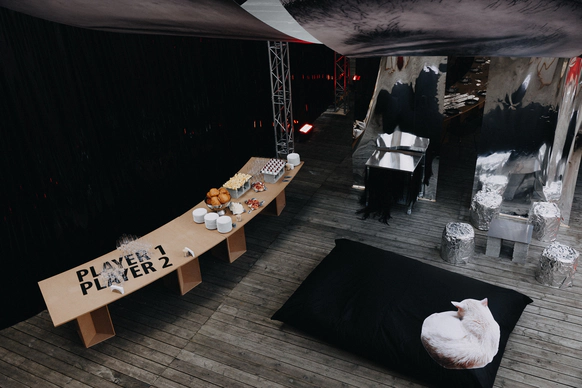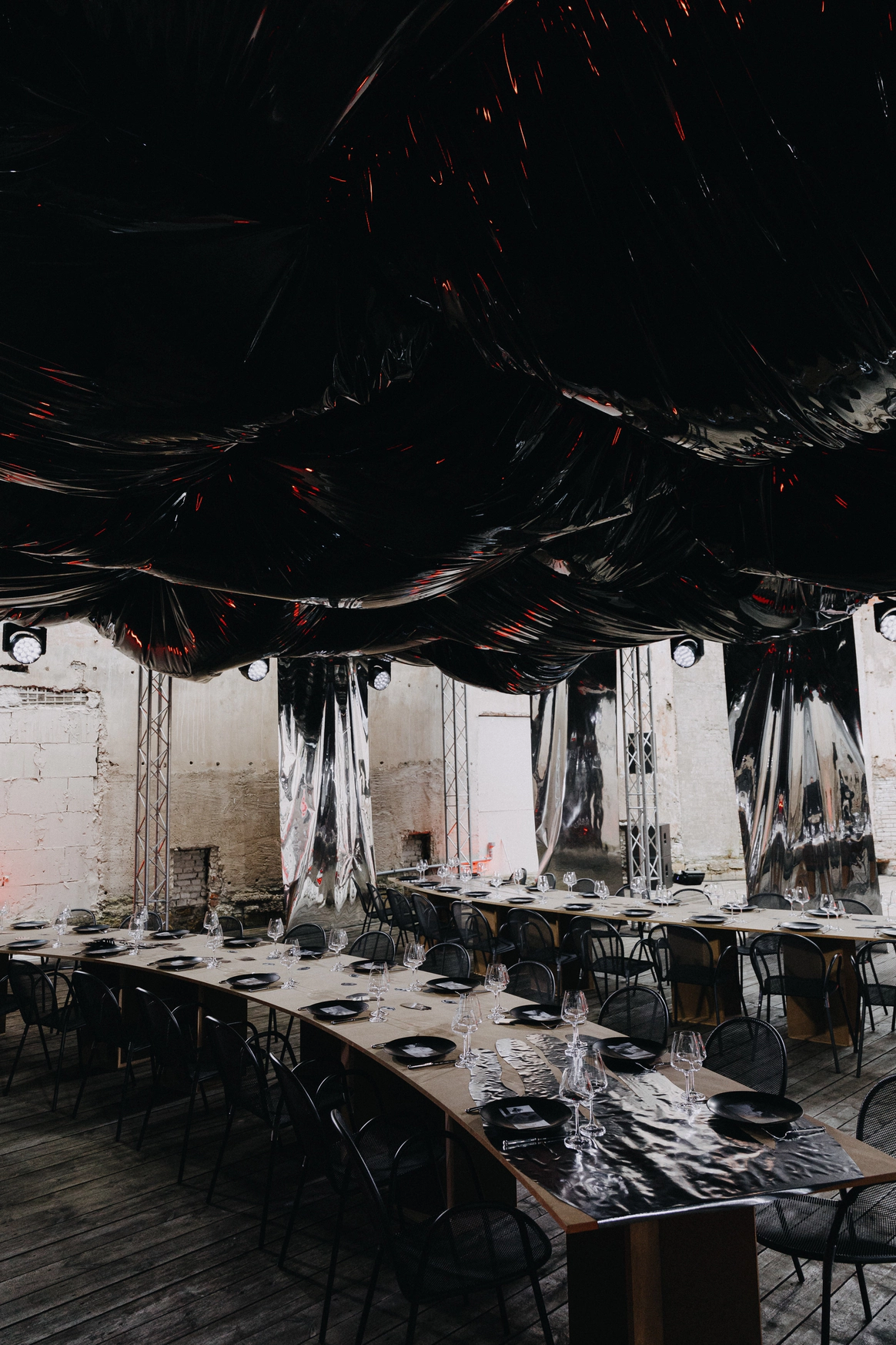 В основе всего лежали честные строительные материалы, которые не прятались за драпировками: натяжной потолок стал и стенами, и задником для церемонии, и черным облаком над ужином;