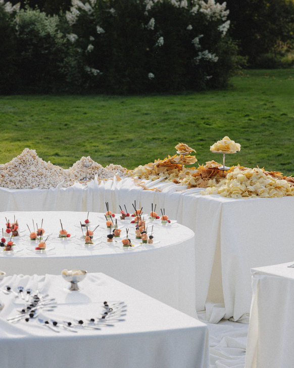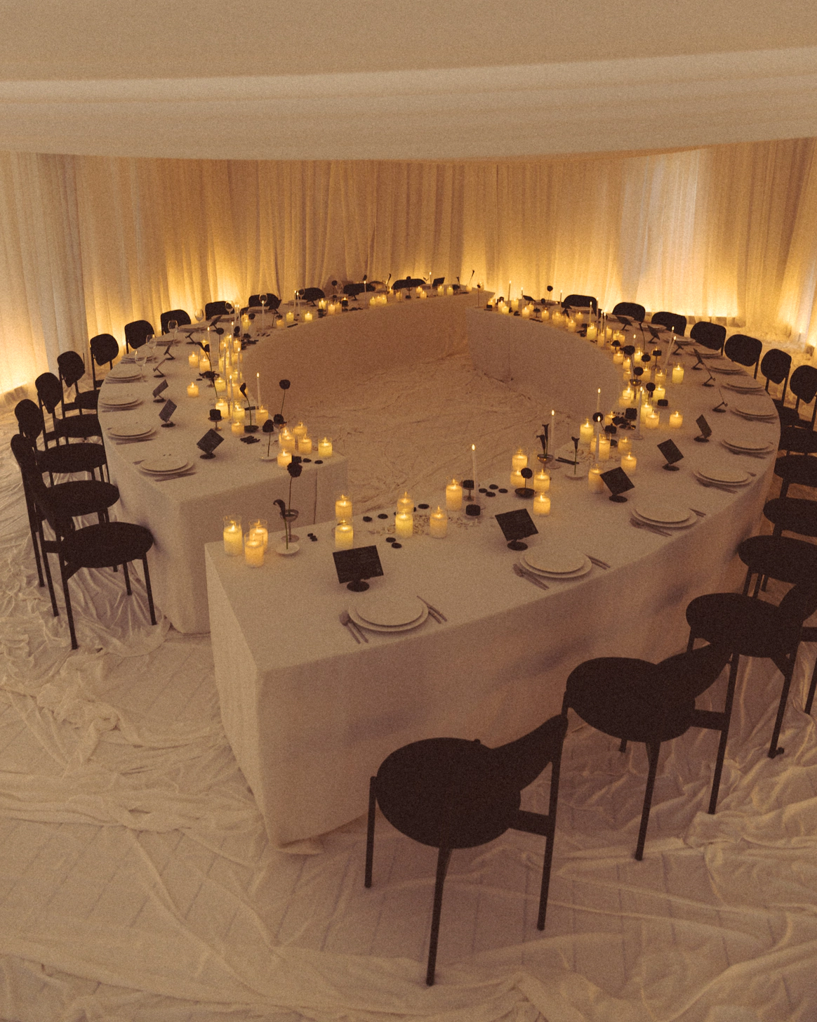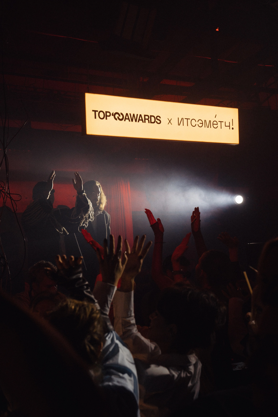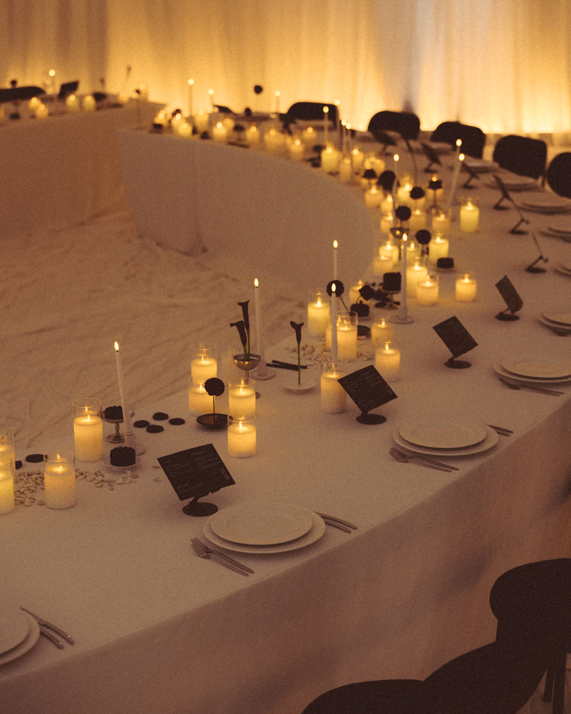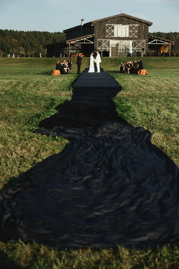В основе всего лежали честные строительные материалы, которые не прятались за драпировками: натяжной потолок стал и стенами, и задником для церемонии, и черным облаком над ужином;