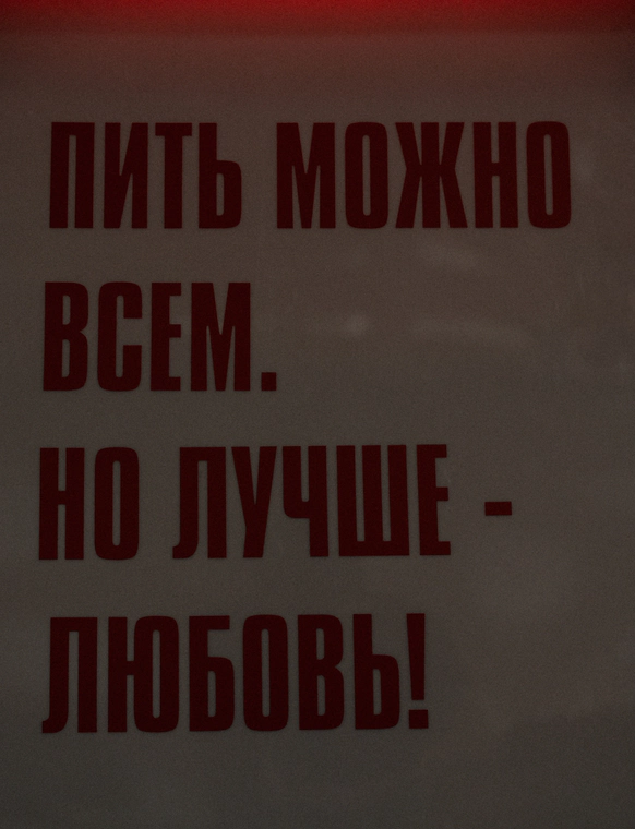 Абсурд поддержали напрямую – манифестом. Постеры в эстетике Partisan Press на баре и где угодно. Лозунги, как парадоксальные заповеди: «Пить можно всем, но лучше любовь», «Здесь можно есть и плакать», «Танцы запрещены. Только для всех»