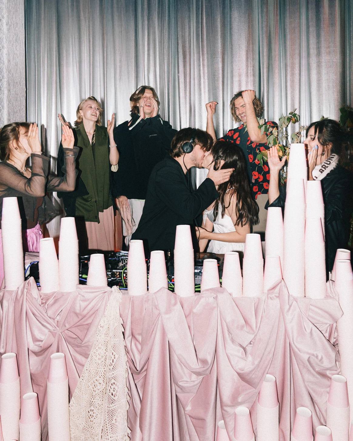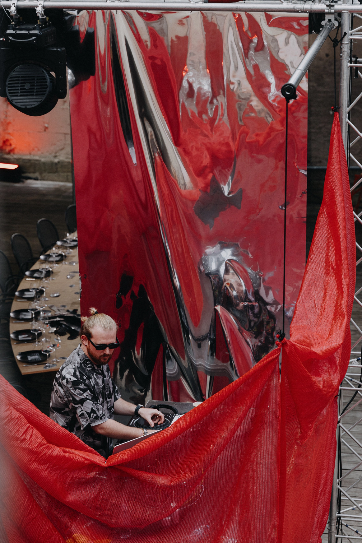 Строительная сетка – вуаль диджея и "чехлы" для мебели. В ход пошло все из раздела «веселый прораб»: и бетоноблоки, и необработанное дерево, и бонусом – секси-развалина Петербурга