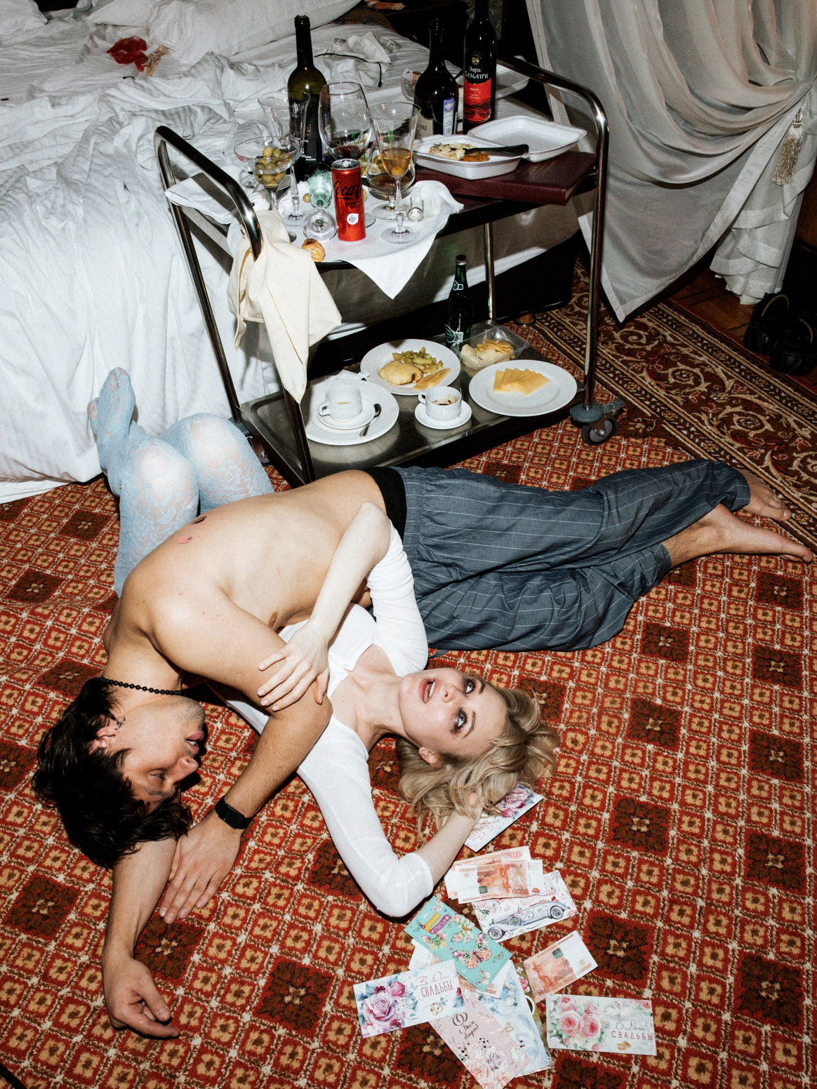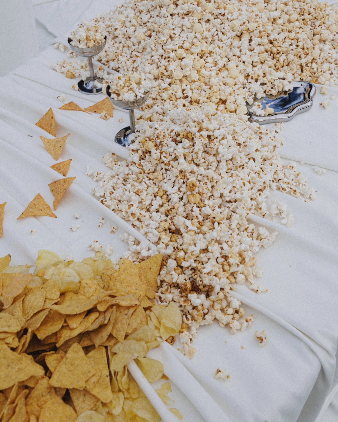 В сет-дизайн вкрапили элегантный бардак – разбросанные чипсы и поп-корн, которые являются третьим участником в треугольнике любви Жени и Светы
