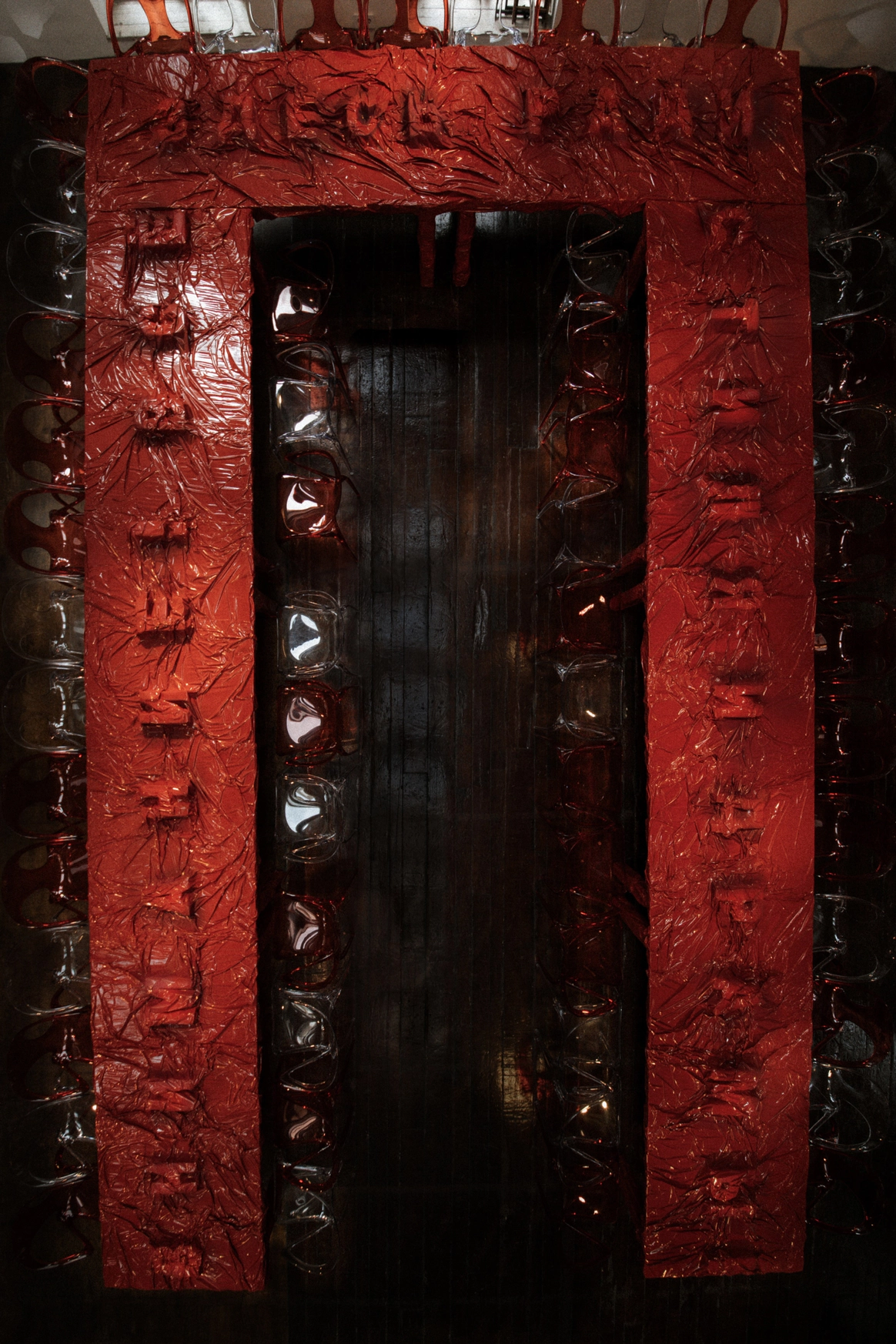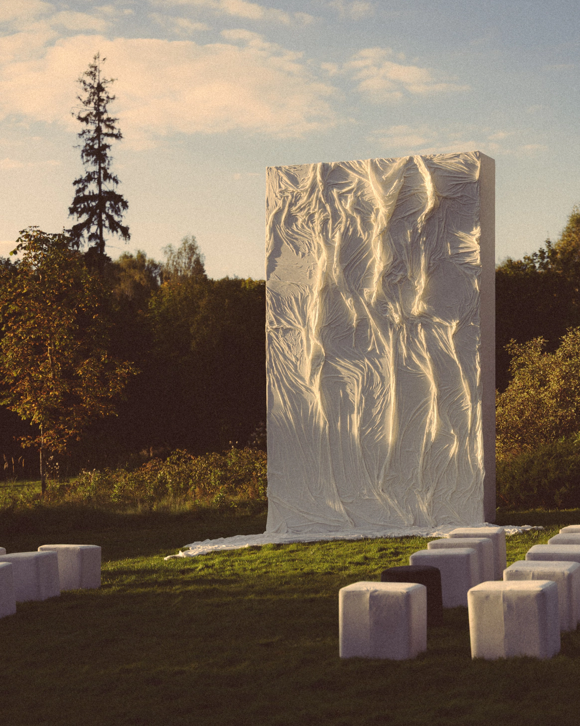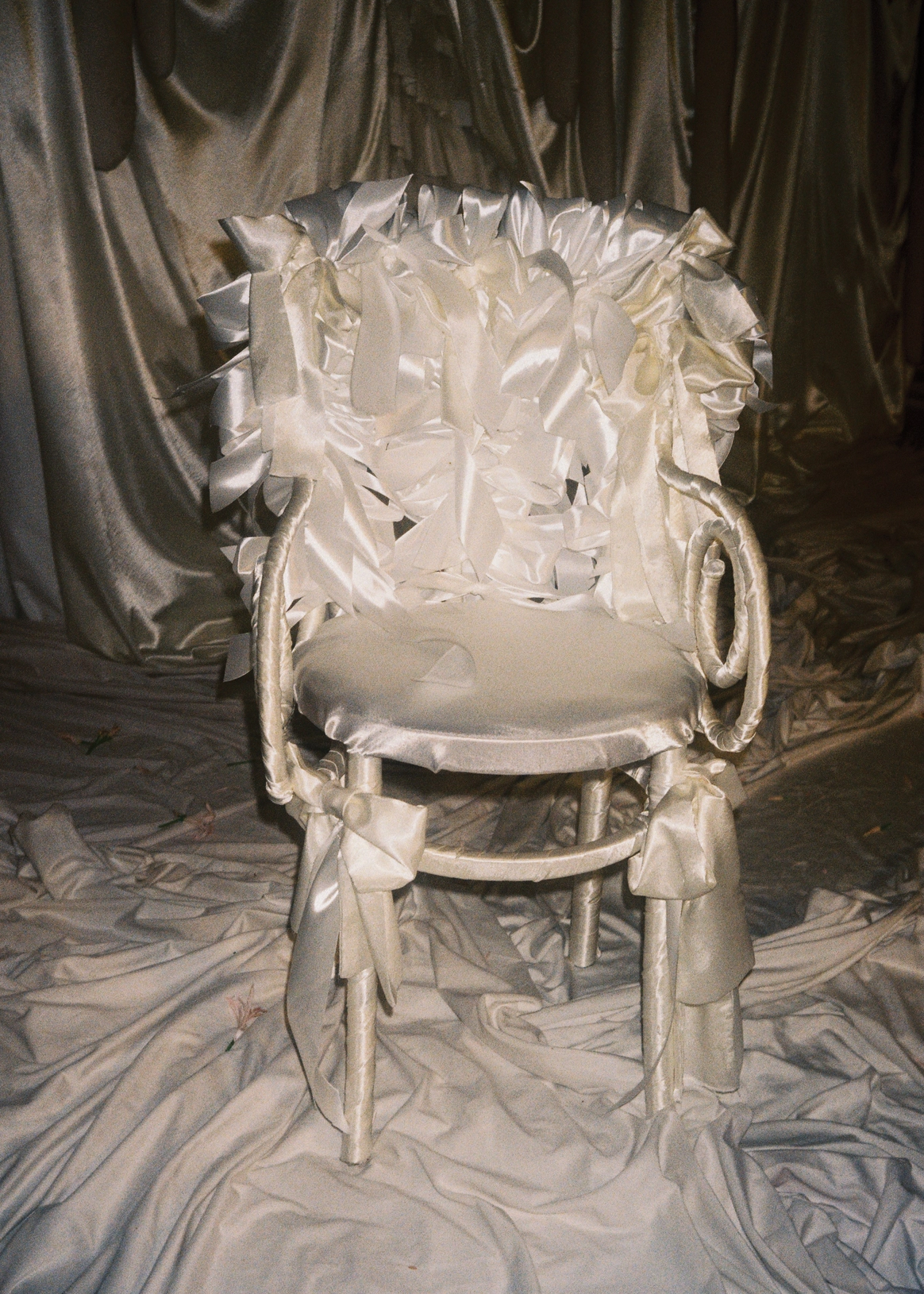 Для церемонии мы создали инсталляцию в виде застывшей мокрой ткани (вдохновлялись мокрым платьем Терри Мюглера, как символом красоты и хрупкости). Несущую конструкцию сделали здоровенную, чтобы перекрыть уже надоевший фон Целеевской часовни