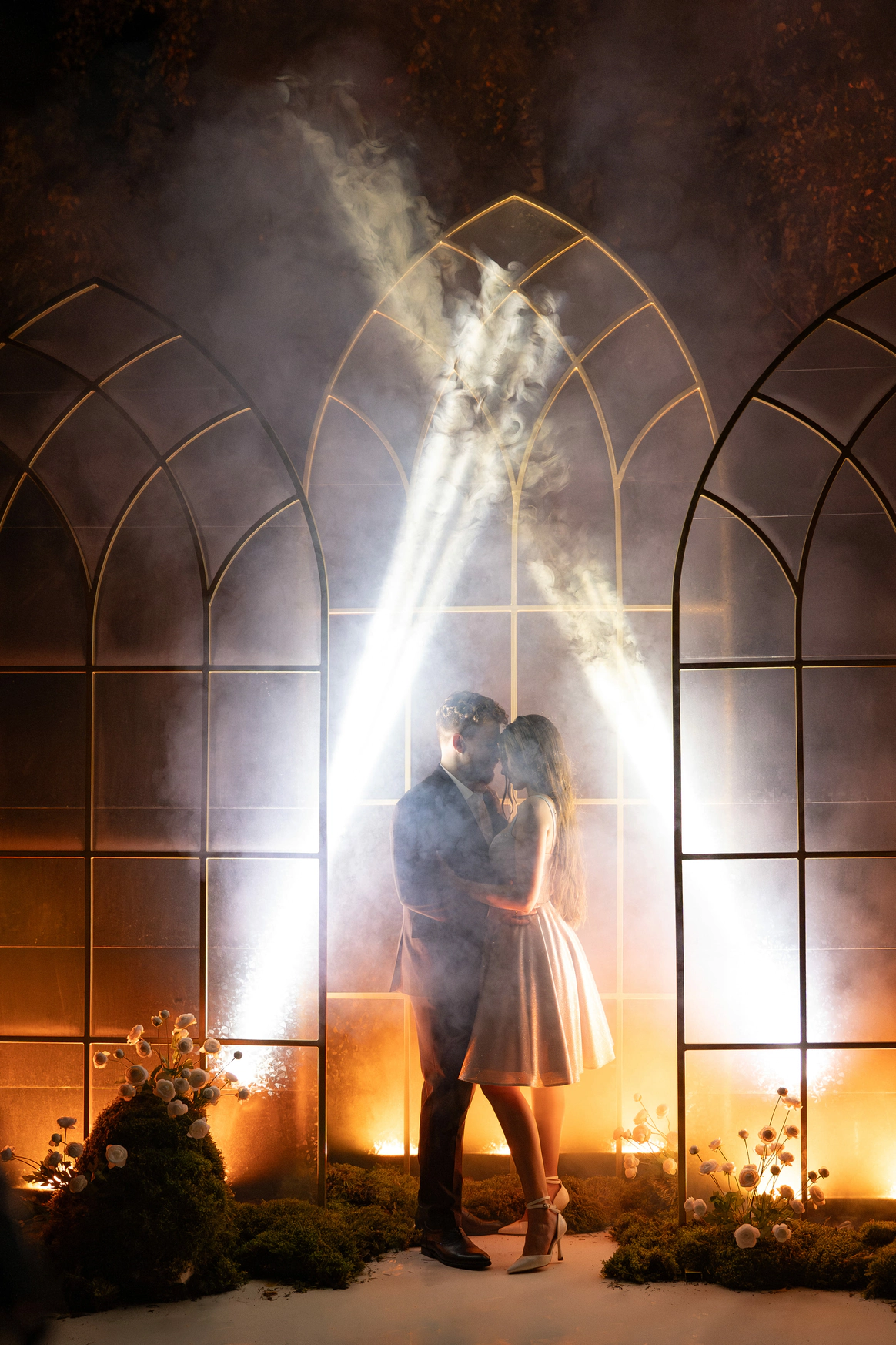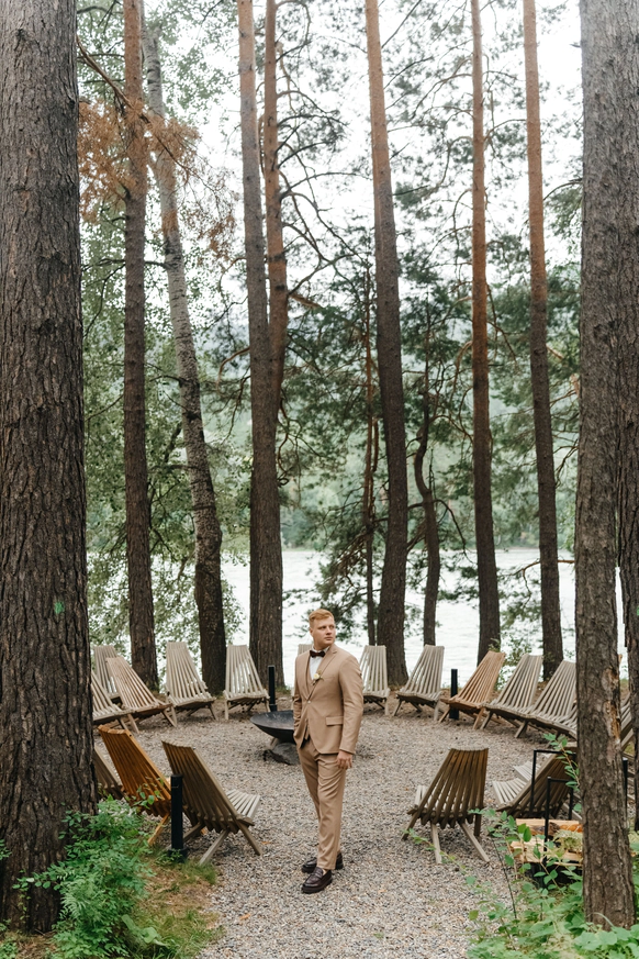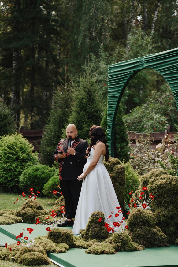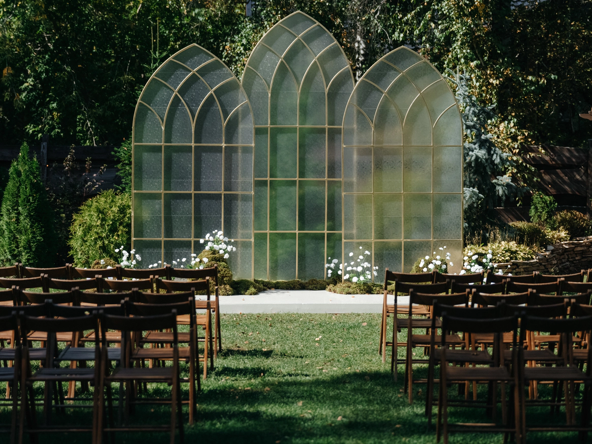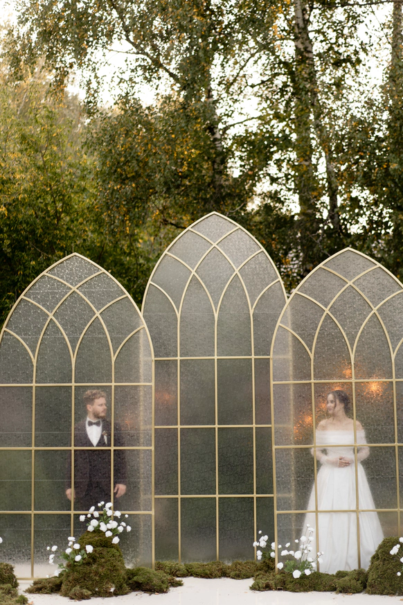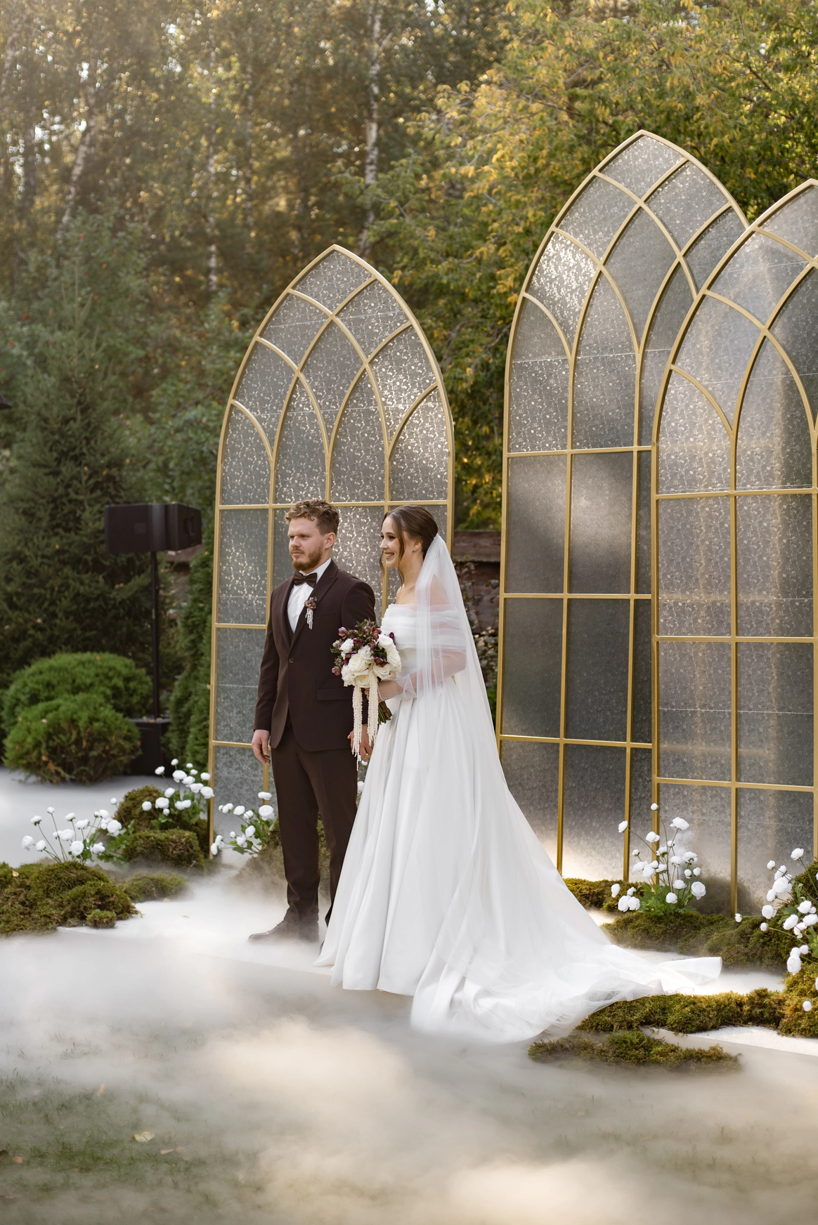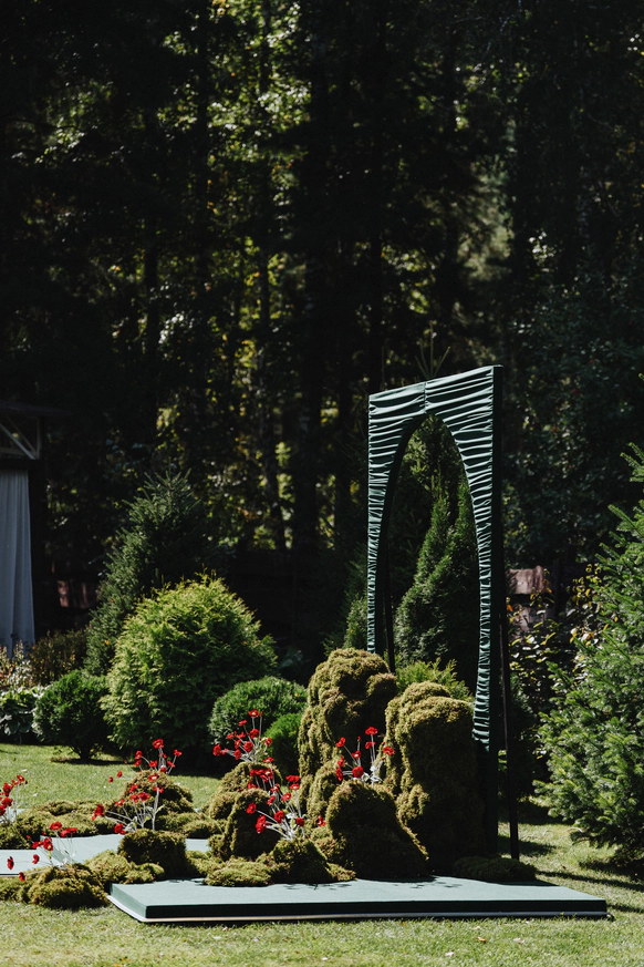 Желанием пары было создать образ церемониальной зоны, который никто не ожидает увидеть на свадьбе — без традиционных цветочных и текстильных арок.