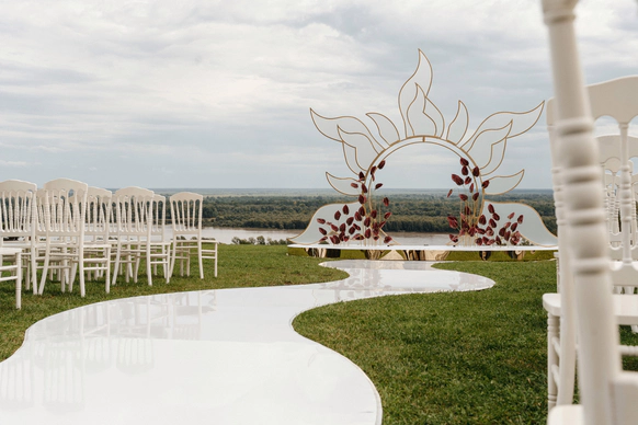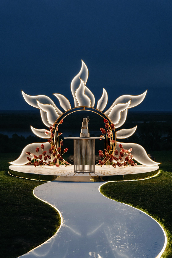 Для реализации идеи была выбрана форма солнца для зоны церемонии. Поскольку местом проведения была выбрана открытая площадка с панорамным видом, наше солнце стало неким "окошком" в будущее.