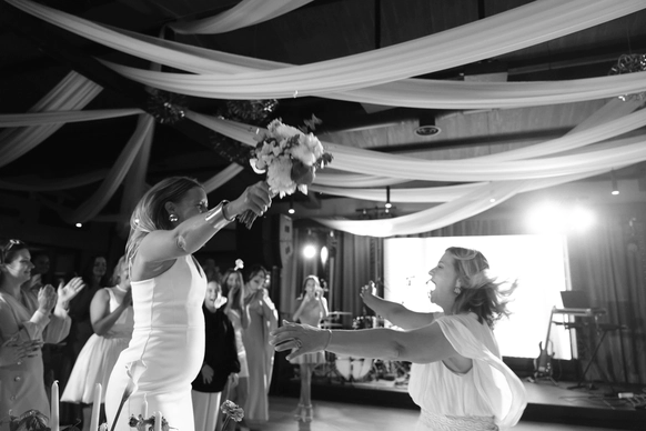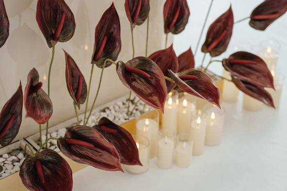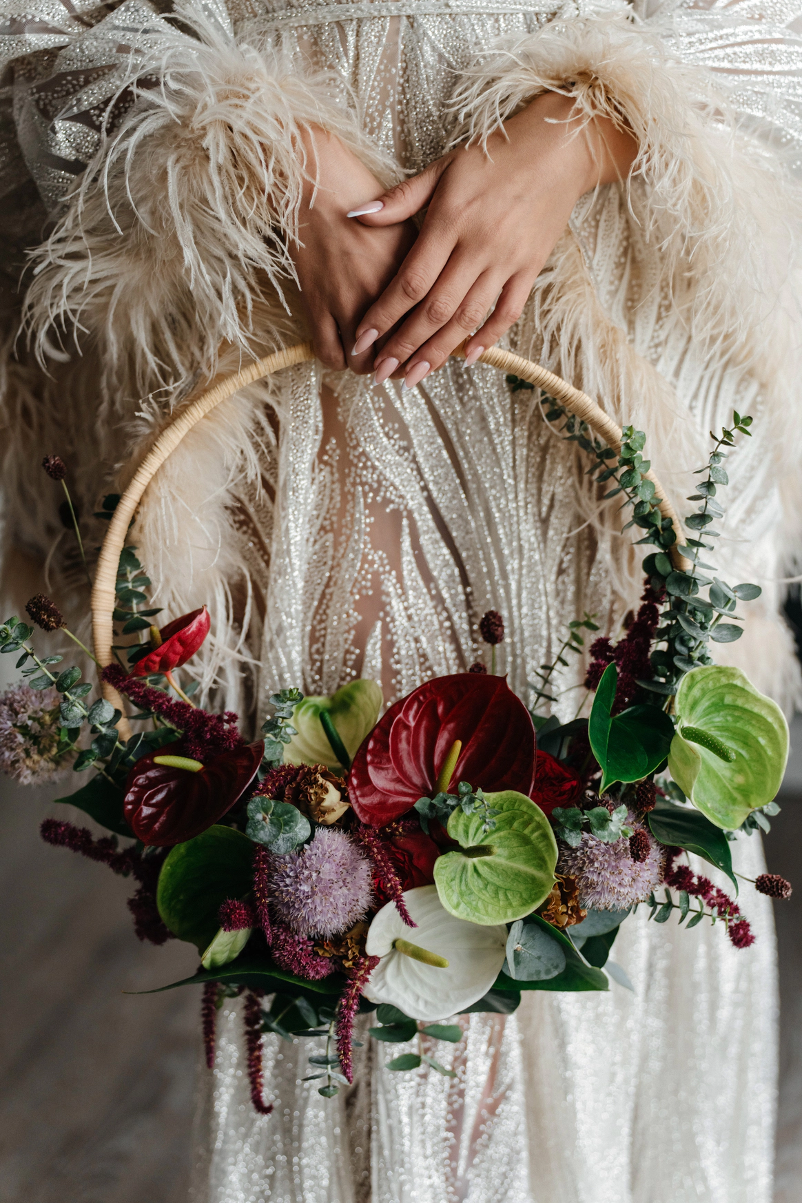 Подчеркнуть идею решили и в букете невесты, придумав сделать его в форме круга, сочетая с бордовой флористикой.
