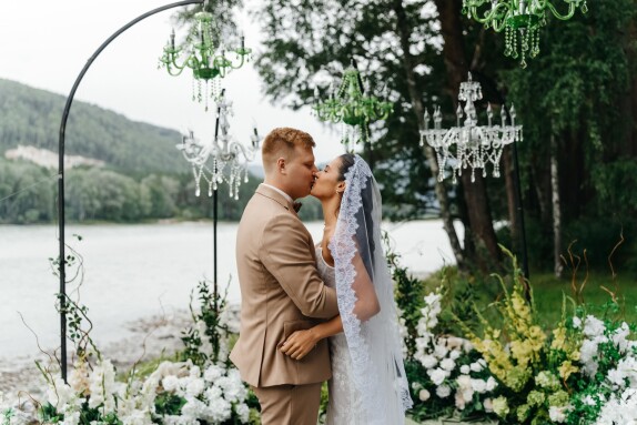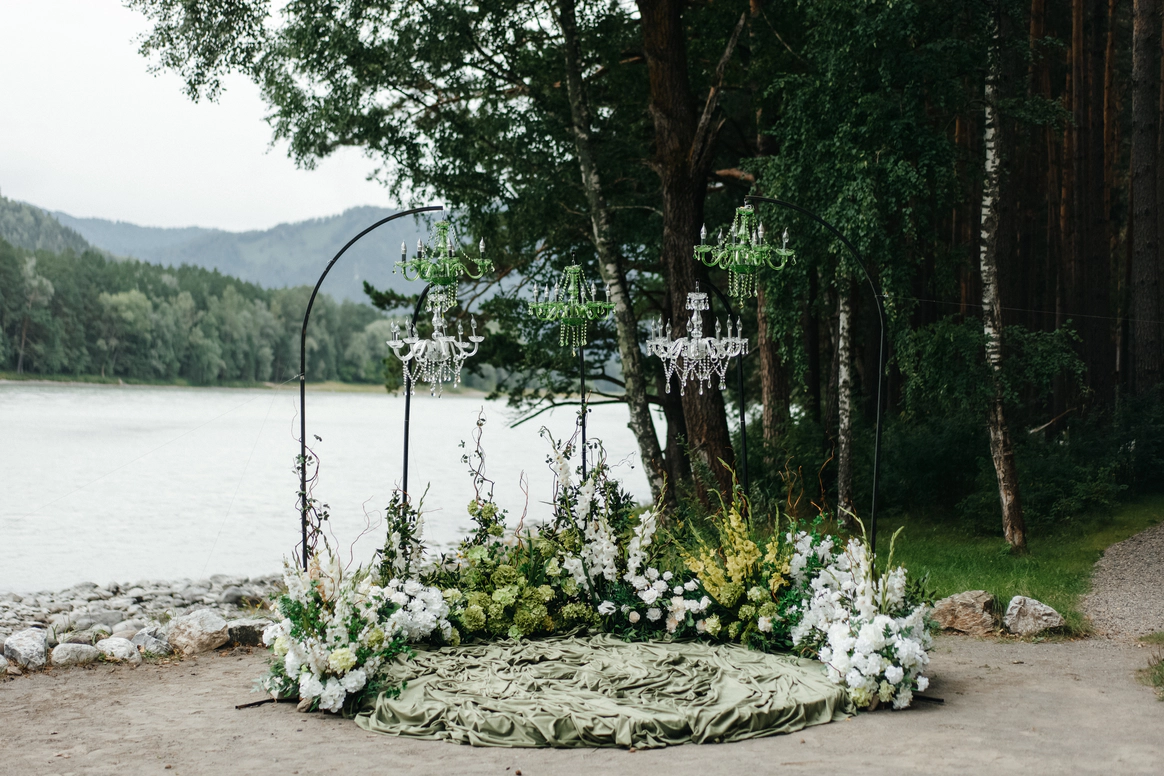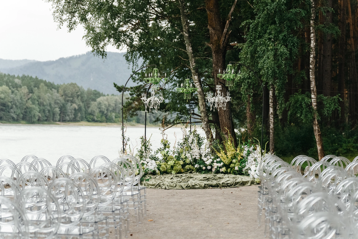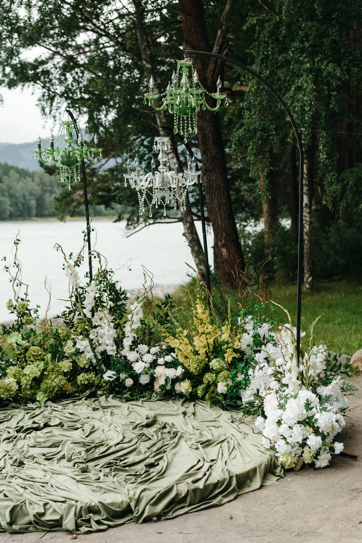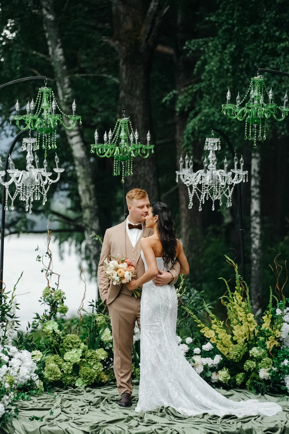 За основу была предложена цветовая палитра из нежно-розовых и зеленых оттенков, подчеркивающая игривость и легкость в паре. Чтобы реализовать мечту с люстрами в оформлении, были подобраны хрустальные люстры зеленых и розовых оттенков, разбавляя общую концепцию зоны церемонии.