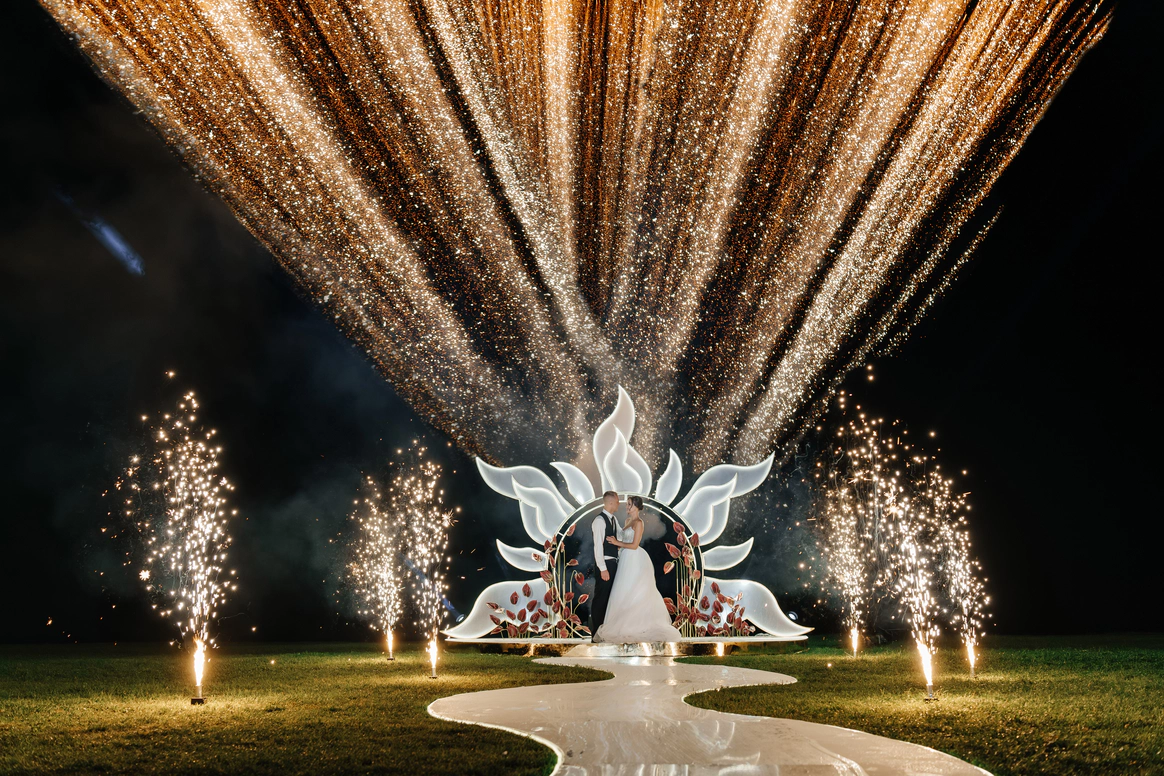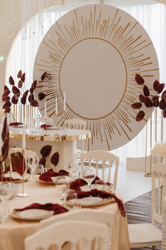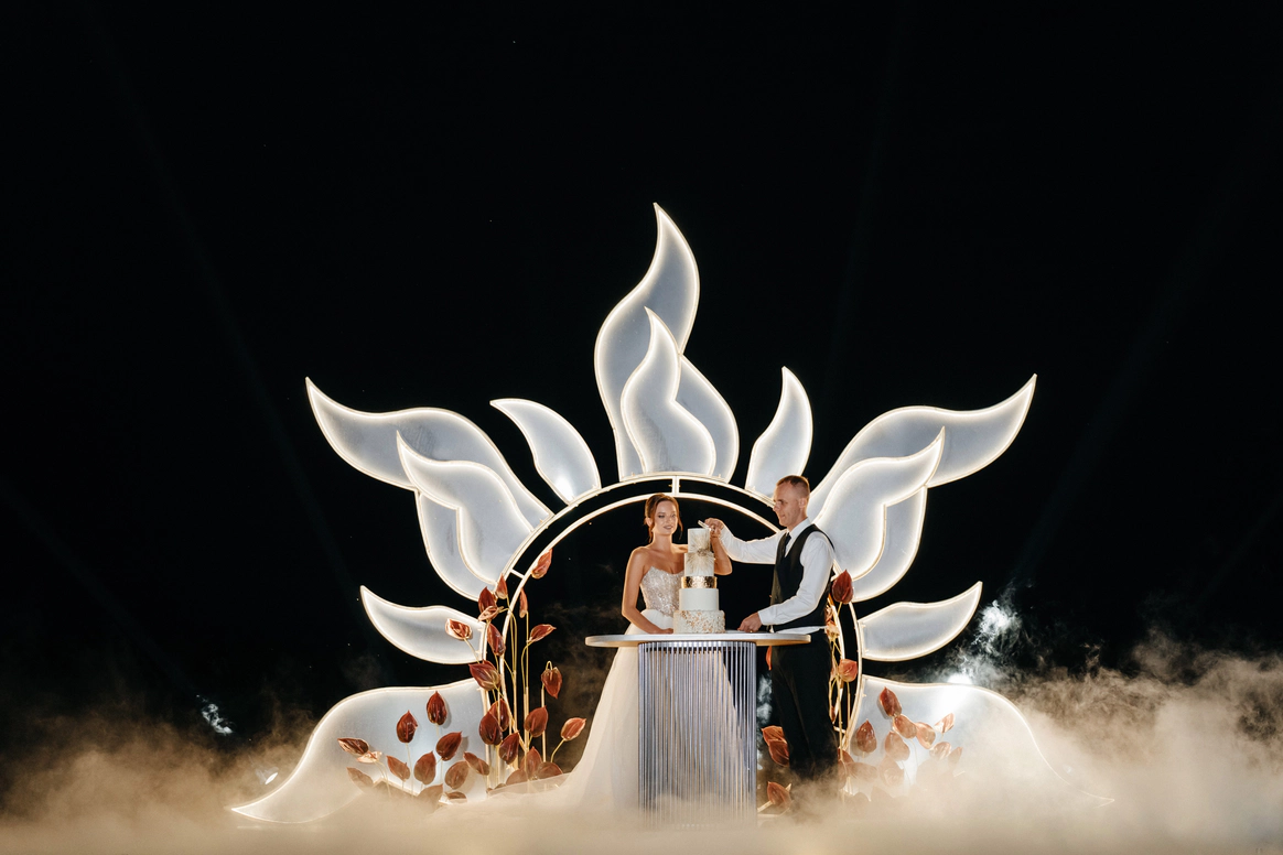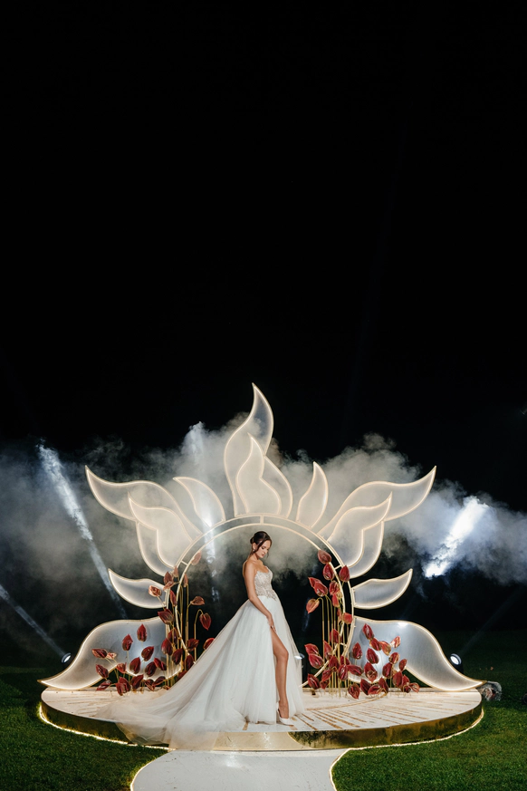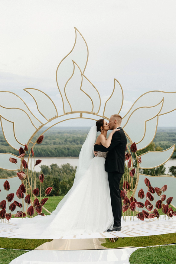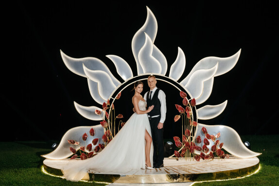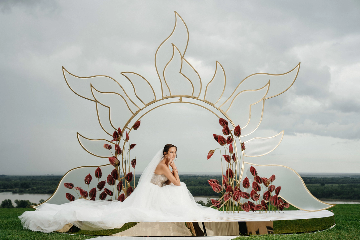 Учитывая роскошный корсет невесты, нам нужно было создать концепцию декора, который не померкнет на ее фоне, а поддержит. При этом было большое желание сохранить не классическую форму в виде солнца и минимизировать флористику.