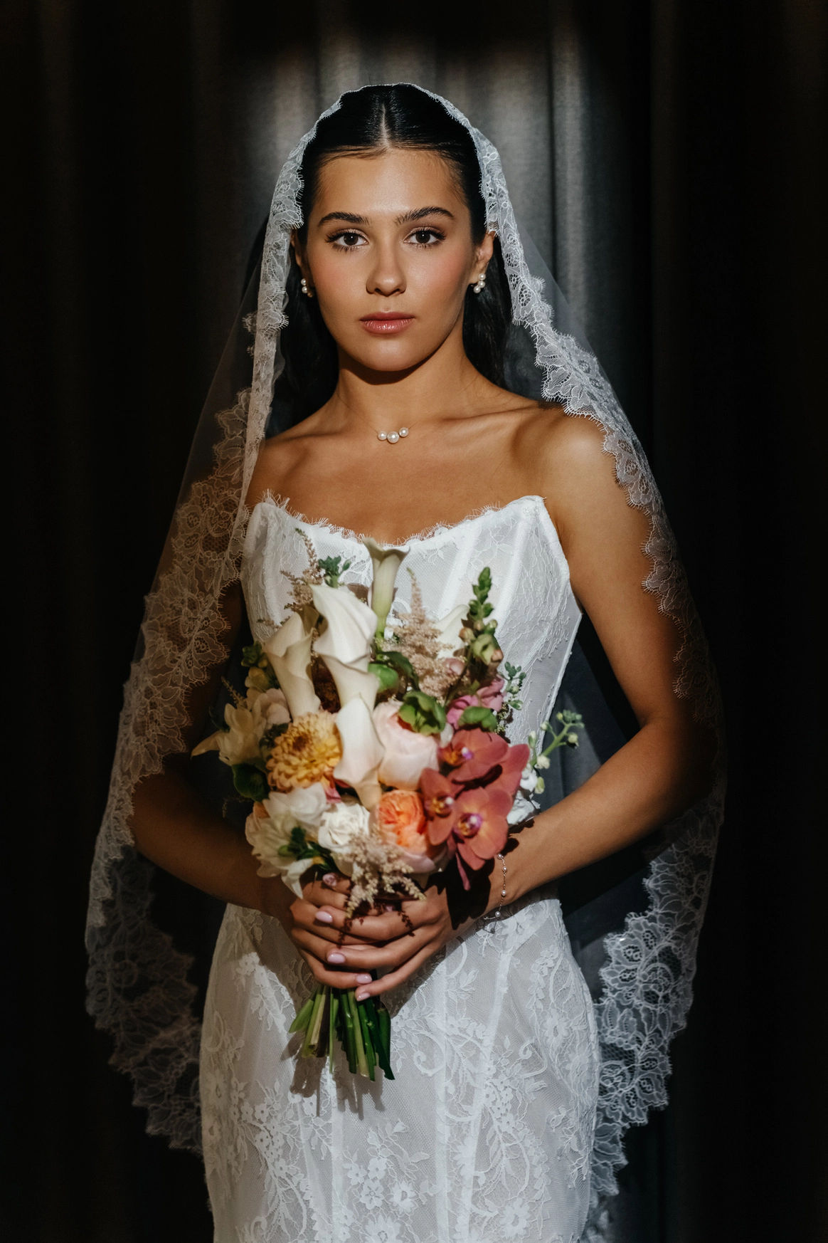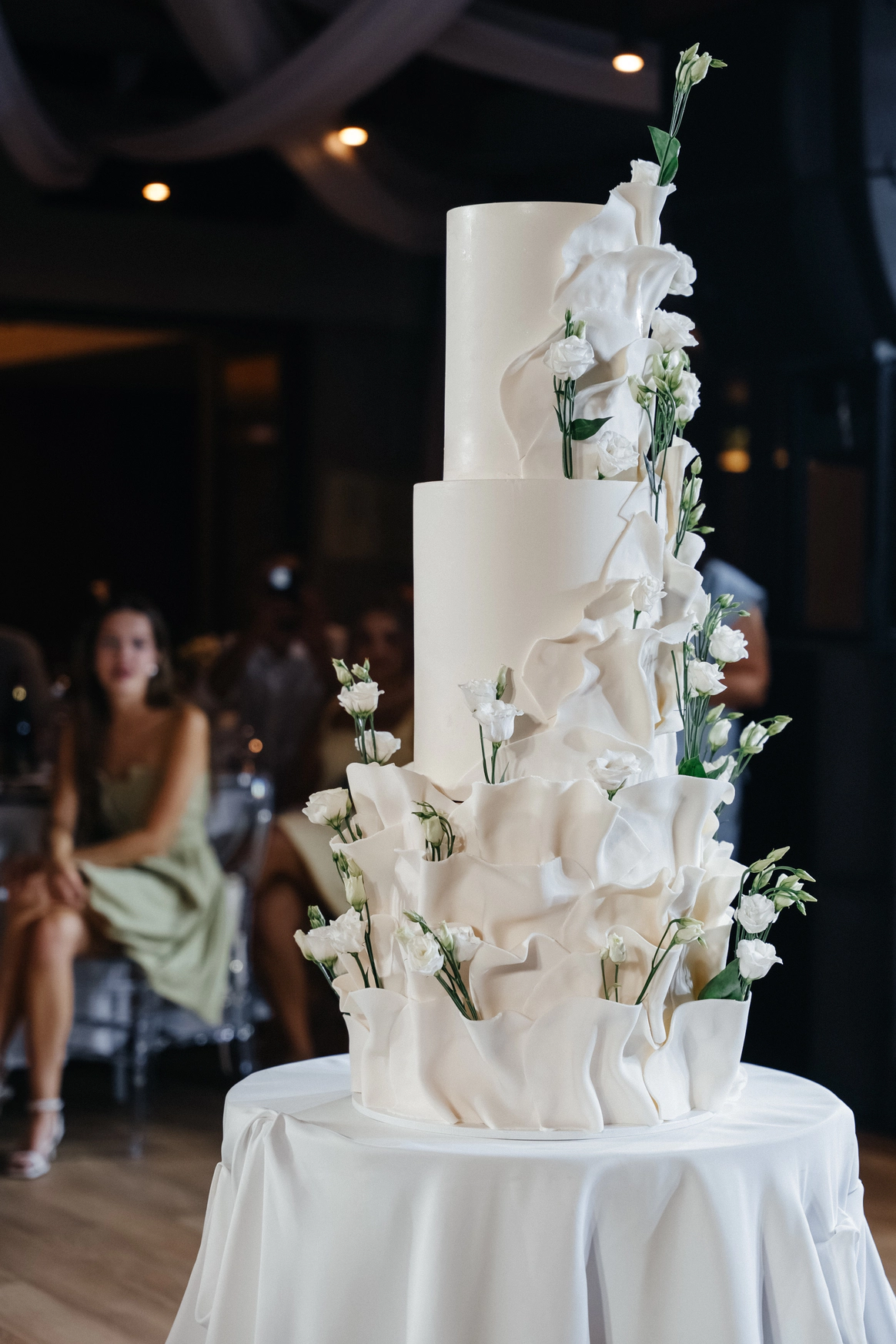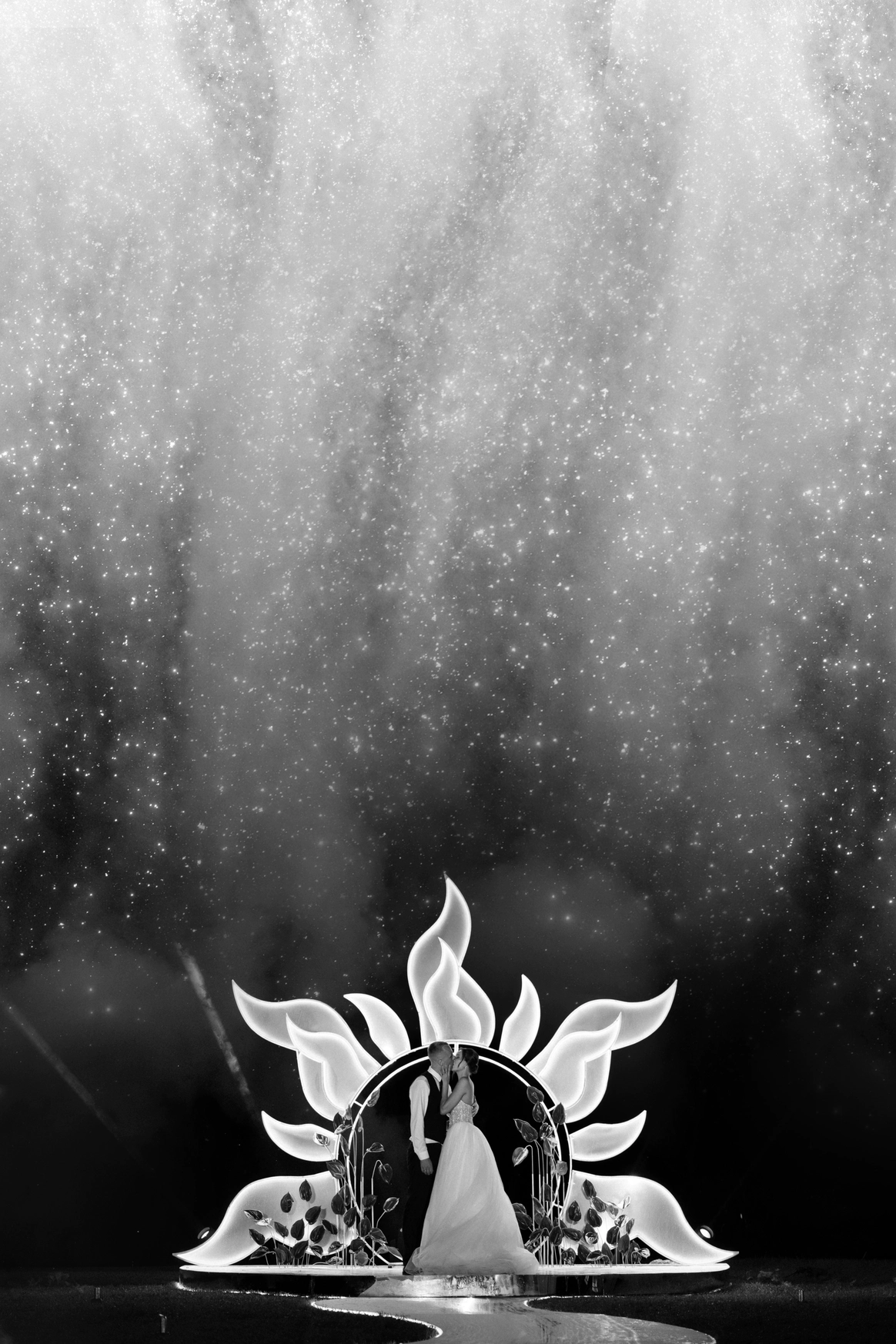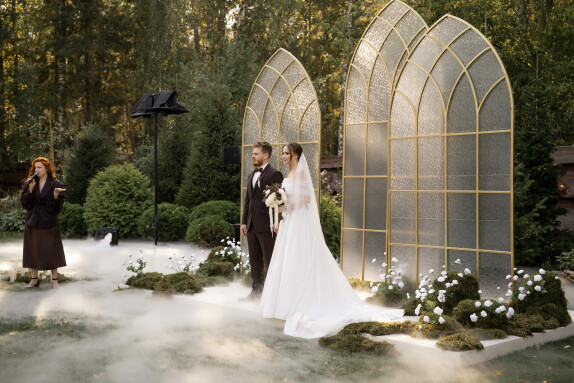 Учитывая роскошный корсет невесты, нам нужно было создать концепцию декора, который не померкнет на ее фоне, а поддержит. При этом было большое желание сохранить не классическую форму в виде солнца и минимизировать флористику.