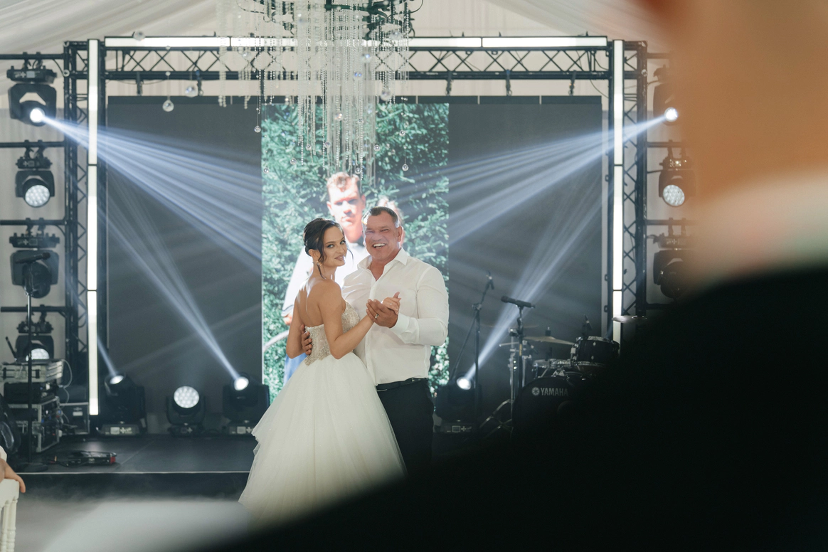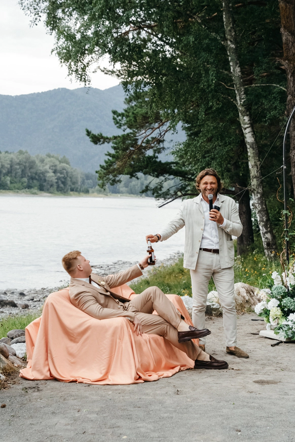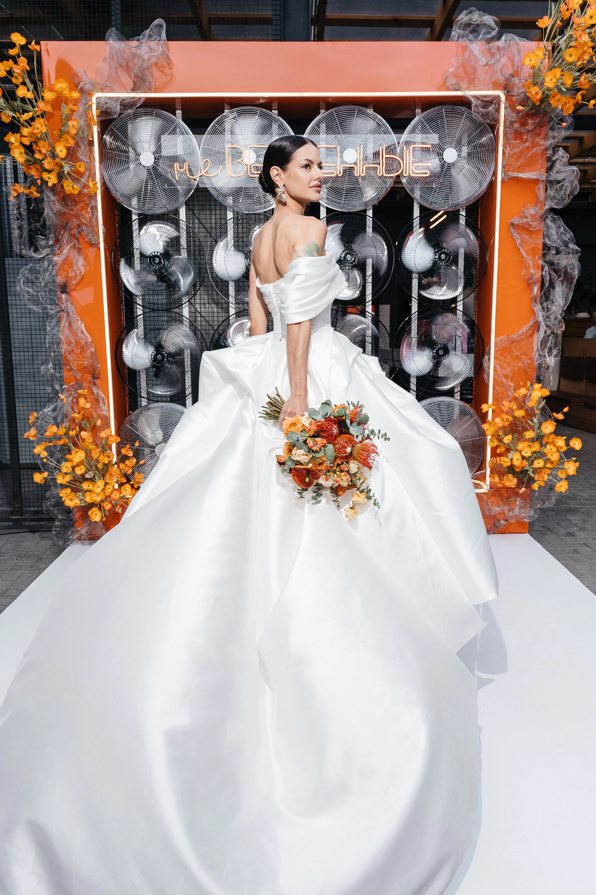 В большинстве деталей мы использовали персонализированные элементы из отношений Егора и Снежаны. Например, Егор очень любит лежать на диване после тяжелого рабочего дня. Мы решили поставить надувной диван в оранжевой драпировке прямо на церемонии. Во время выхода жениха Егор не вставал в центр, как это принято обычно, а присаживался на диван и общался с ведущим, тем самым попадая в комфортные обстоятельства. Почему оранжевый? Потому что это любимый цвет Егора, и он очень хотел хоть в чем-то его увидеть.