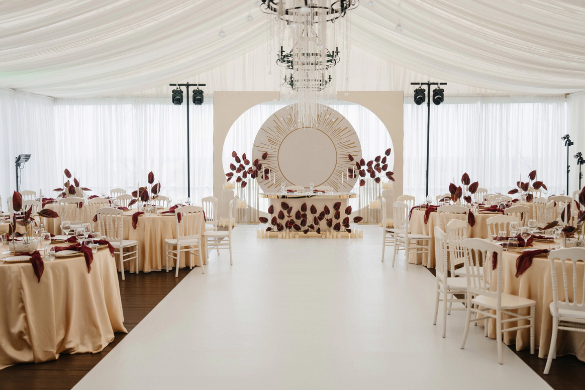 Зал для банкетной части прямоугольной формы и достаточно узкий. Нам предстояло добавить туда простора за счет текстиля, чтобы визуально его расширить и сделать более легким.