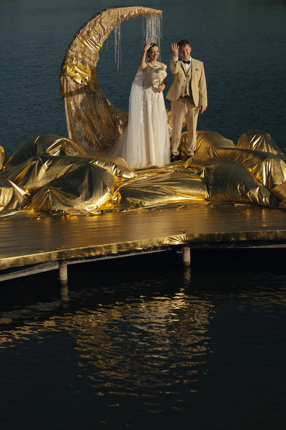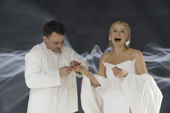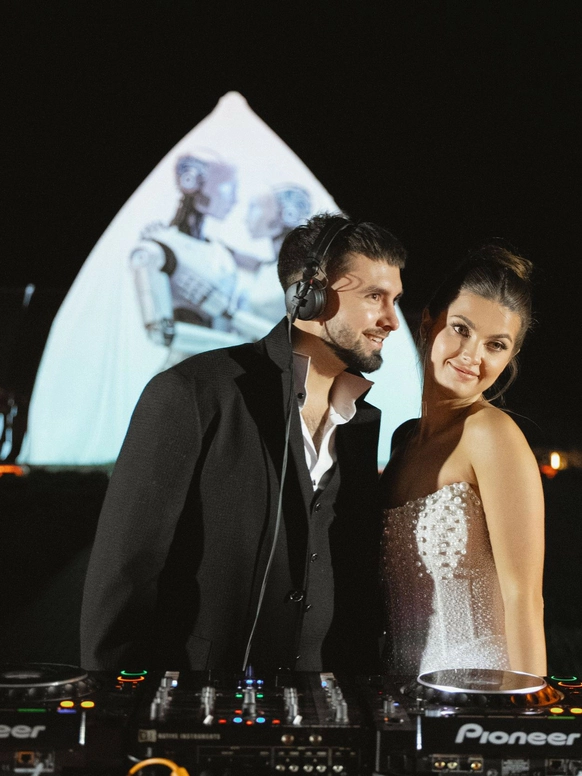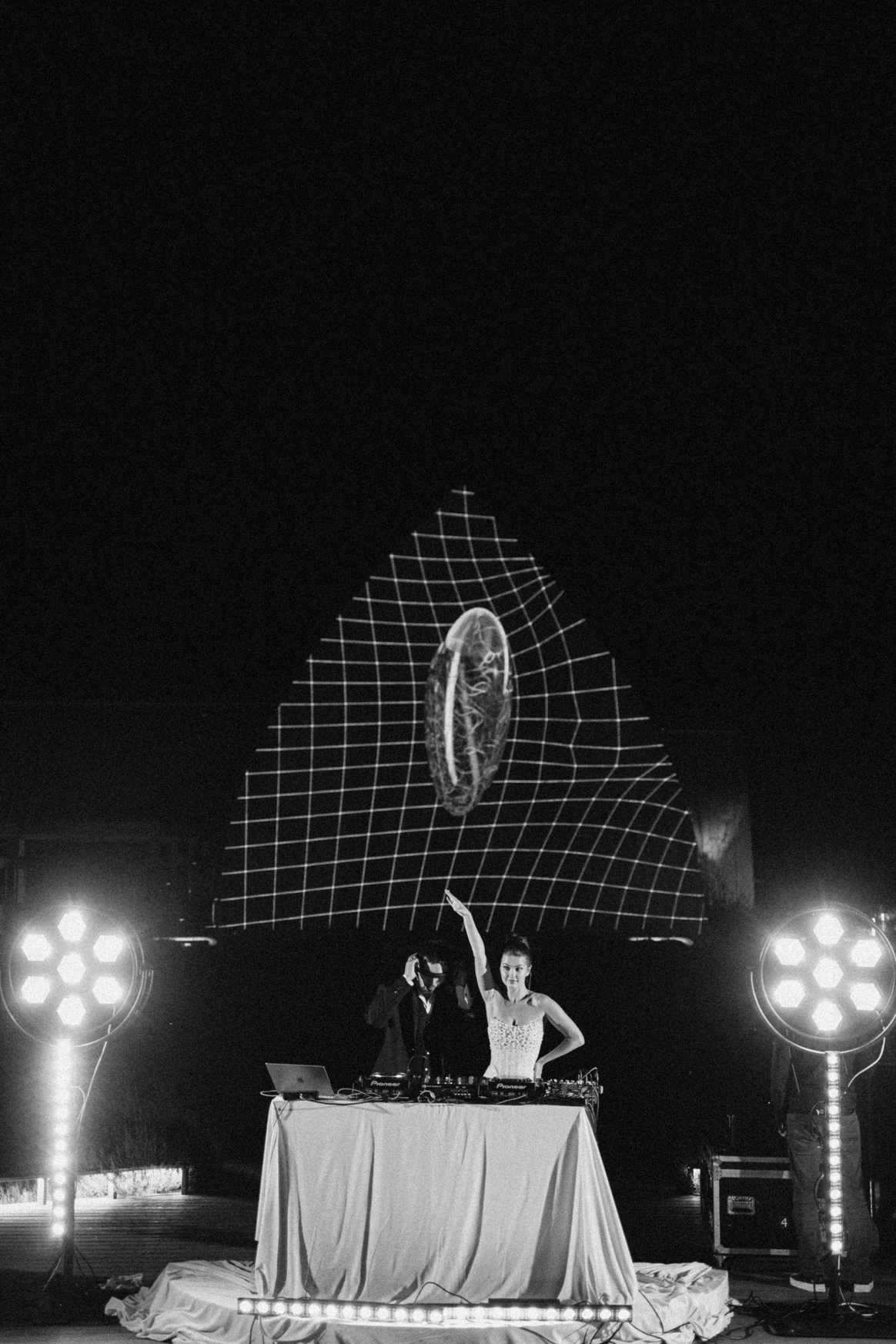 Здание превратилось в полноценный медиа-фасад и вспыхнуло за счёт 3D-меппинга. Начался музыкальный сет приглашённого DJ, а затем — DJ-перформанс молодожёнов. Давид и Кристина специально учились сводить треки и готовили сет как сюрприз для гостей.