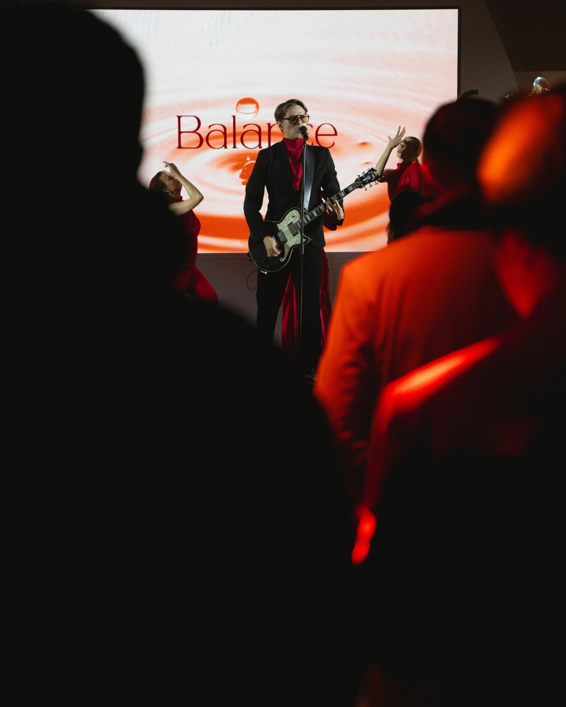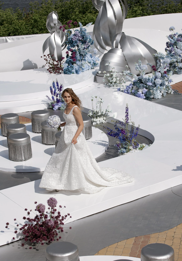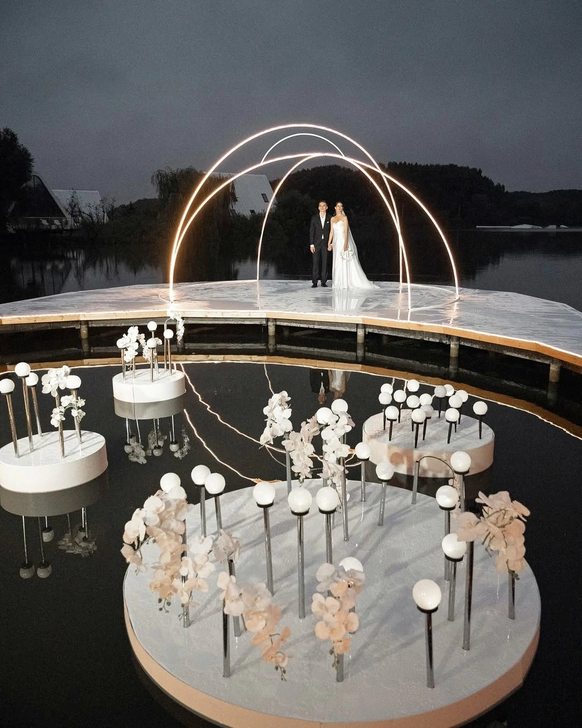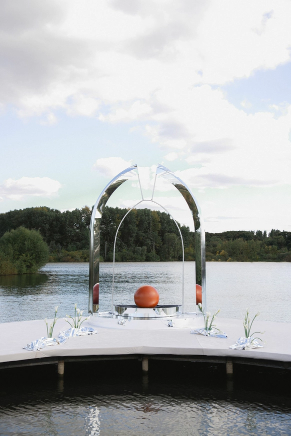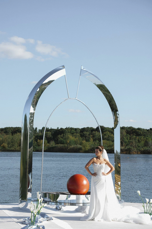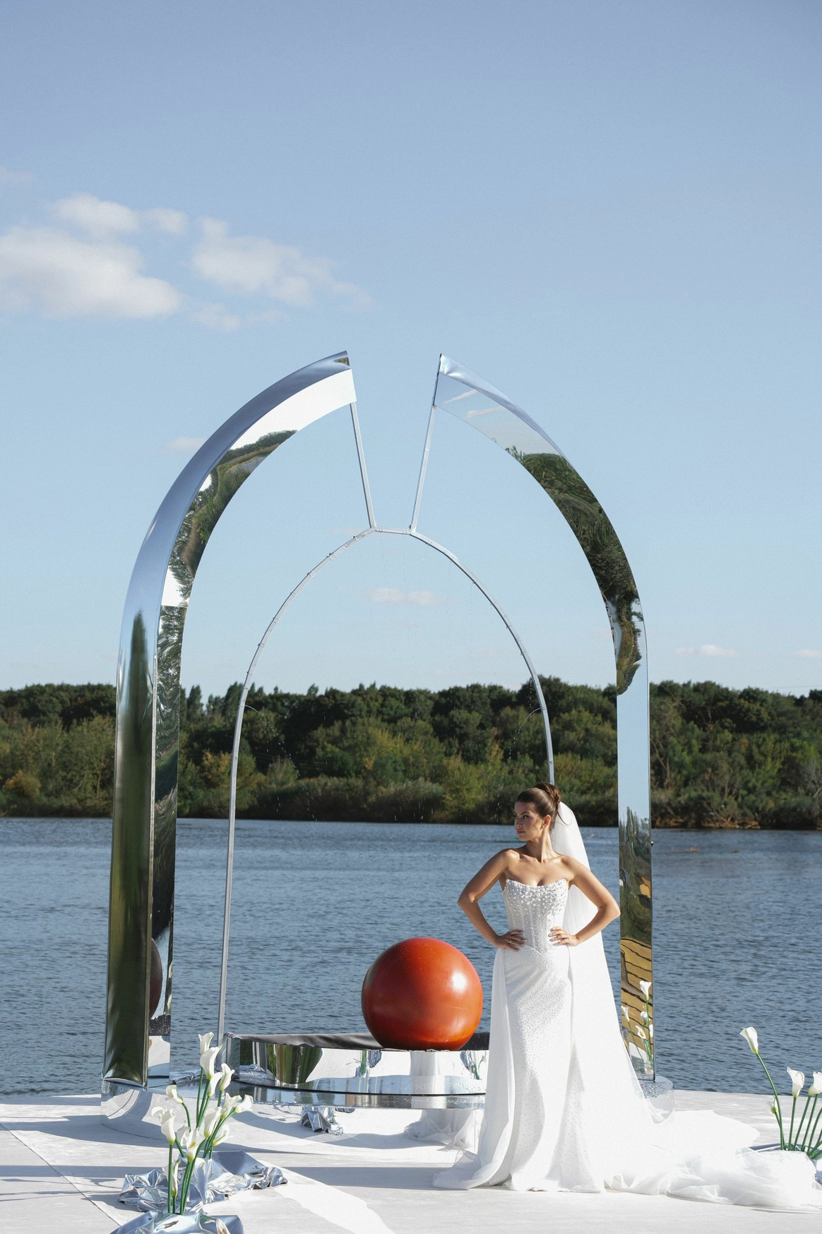 Зоной церемонии стала футуристичная арка со встроенным водопадом и бассейном на подиуме — инженерный арт-объект, раскрывающий концепцию баланса.