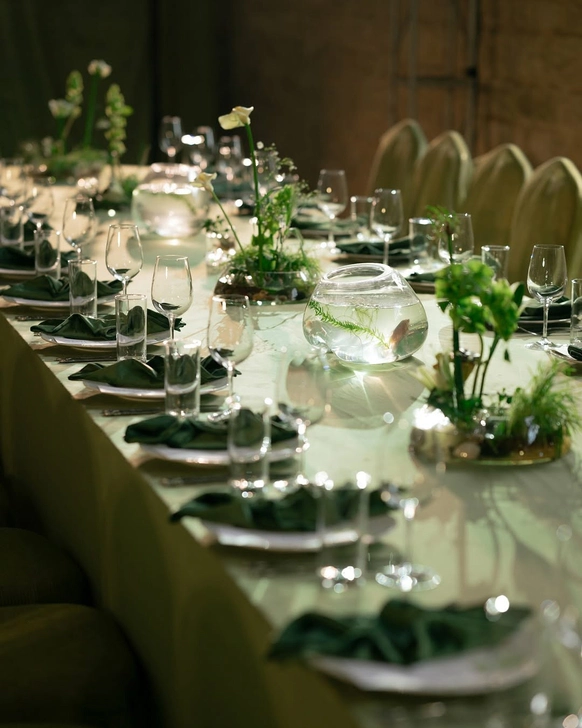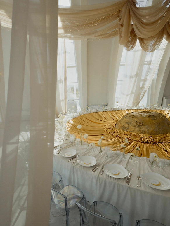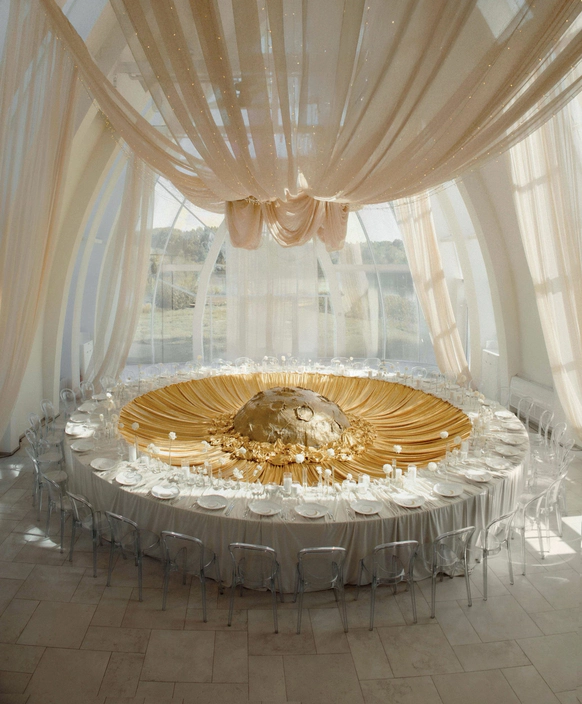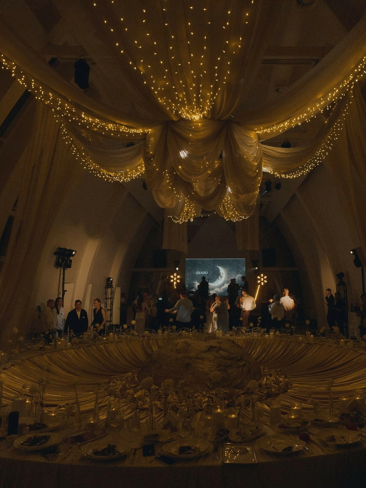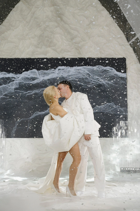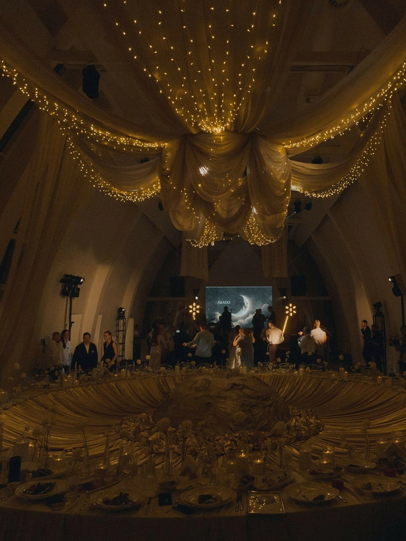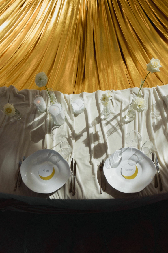 Мы хотели выйти за пределы привычных свадебных форм: прозрачные элементы, фактуры меха и льда, инсталляции, играющие светом на лёгких тканях. Отказались от текстиля на столах в пользу крафтовой бумаги.