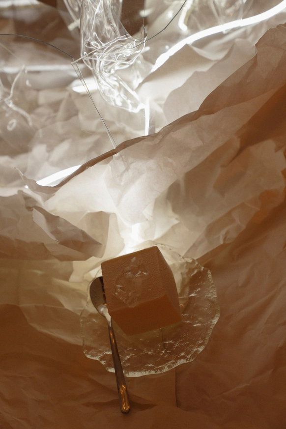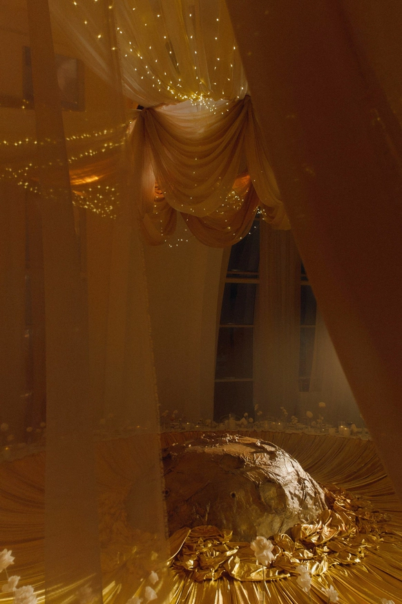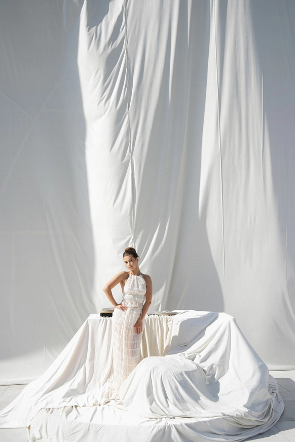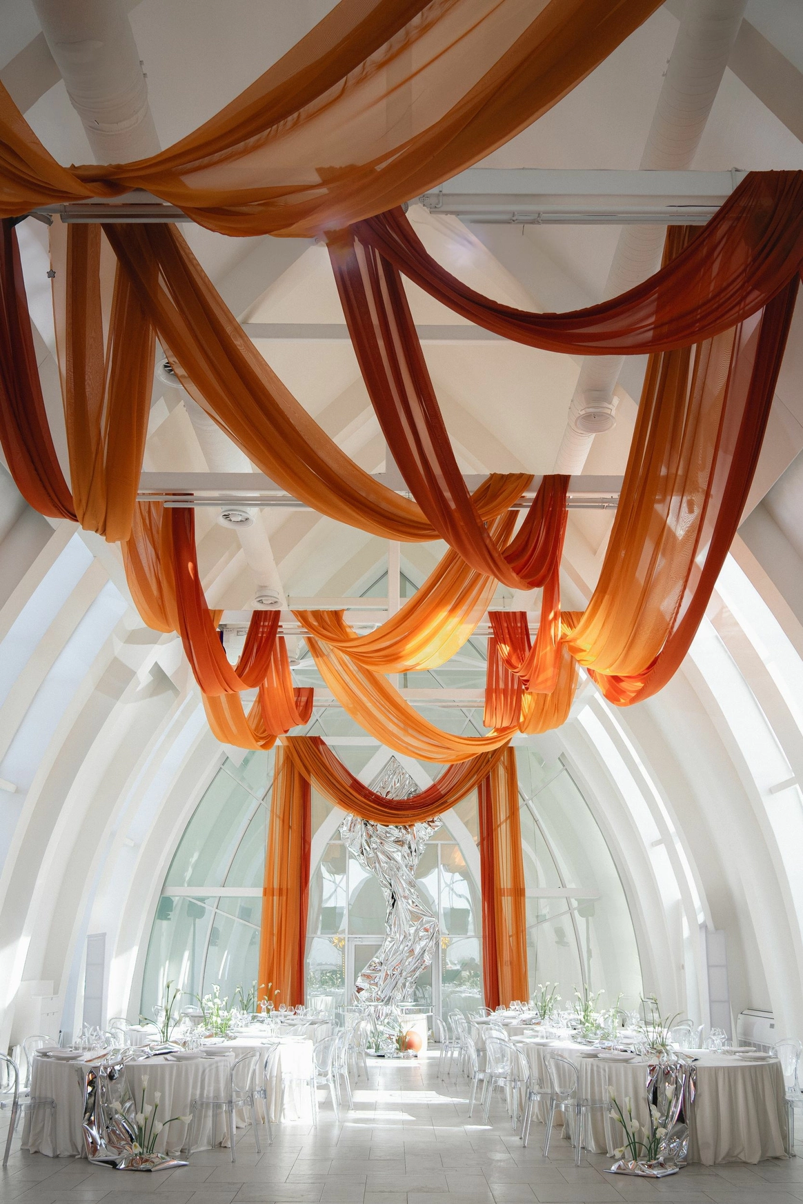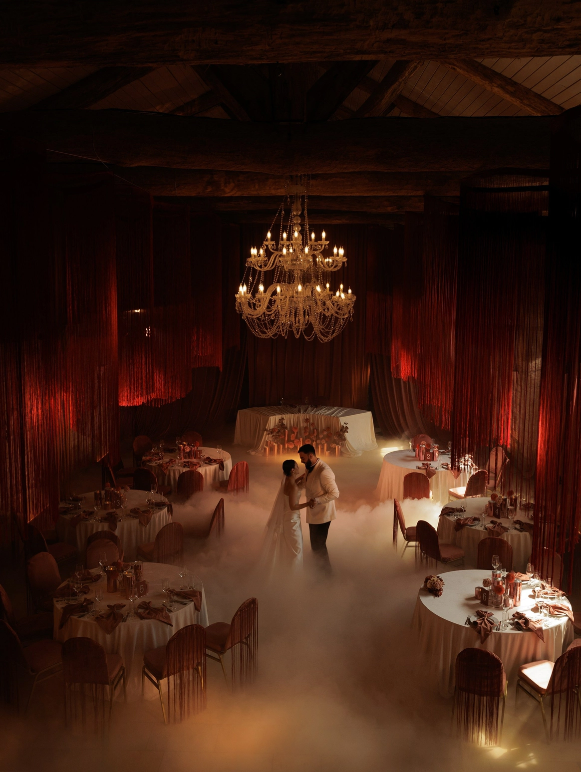 Мы хотели выйти за пределы привычных свадебных форм: прозрачные элементы, фактуры меха и льда, инсталляции, играющие светом на лёгких тканях. Отказались от текстиля на столах в пользу крафтовой бумаги.