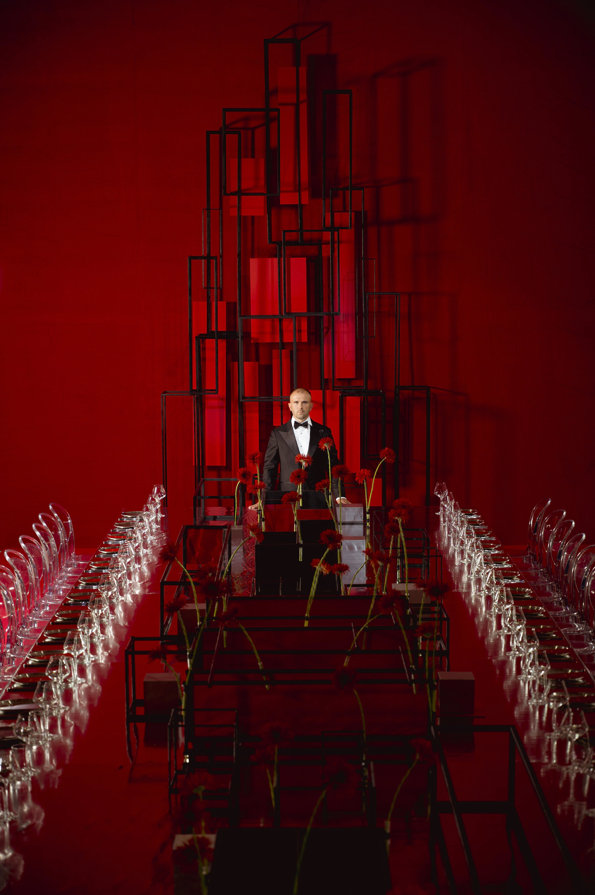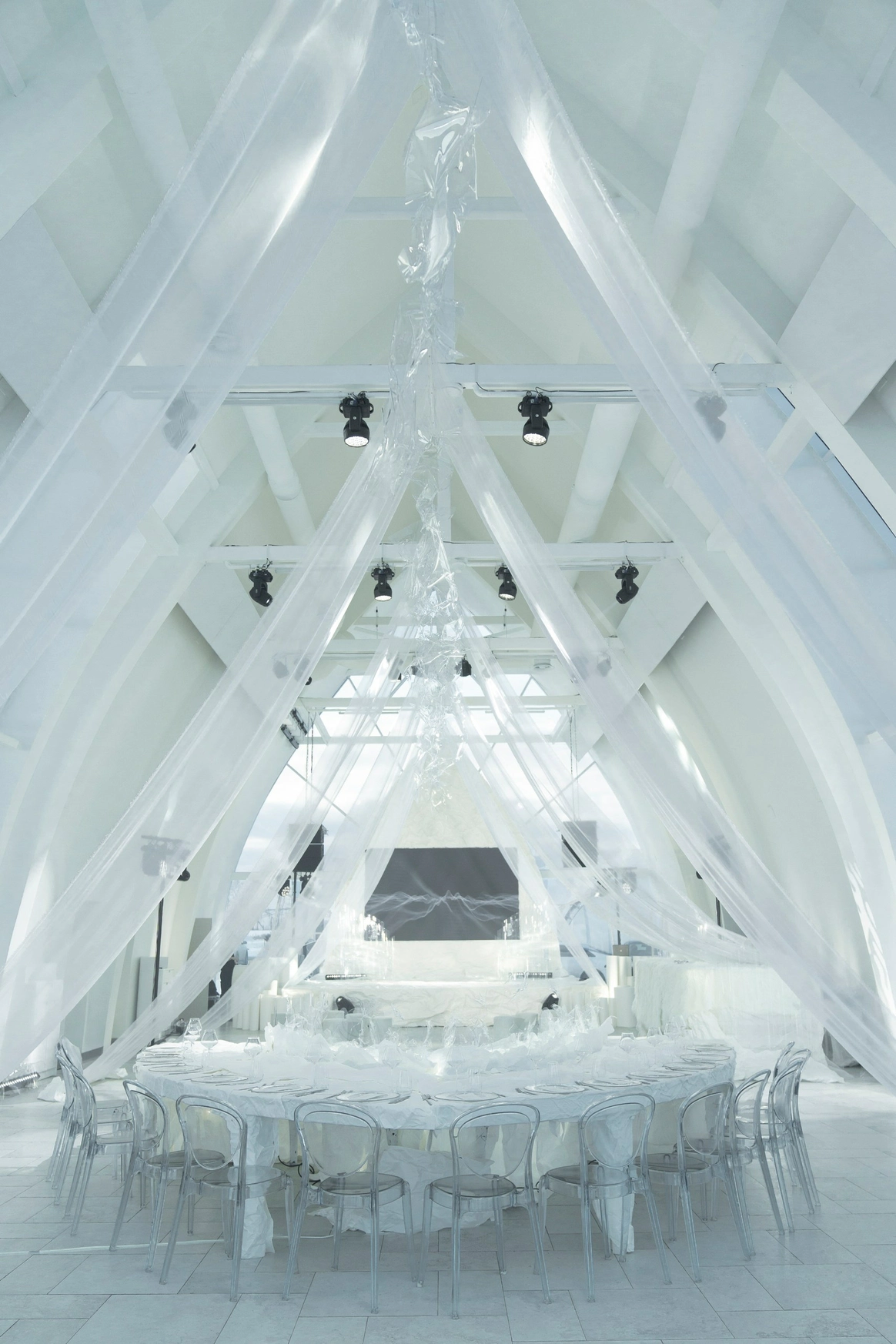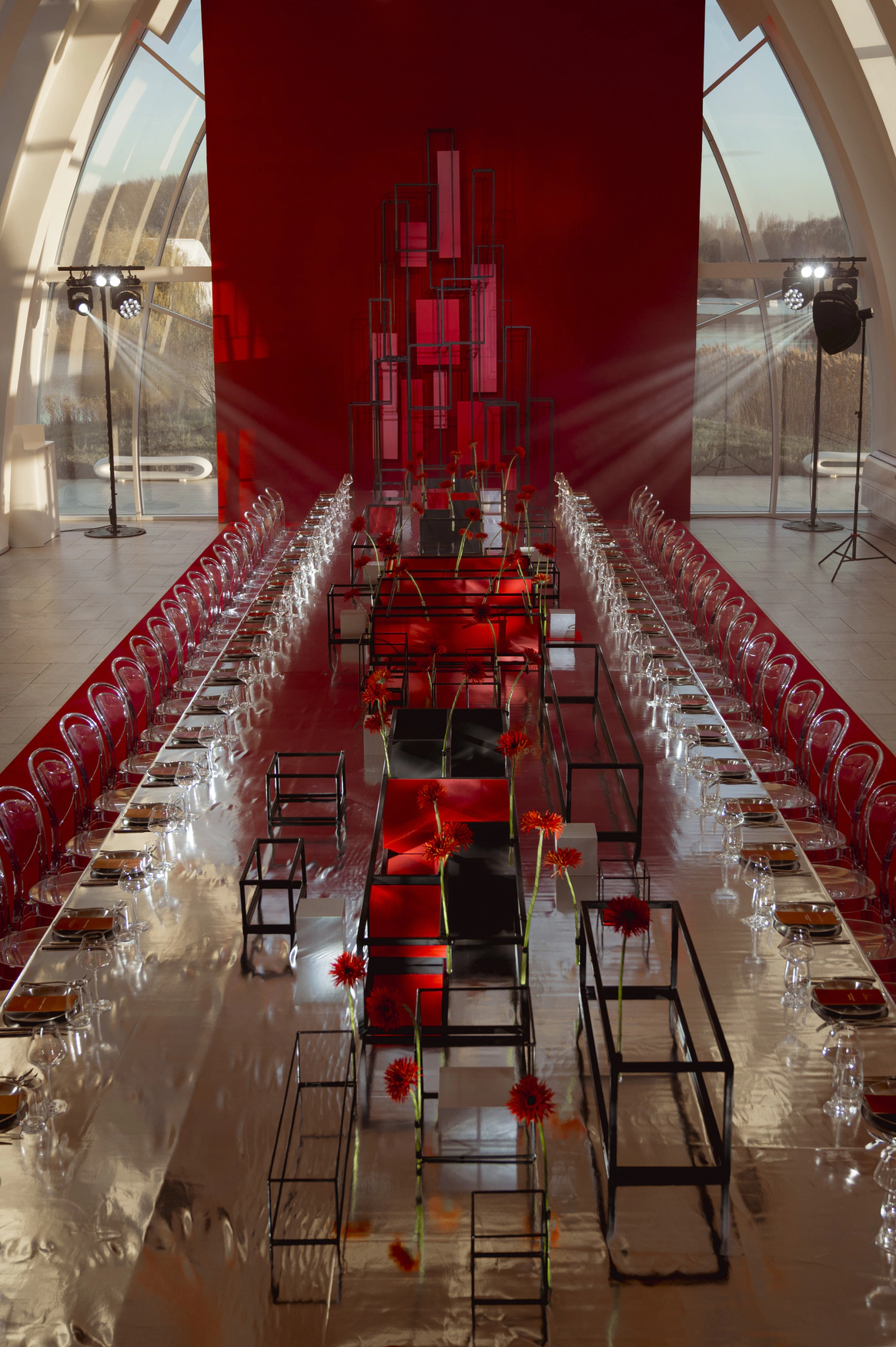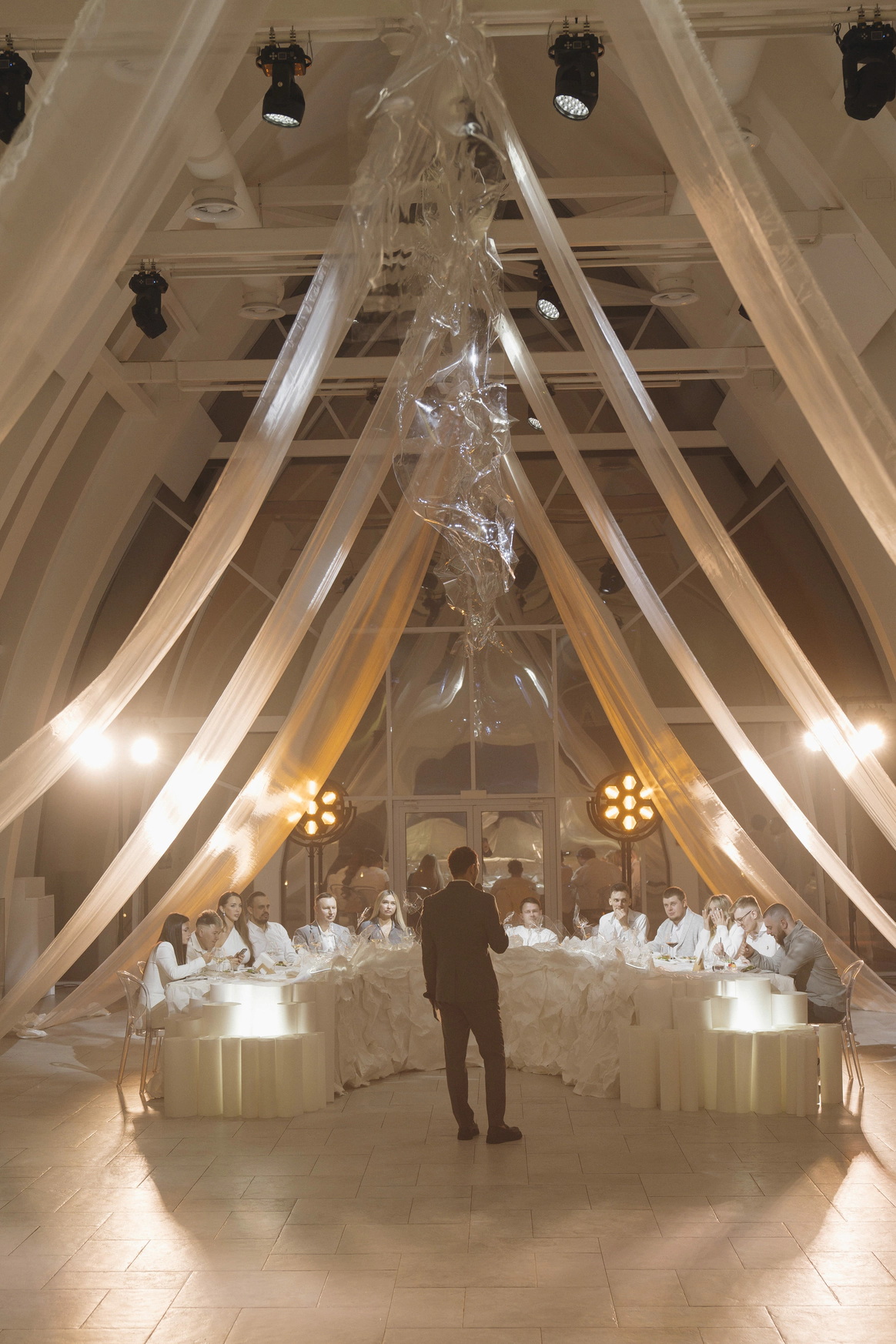 Декор стола состоит из прозрачных «цветов», которые никогда не завянут. Тканевые полотна зрительно сужали зал и отражали разные световые сценарии. Созданные из пэт-материалов люстры, как льдины свисали с потолка.