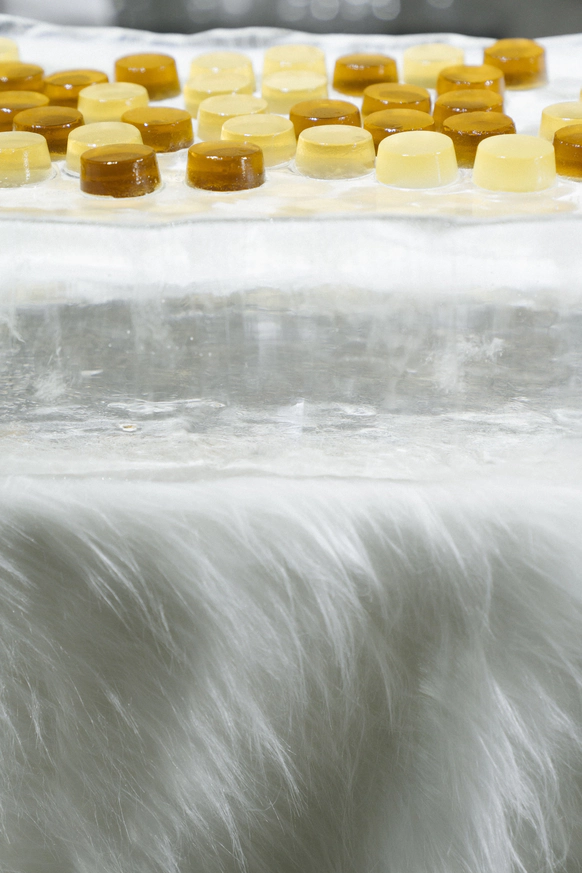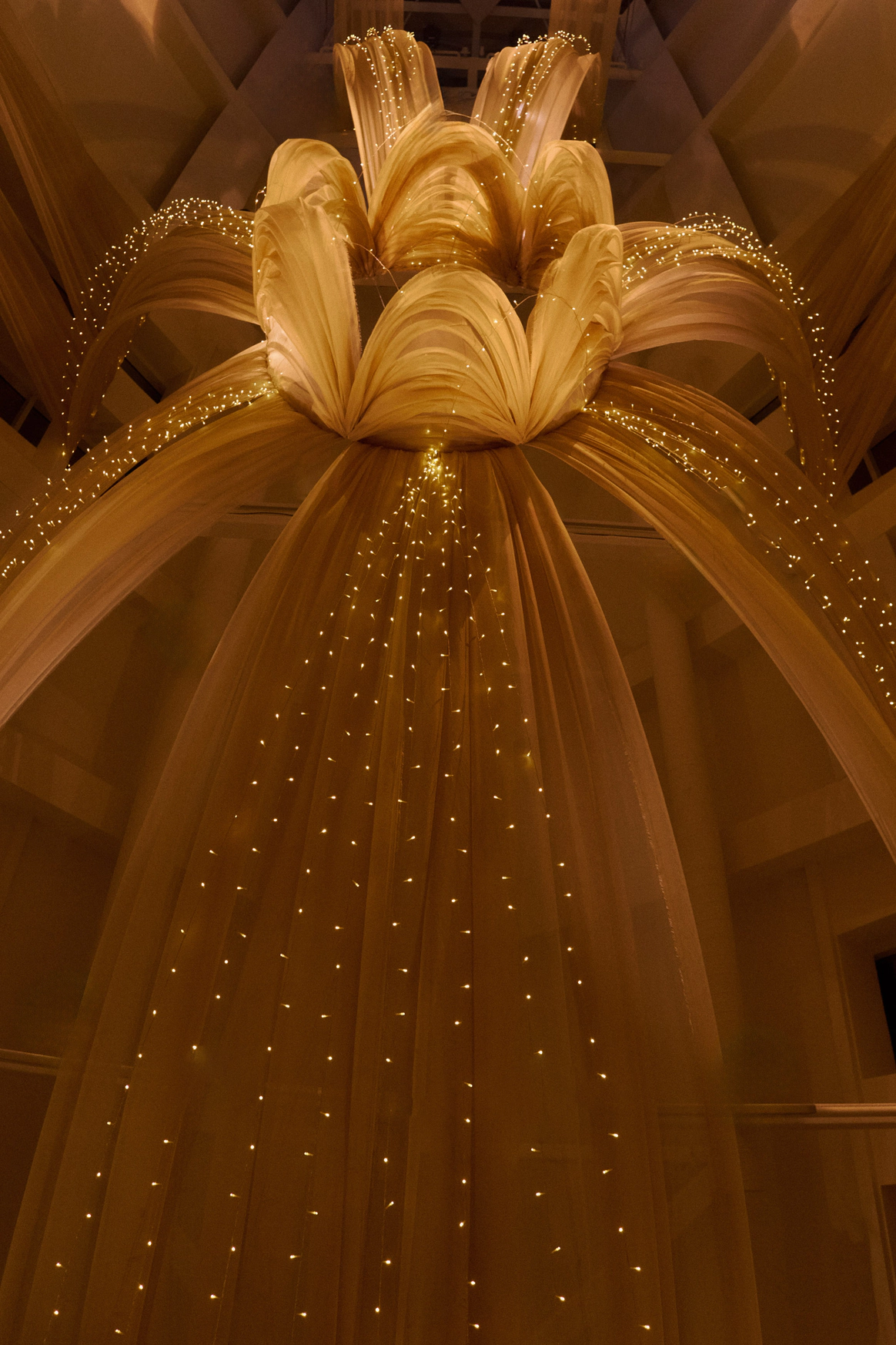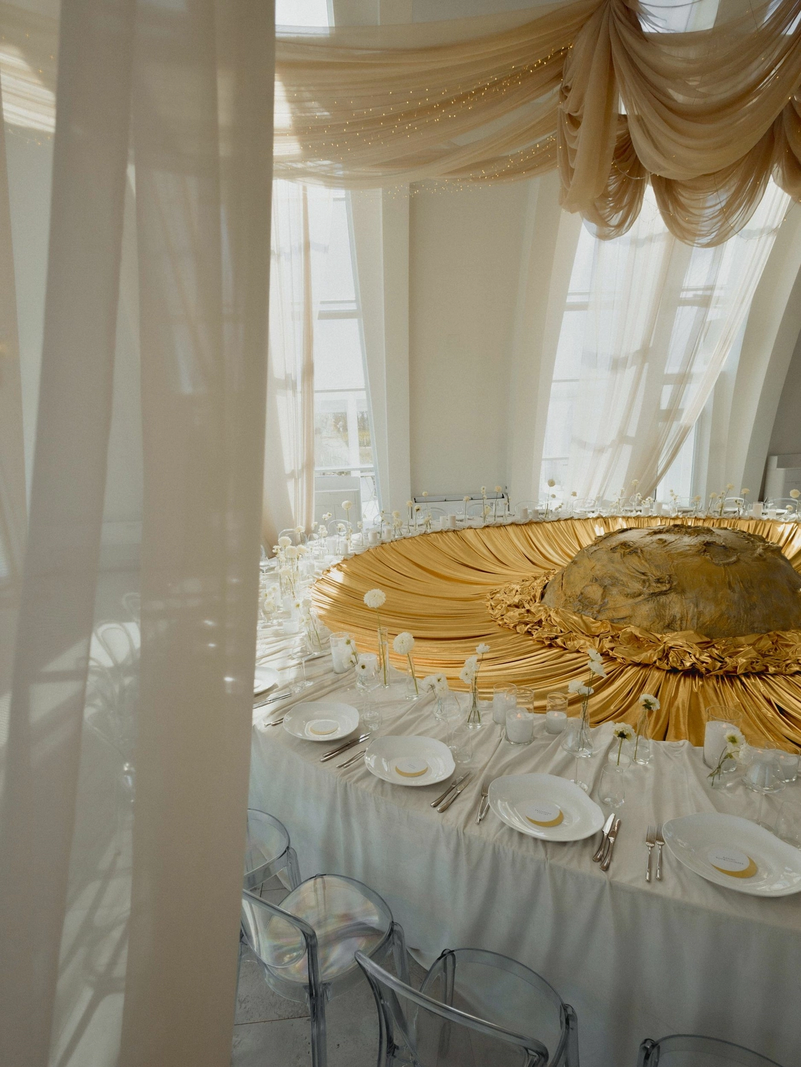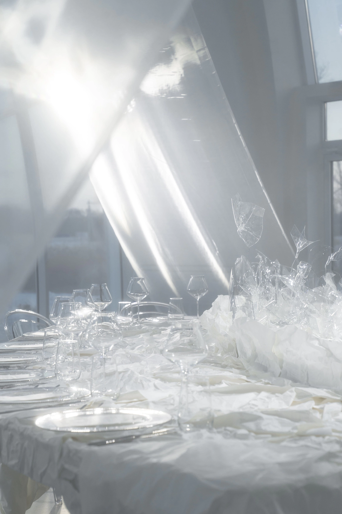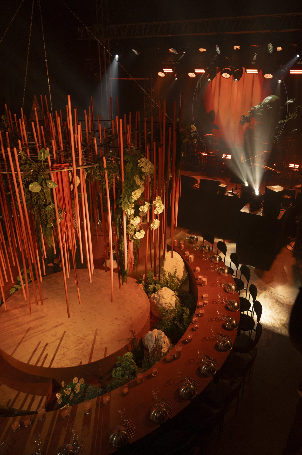 Декор стола состоит из прозрачных «цветов», которые никогда не завянут. Тканевые полотна зрительно сужали зал и отражали разные световые сценарии. Созданные из пэт-материалов люстры, как льдины свисали с потолка.