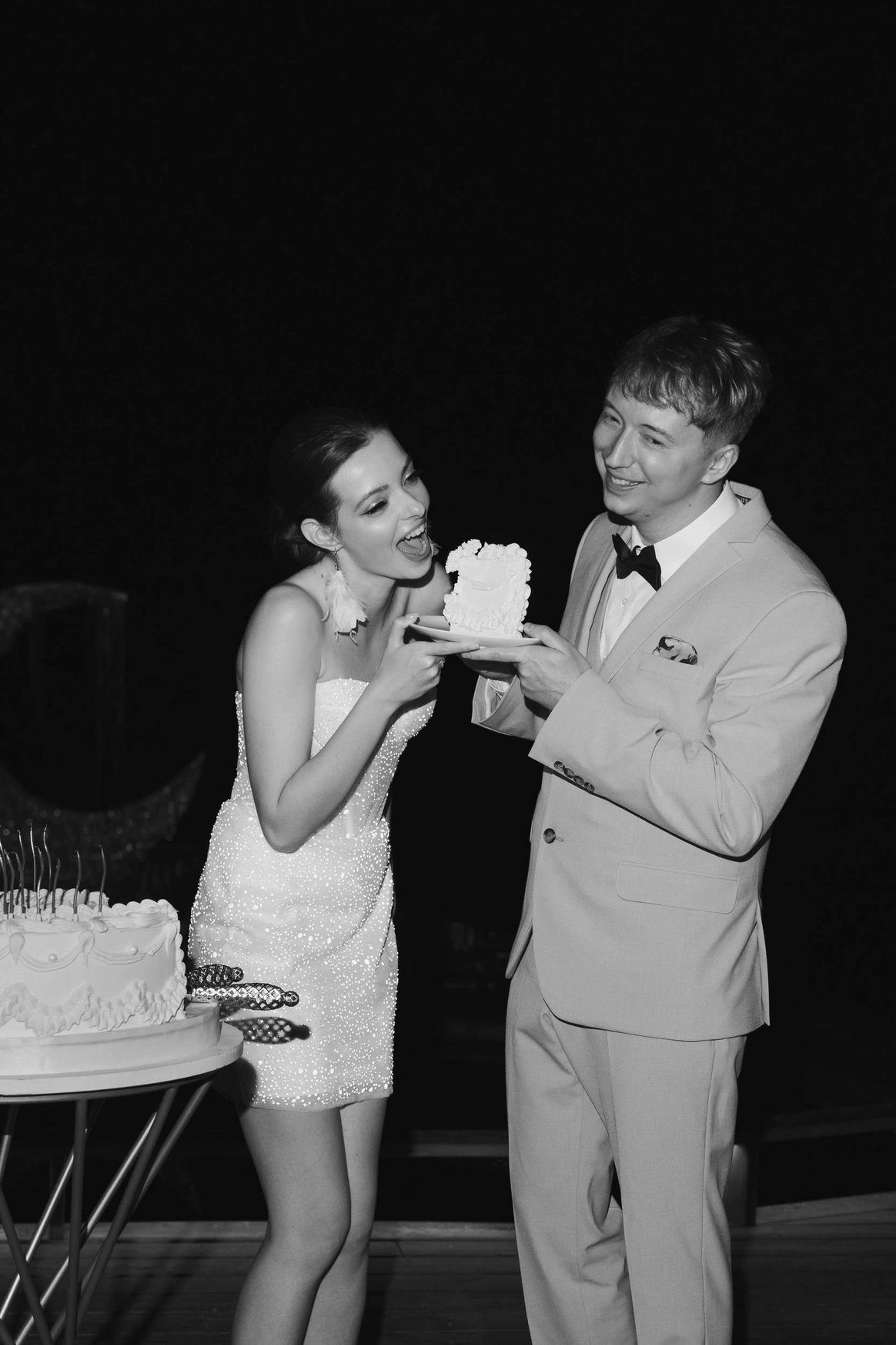 В конце вечера молодожёны писали друг другу послания на прозрачной стене под светом софитов и дегустировали торт-желе. Именно такой торт был мечтой невесты.