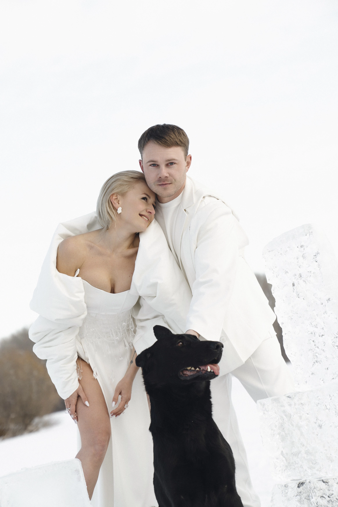 Для дневной фотосессии пары — на коньках и с любимой собакой, мы заказали ледяные глыбы на производстве, пирс застелили меховыми полотнами.