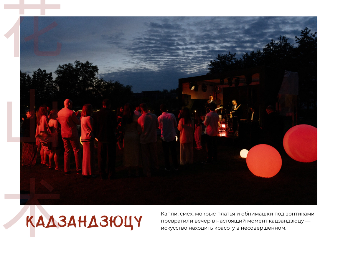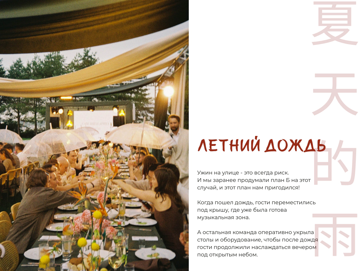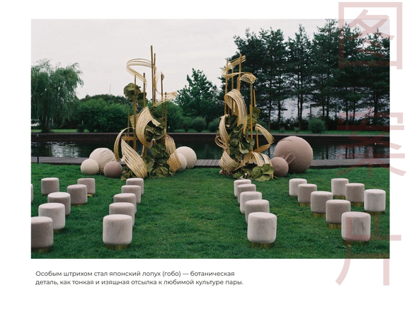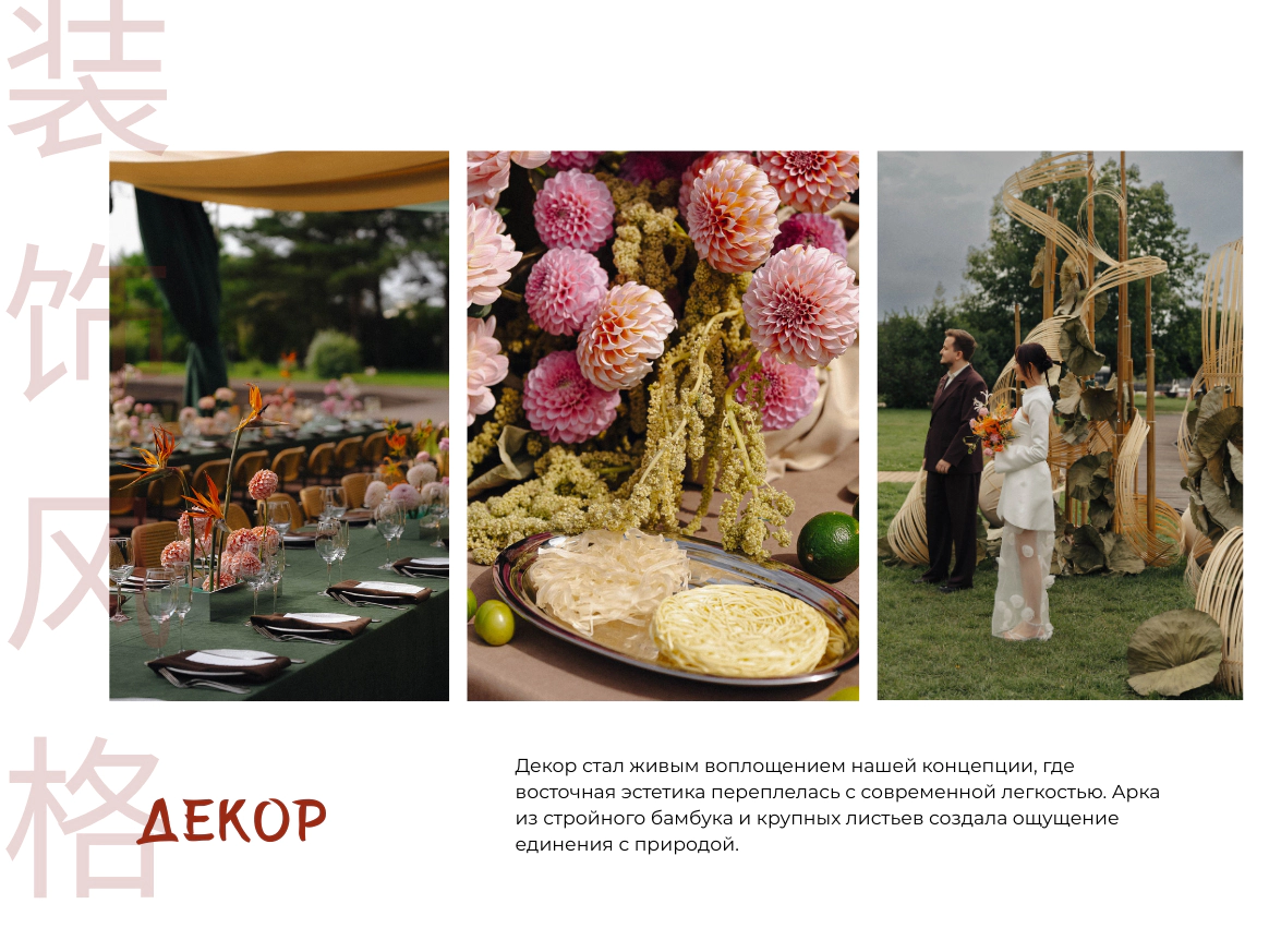 Визуальные решения стали полным воплощением концепции: фуд-декор из азиатской лапши, церемония среди природы, украшенная бамбуком и японским лопухом и продуманная рассадка под открытым небом, где каждый элемент дышит атмосферой Дальнего Востока.