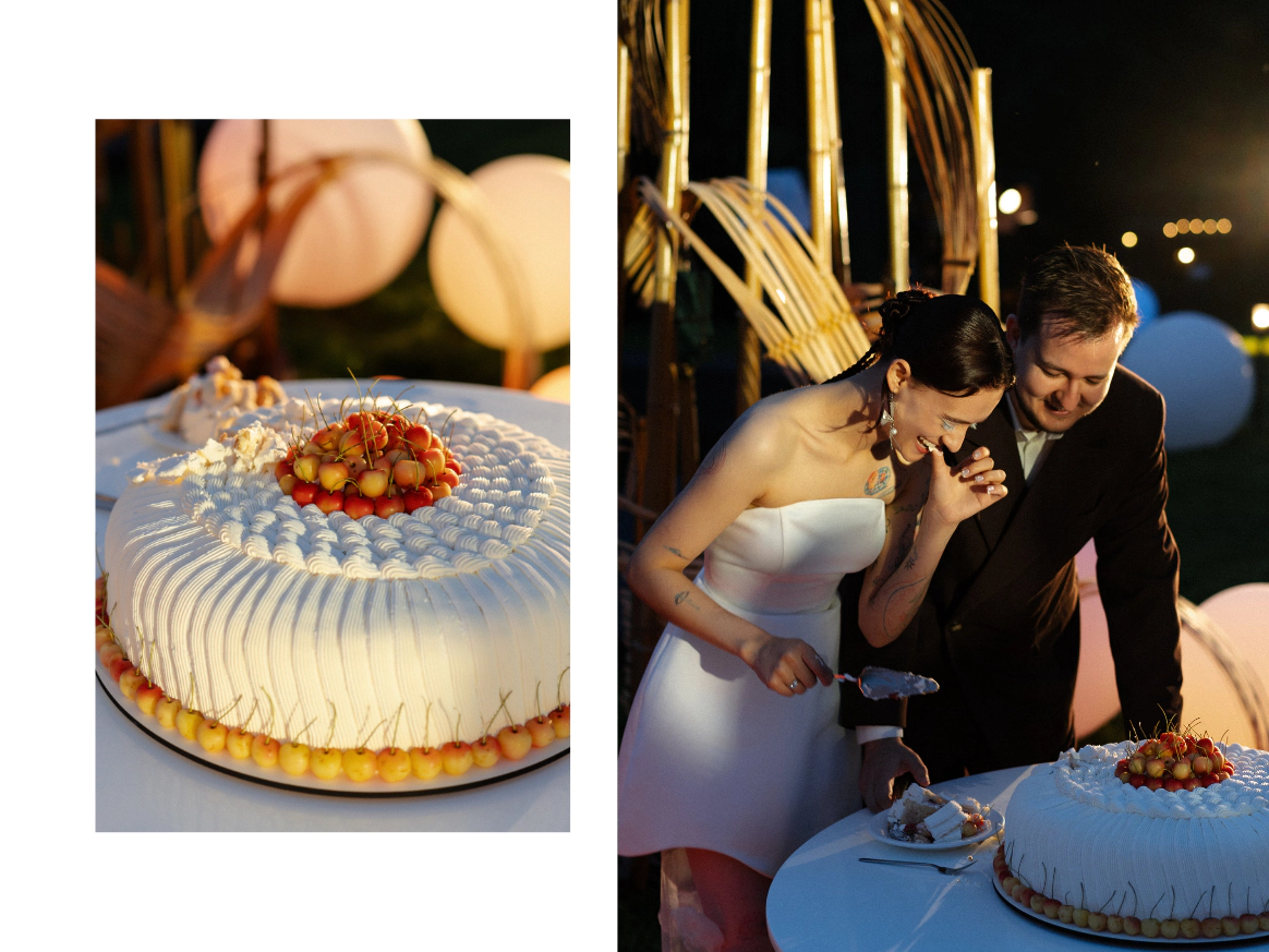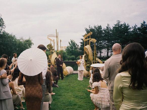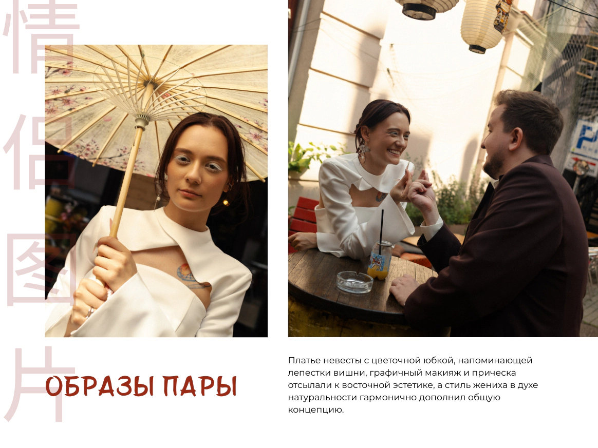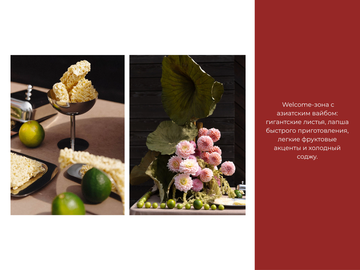 Визуальные решения стали полным воплощением концепции: фуд-декор из азиатской лапши, церемония среди природы, украшенная бамбуком и японским лопухом и продуманная рассадка под открытым небом, где каждый элемент дышит атмосферой Дальнего Востока.