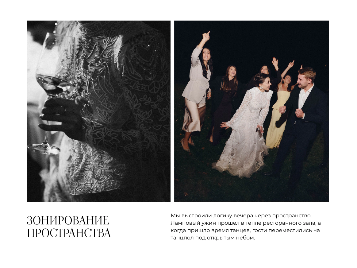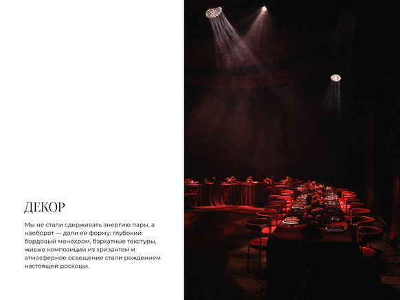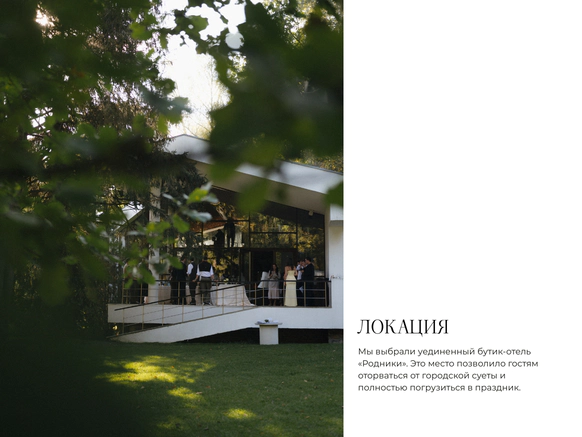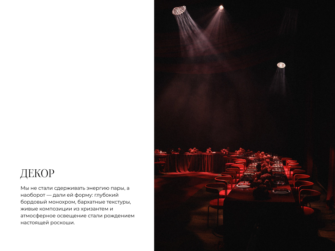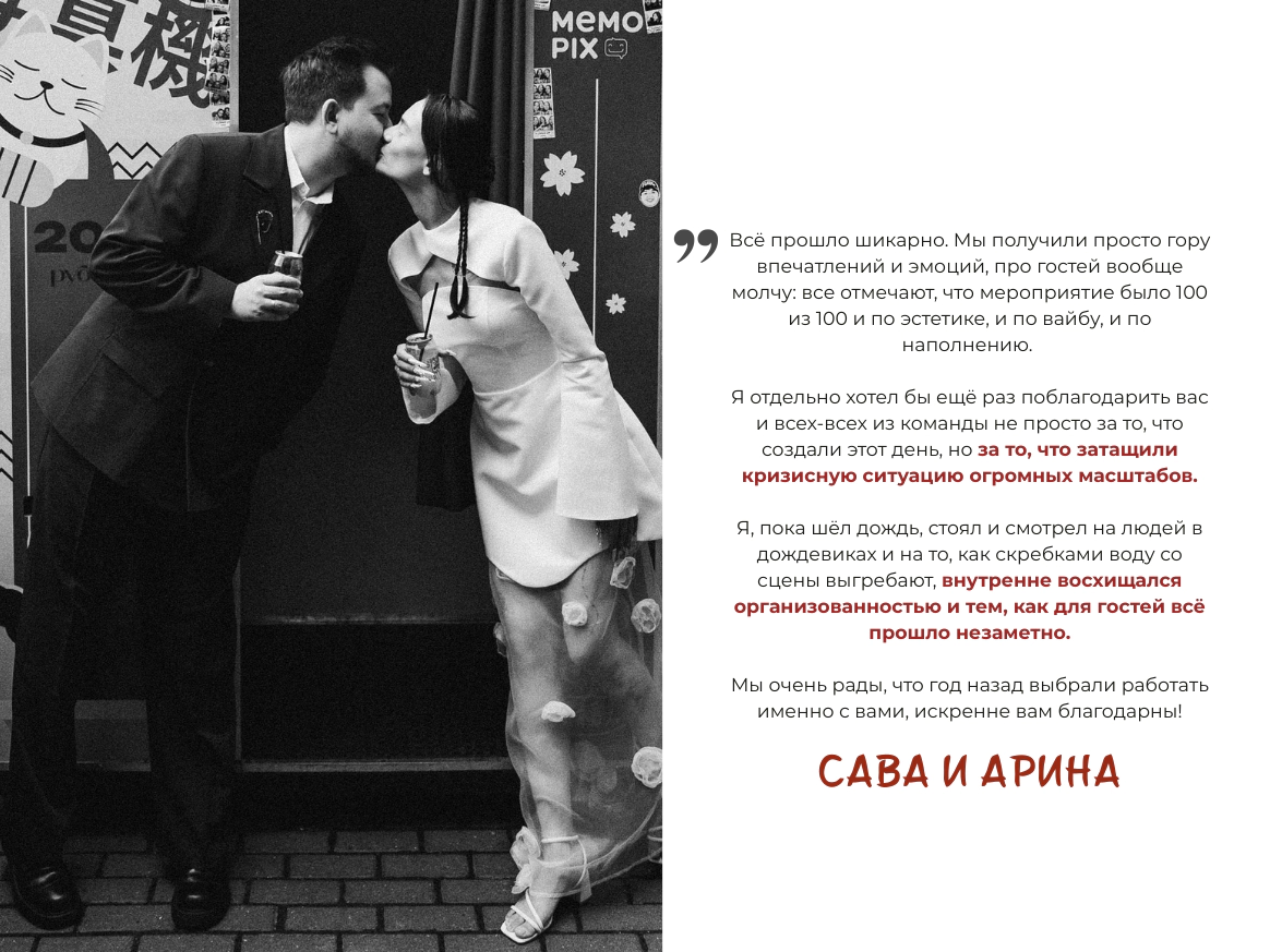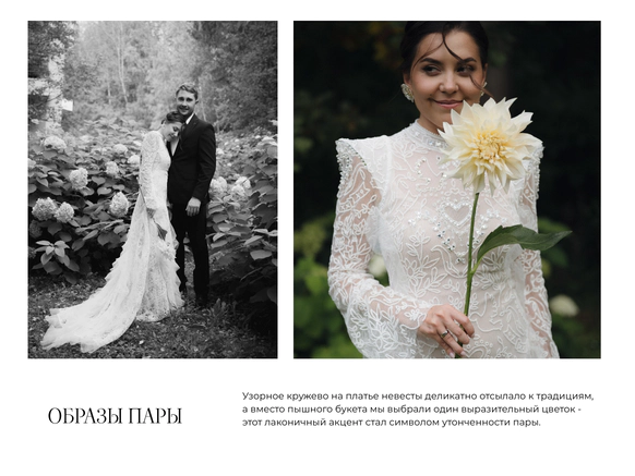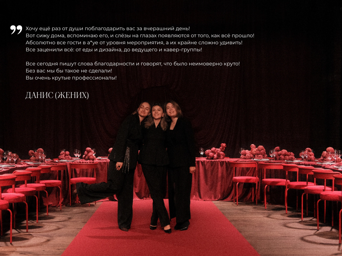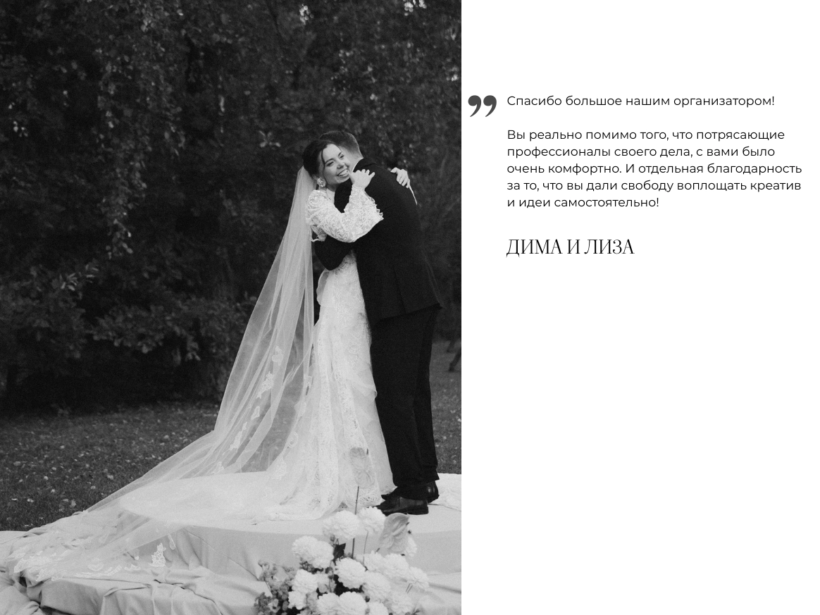 Наша сильная сторона — умение сочетать тёплое, лёгкое общение с безупречным сервисом, тонким стилем и бережным отношением к каждой истории. Мы за свободу самовыражения! Поэтому мы не навязываем «как принято». Мы создаём — как хочется паре. Если рождается идея, которую ещё никто не воплощал — мы с радостью поддержим ее и вдохнём в неё жизнь. По этой причине мы организуем ограниченное количество свадеб в год, чтобы проникнуться каждой историей и предоставить высокий сервис. Свадьба для нас — не просто красивая картинка. Мы любим глубину: в людях, моментах, отношениях. Ищем её во всём. И верим: нет ничего прекраснее, чем показывать настоящих людей и их искренние чувства.