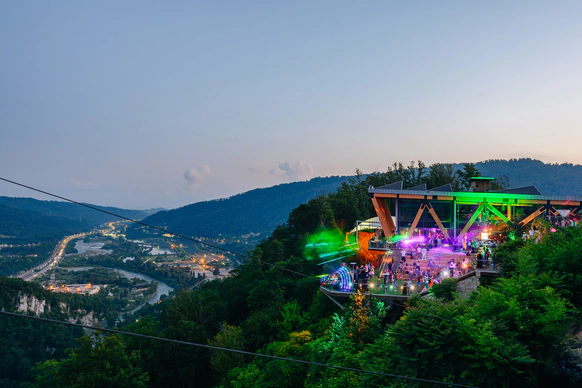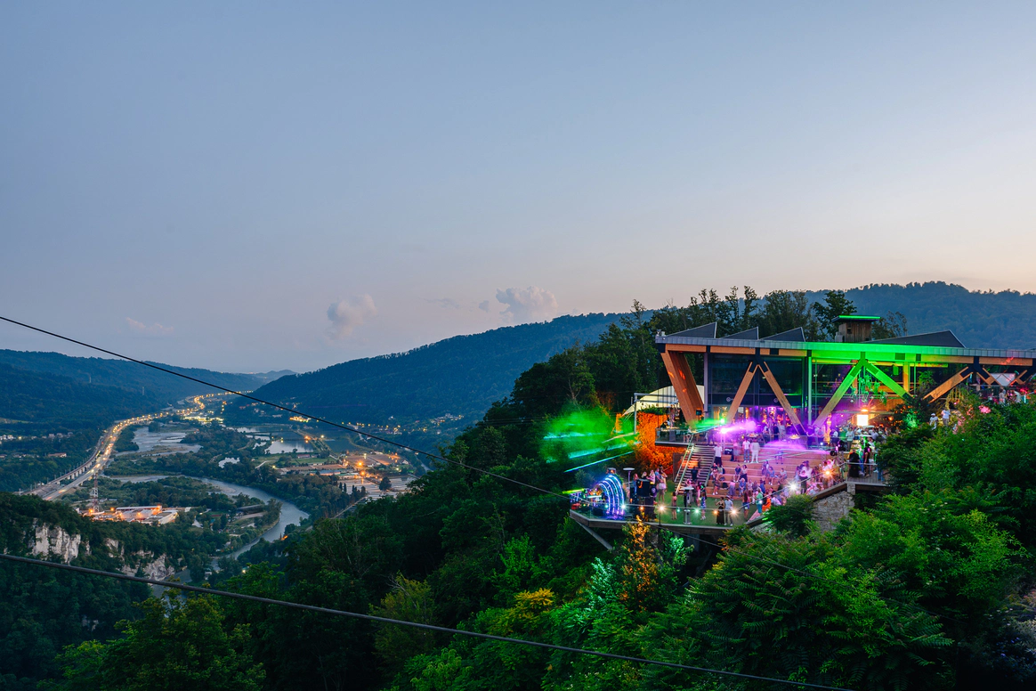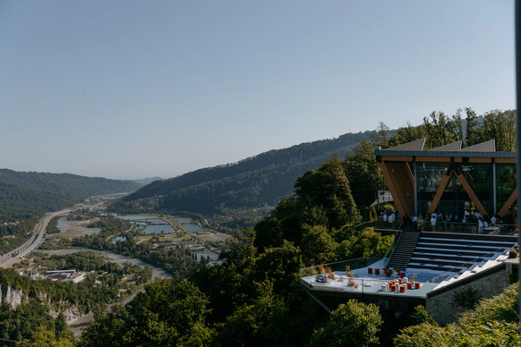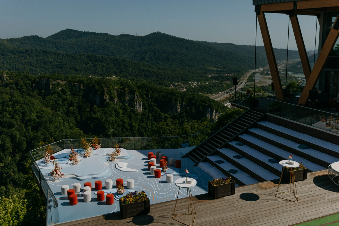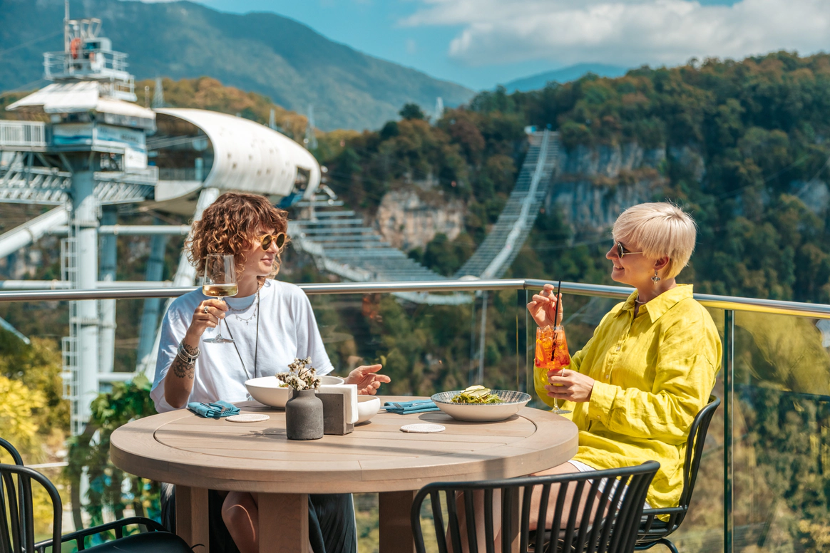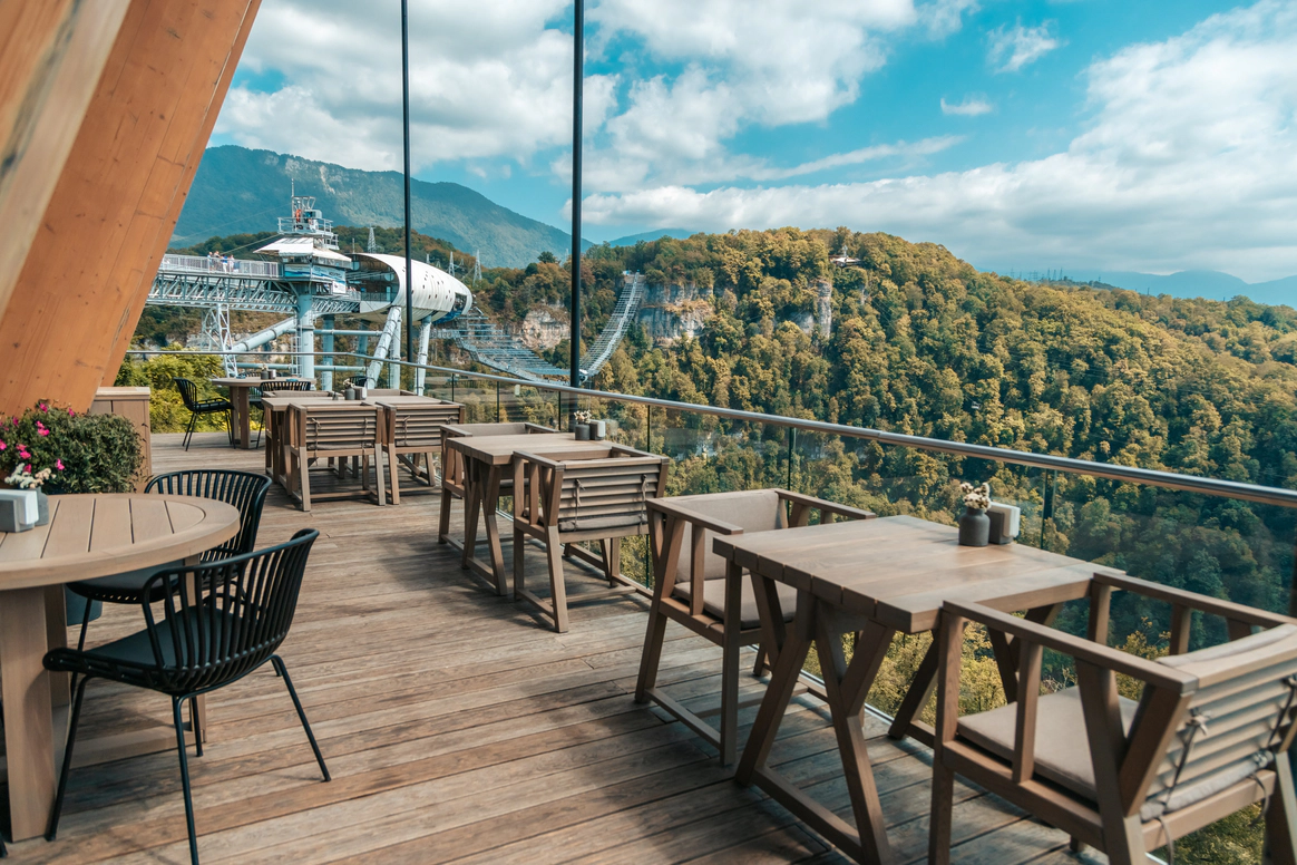 Панорамный ресторан Кáури расположен в Сочинском национальном парке среди живописной горной природы на территории «Скайпарк Сочи». Он словно парит над рекой Мзымта, а с него открываются виды на колхидский лес, Корабельные скалы и Чёрное море. Это идеальное место для проведения незабываемого праздника в компании любимых людей или коллег по бизнесу. В ресторане ежегодно проходит сотни различных мероприятий: от корпоративных тимбилдингов до частных свадебных церемоний. Команда агентства skypark!event обладает большим опытом в организации и проведении любых мероприятий, поэтому здесь вы сможете осуществить свою мечту и провести незабываемый день в уникальном месте. Выездная регистрация в Амфитеатре с видом на Скайбридж и горы – одна из главных фишек ресторана Кáури. В день свадьбы молодожёны смогут получить незабываемые эмоции от уникальных высотных аттракционов: полёт предоставляется в качестве свадебного подарка. Два уровня ресторана Кáури позволяют проводить как банкетные, так и фуршетные меню. В банкетной рассадке ресторан вмещает около 200 гостей. В тёплые месяцы открывается терраса на 50 посадочных мест. Ресторан Кáури — это атмосферное место, где сочетаются трудолюбие, опыт, стремление к новым историям и забота о своём госте. Выбирая это место для события, вы можете быть уверены в том, что оно пройдет на высоте, как в прямом, так и в переносном смысле. «Мы постоянно открыты новому и не останавливаемся на достигнутом, поэтому Кáури — исследователь и экспериментатор, сочетающий в себе две концепции — fast casual и fine dining».
