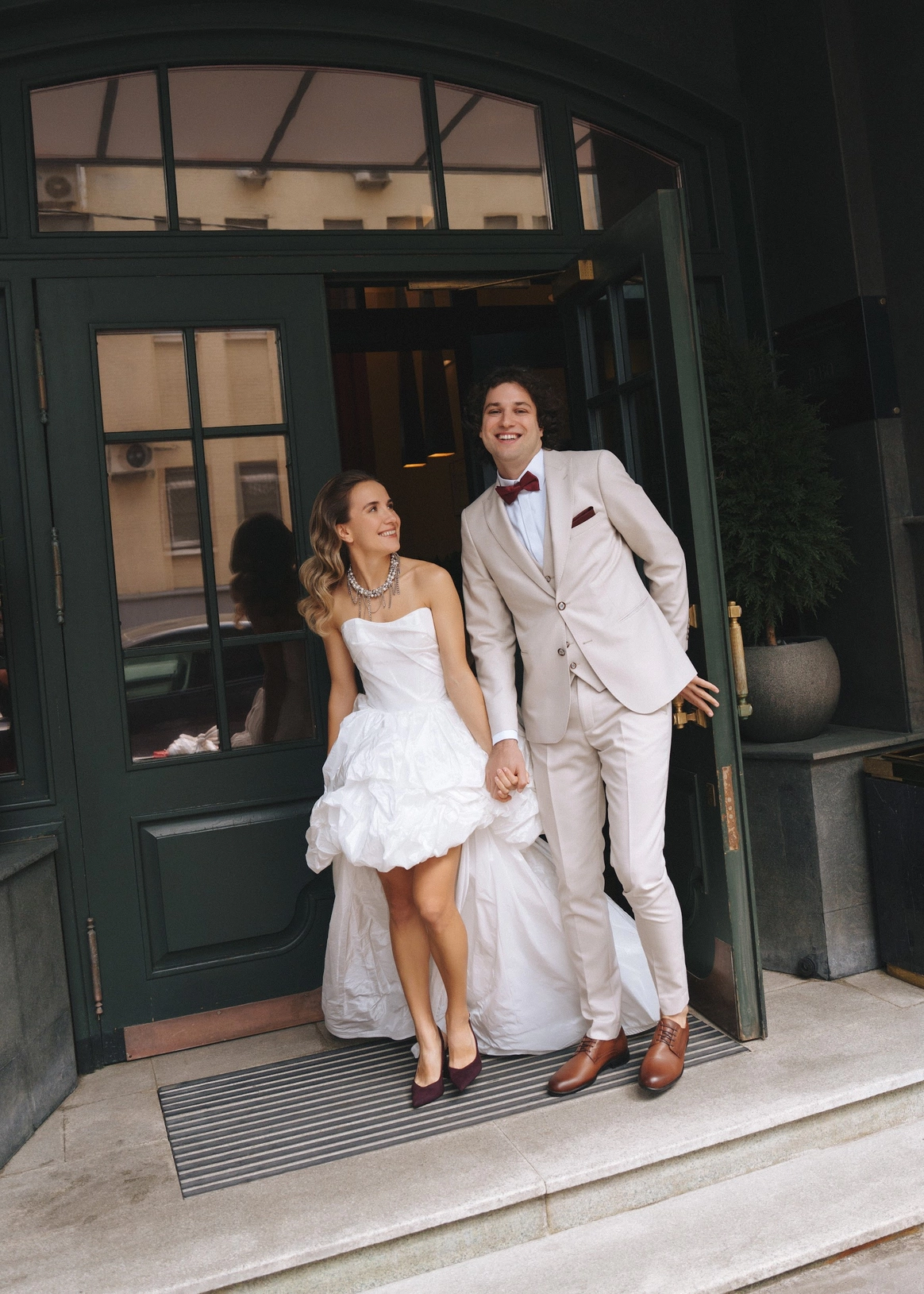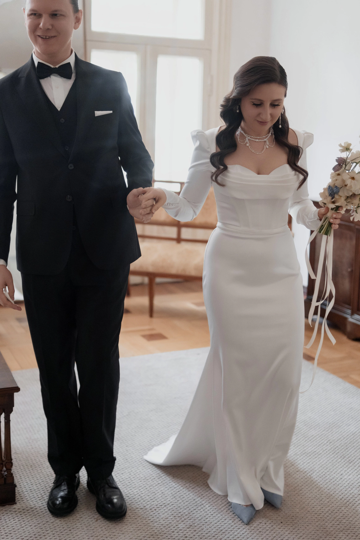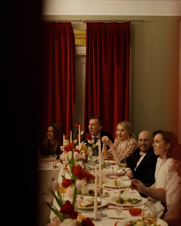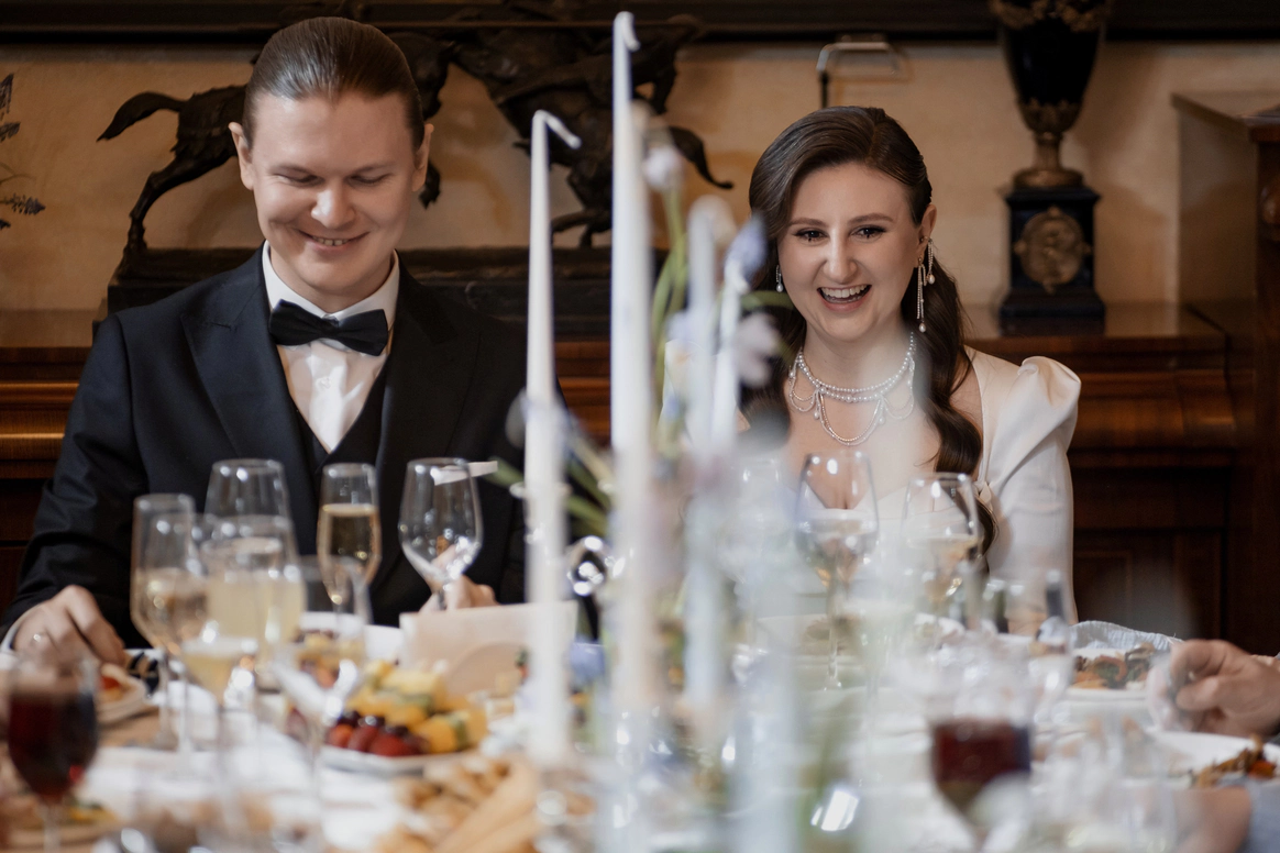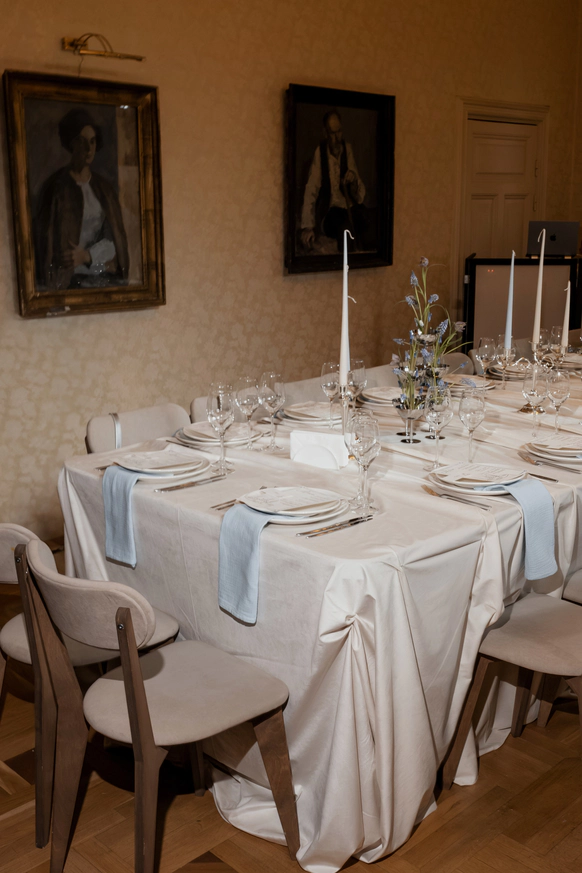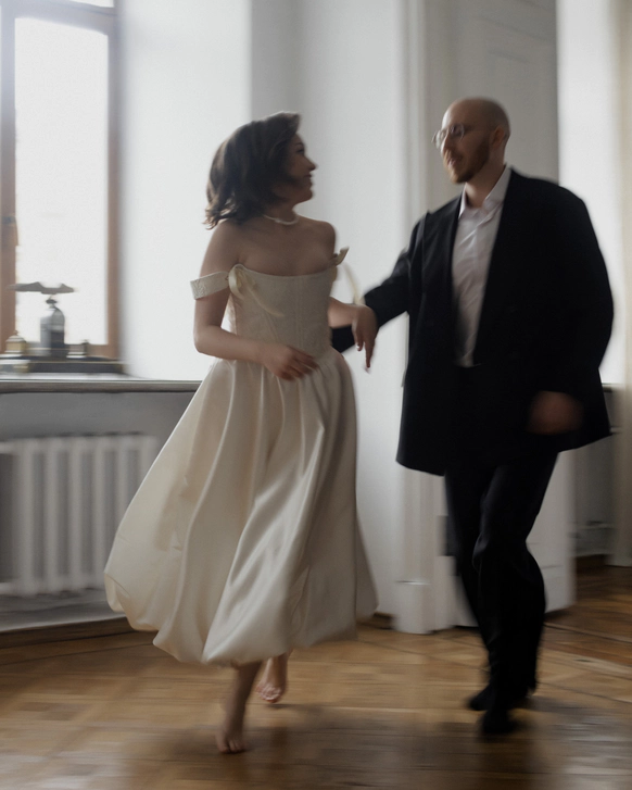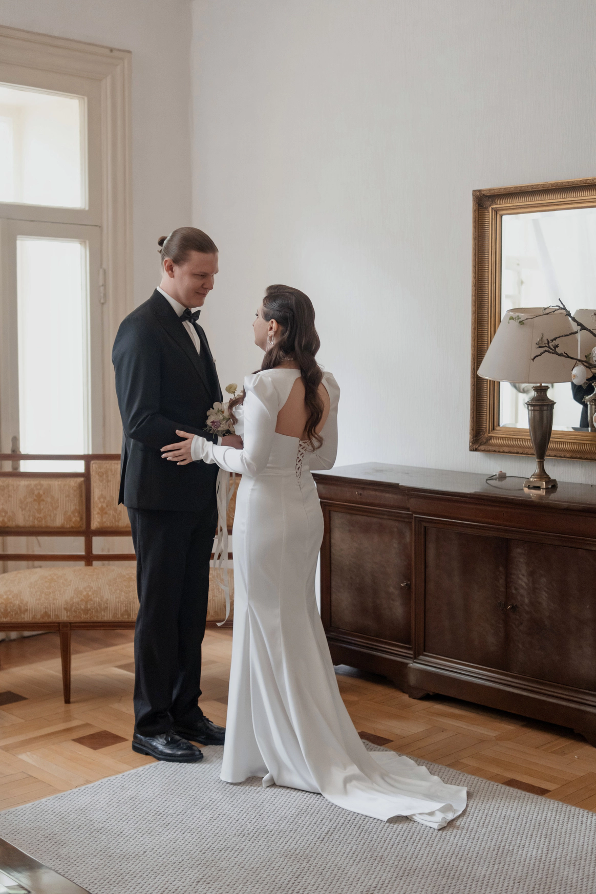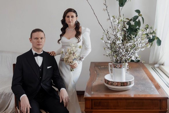Небольшая камерная свадьба, с четко продуманными деталями начиная с утра жениха и невесты в лаконичном номере отеля Marco Polo, фотосессией в эстетичной квартире начала XX и заканчивая ужином в ресторане, который находится в особняке XIX века.