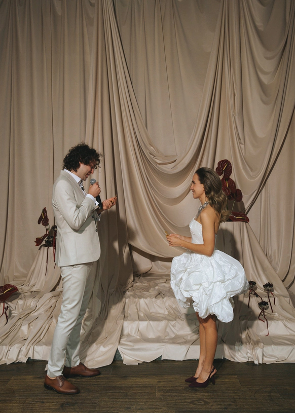 В данном проекте мы решили углубиться не только во внешние элементы свадьбы, такие как декор, но и показать некую глубину. То, что объединяет ребят. Классным решением было то, что мы попросили ребят заранее записать название "глав", с готовым текстом, и на самом мероприятии, перед каждым блоком, звучал то голос невесты, то голос жениха.