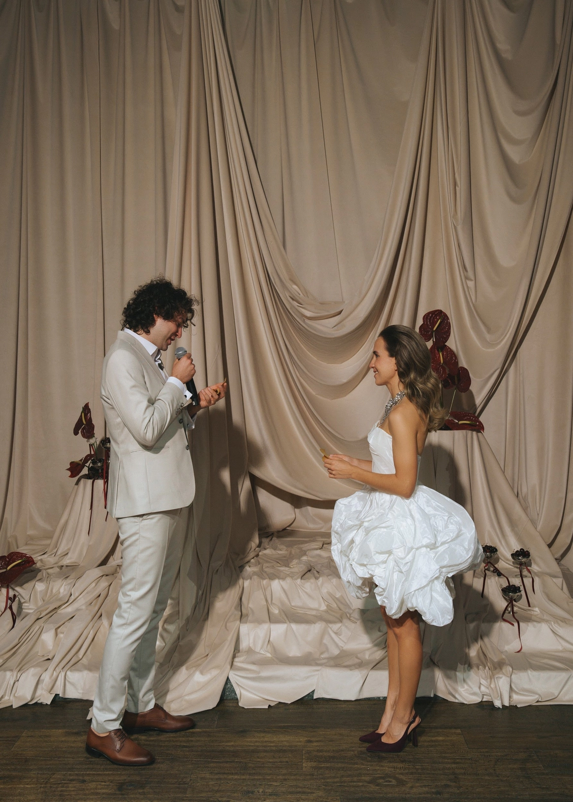 В данном случае, уникальность состояла в том, что этот проект я делала полностью с удаленной парой. Все согласование по зуму, все на полном доверии. Ребята и сейчас проживают на Кипре, и в момент подготовки тоже были там. И была забавная ситуация на самой площадке, когда мы заканчивали монтаж декора. Мы с декоратором смотрели на входную группу особняка, и нам обеим пришла в голову мысль, задрапировать ее. Понадобилось 10 минут согласований с парой и с рабочими со стороны декоратора, и уже через 2 часа, готовая классная фотозона была готова.