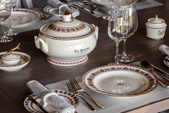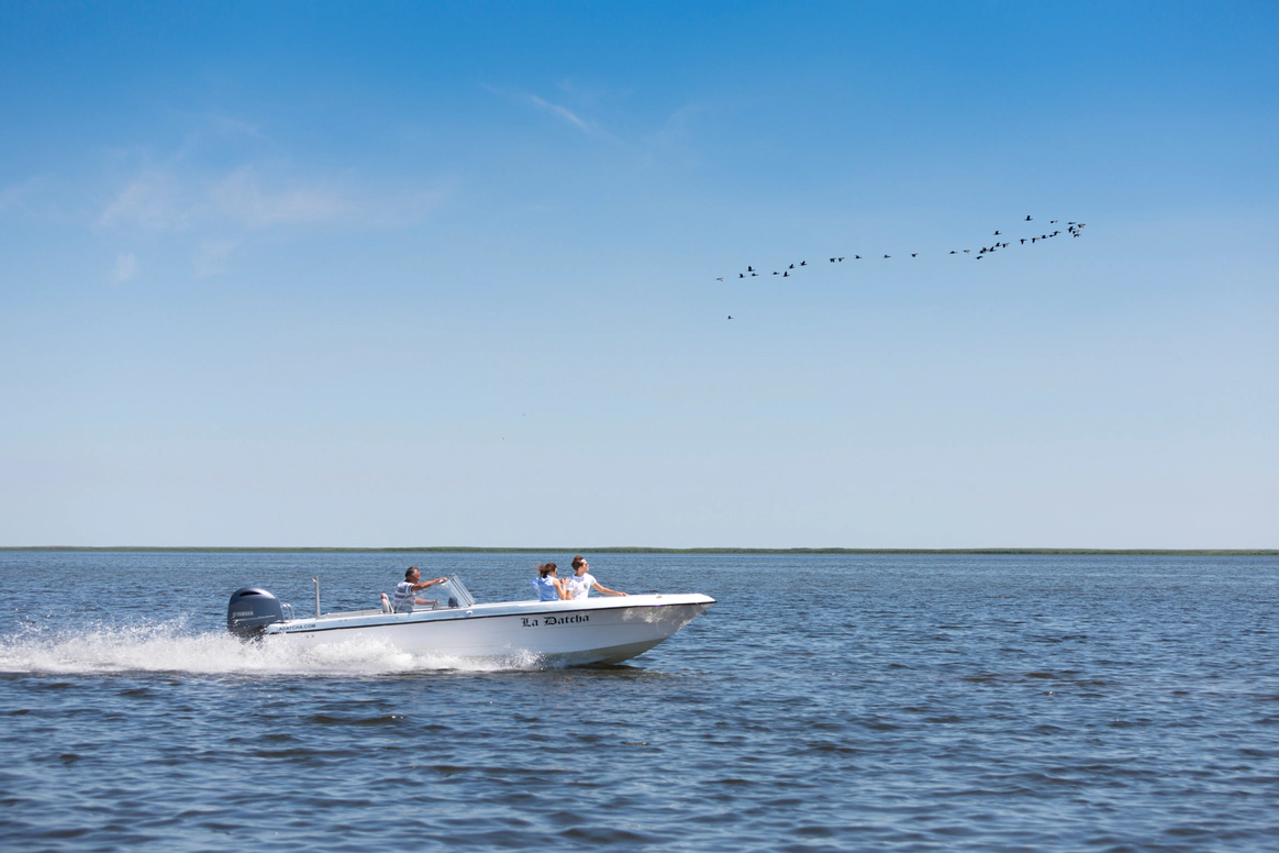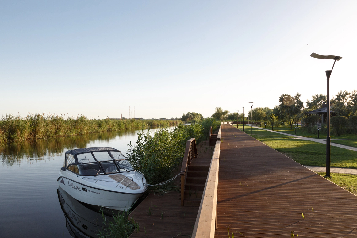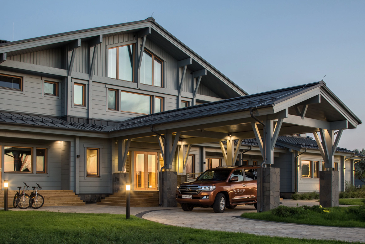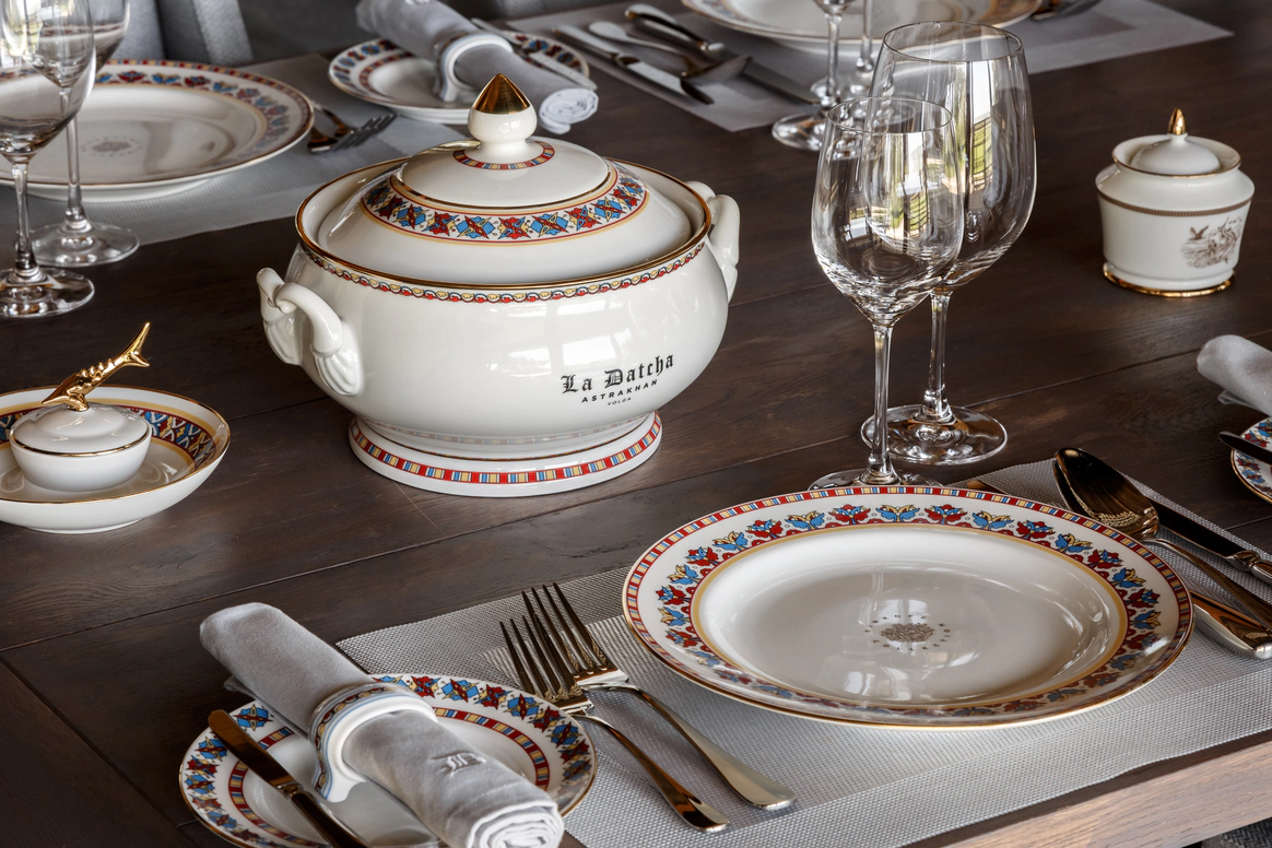 «Ля Дача Астрахань» находится в низовьях Волги, на берегу канала, впадающего в Каспийское море. Из гостиной открывается вид на луга и канал перед дачей — по нему рыбацкие лодки выходят в низовья Волги и в Каспийское море. Архитекторы компании HONKA выдержали дачу в духе дебаркадера — плавучей пристани, где швартовались пароходы. Горизонтали форм, бело-голубые оттенки фасадов и длинные линии крыш ассоциируют дачу с кораблём. В интерьере комнат дизайнеры использовали только натуральные ткани: для штор — лён, для спальни — шёлк, жаккард-сатин и батист, для обивки мебели — гобелен и кожу. «Ля Дача Астрахань» важно, чтобы гости получали удовольствие от каждой мелочи. На первом этаже расположена гостиная, столовая с баром и бильярдная. Здесь же обустроено пространство с рыбацкой гардеробной, душевой и сушильной комнатой. А также построена зона отдыха с домашним кинотеатром Bang & Olufsen и караоке Studio Evolution.