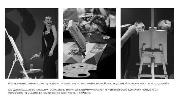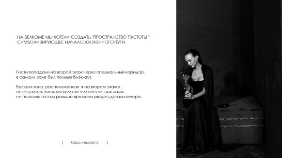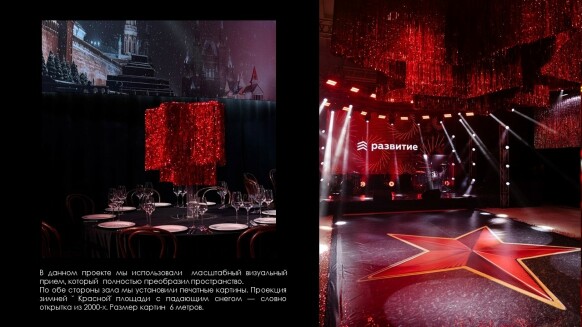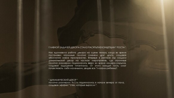 Мы создали динамический декор , где огромные полотна поднимались вверх во время номера-открытия, создавая ощущение масштаба. От этого каждый гость смог почувствовать себя маленьким, увидев все "глазами ребенка".