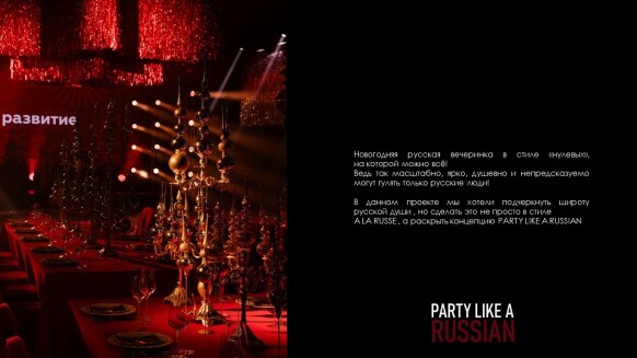 Концепция - "Party like a Russian" яркое и запоминающееся мероприятие, где каждая деталь создает атмосферу настоящего русского праздника. В декоре мы используем дождик из мишуры, пики и хрусталь, чтобы подчеркнуть традиционный новогодний стиль, добавить нотку роскоши.