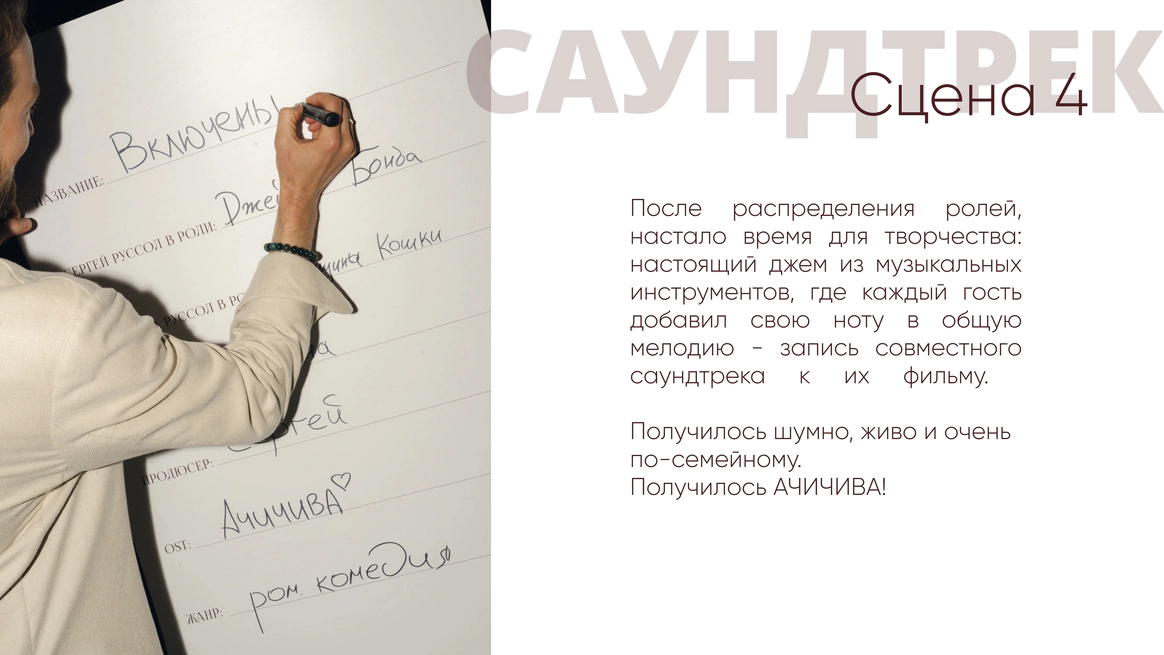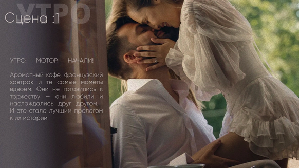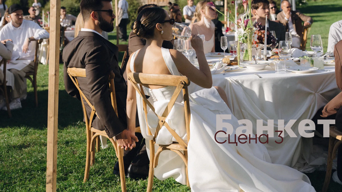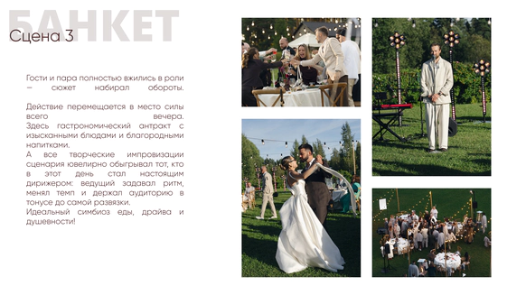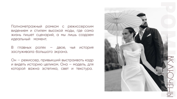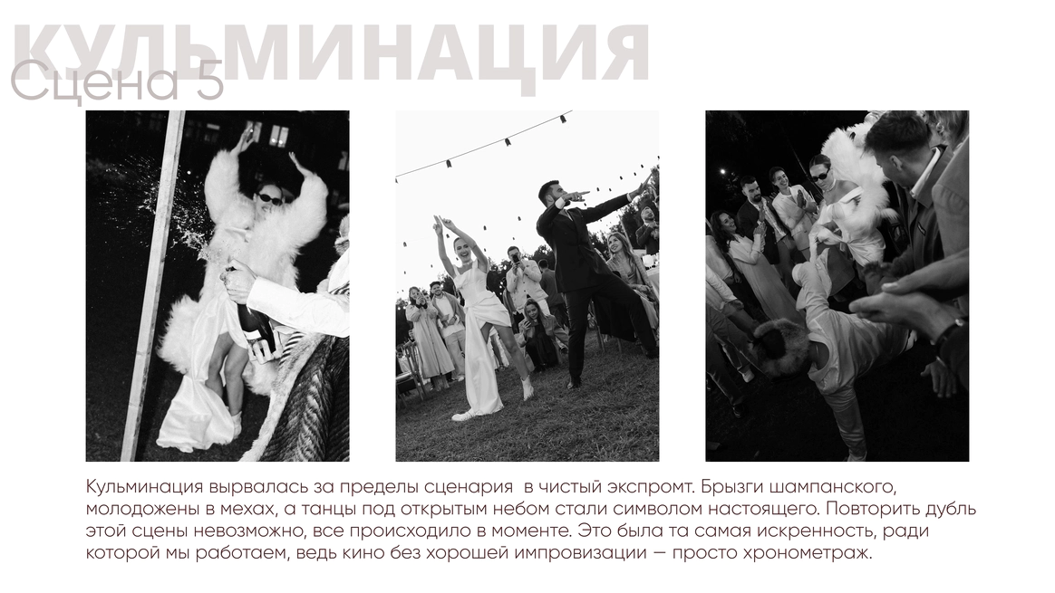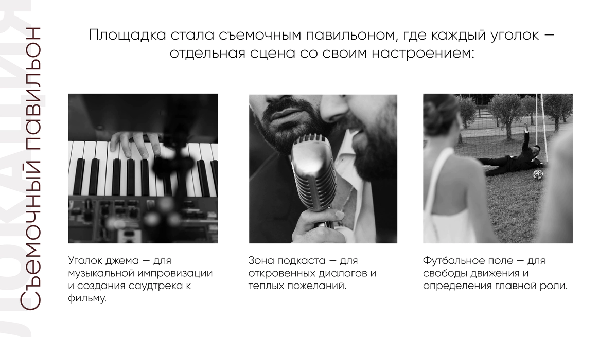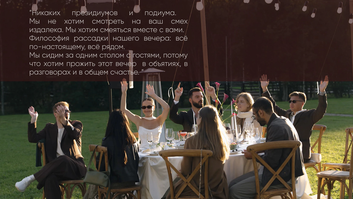 Так родилась идея превратить свадебный день в съемочную площадку под открытым небом, где главным действом станет создание синопсиса их собственного фильма, который они пишут здесь и сейчас, в импровизации и живом взаимодействии с гостями.