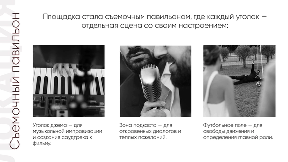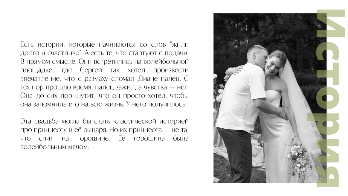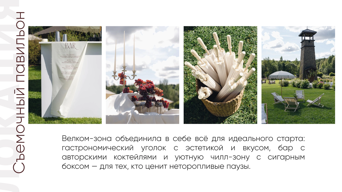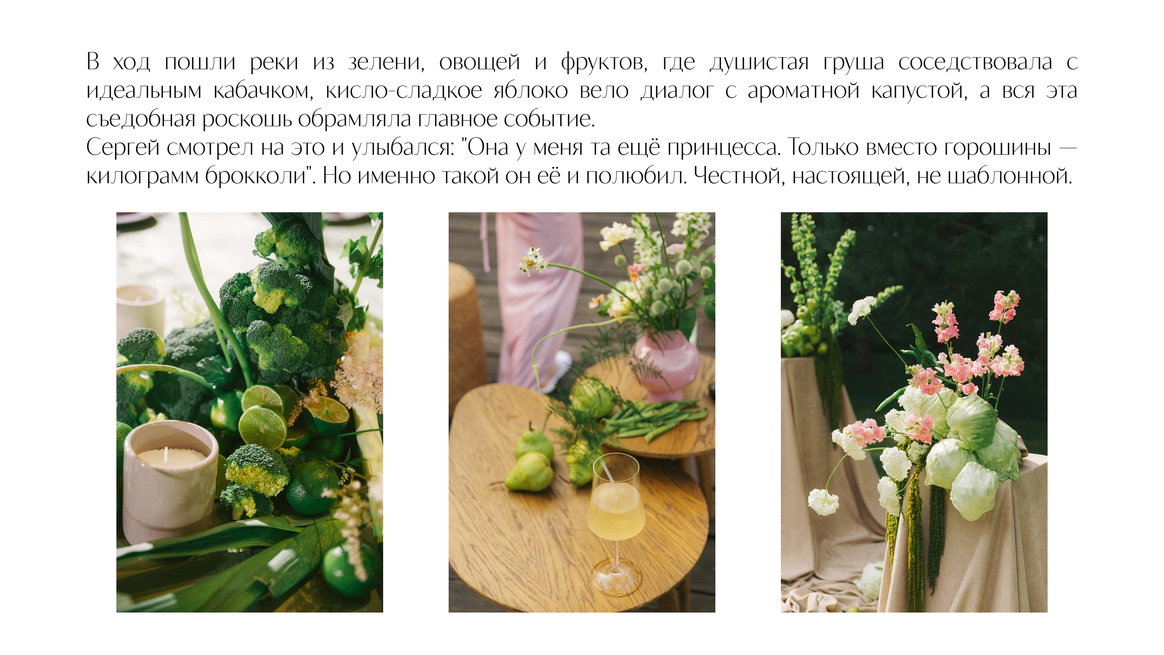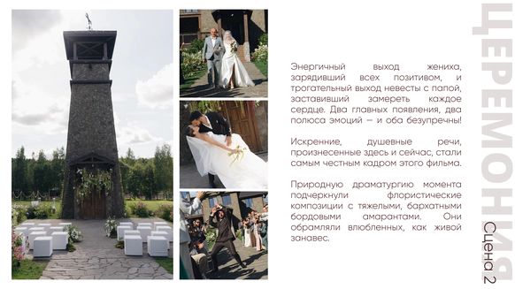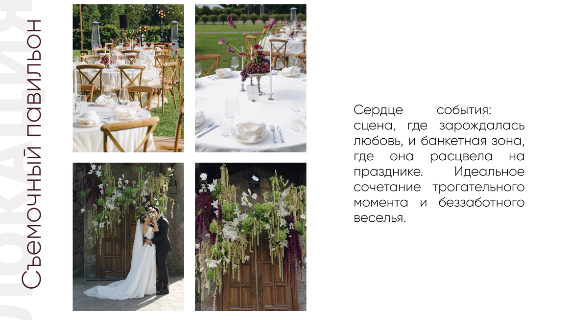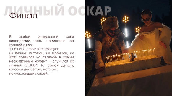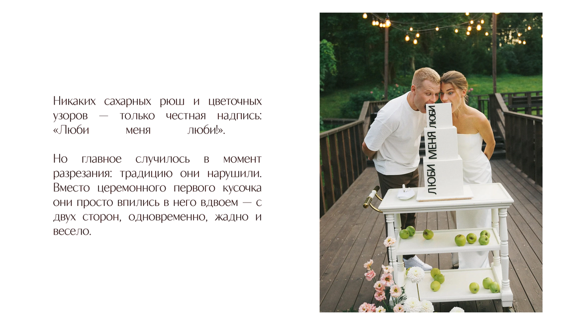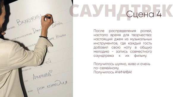 Так родилась идея превратить свадебный день в съемочную площадку под открытым небом, где главным действом станет создание синопсиса их собственного фильма, который они пишут здесь и сейчас, в импровизации и живом взаимодействии с гостями.