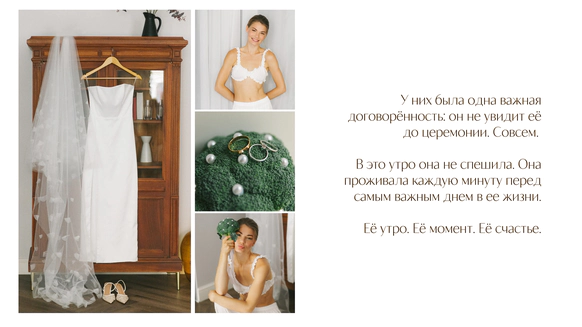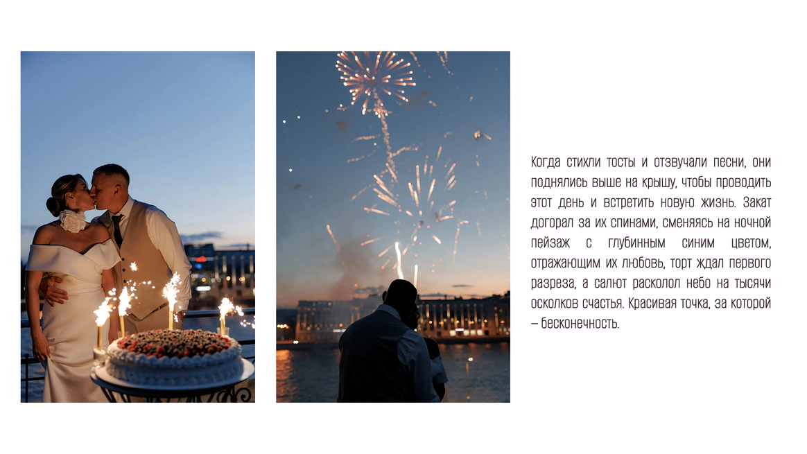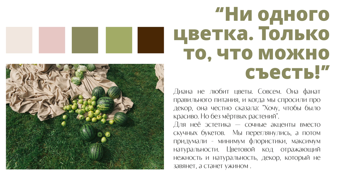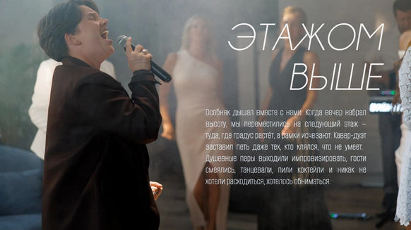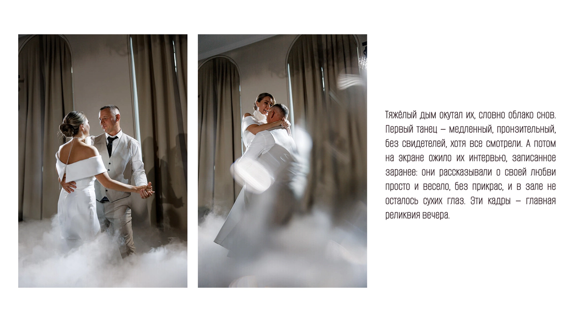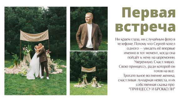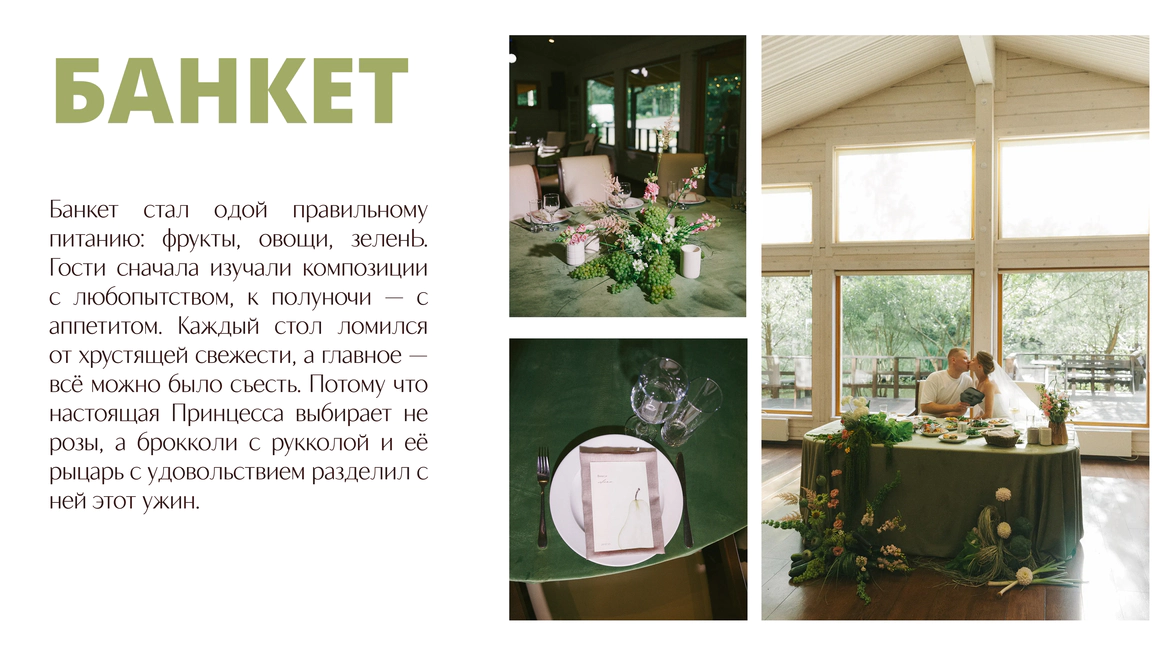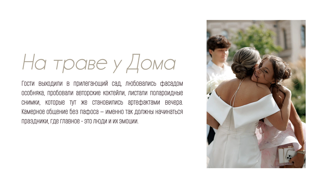 Так родилась идея превратить свадебный день в съемочную площадку под открытым небом, где главным действом станет создание синопсиса их собственного фильма, который они пишут здесь и сейчас, в импровизации и живом взаимодействии с гостями.