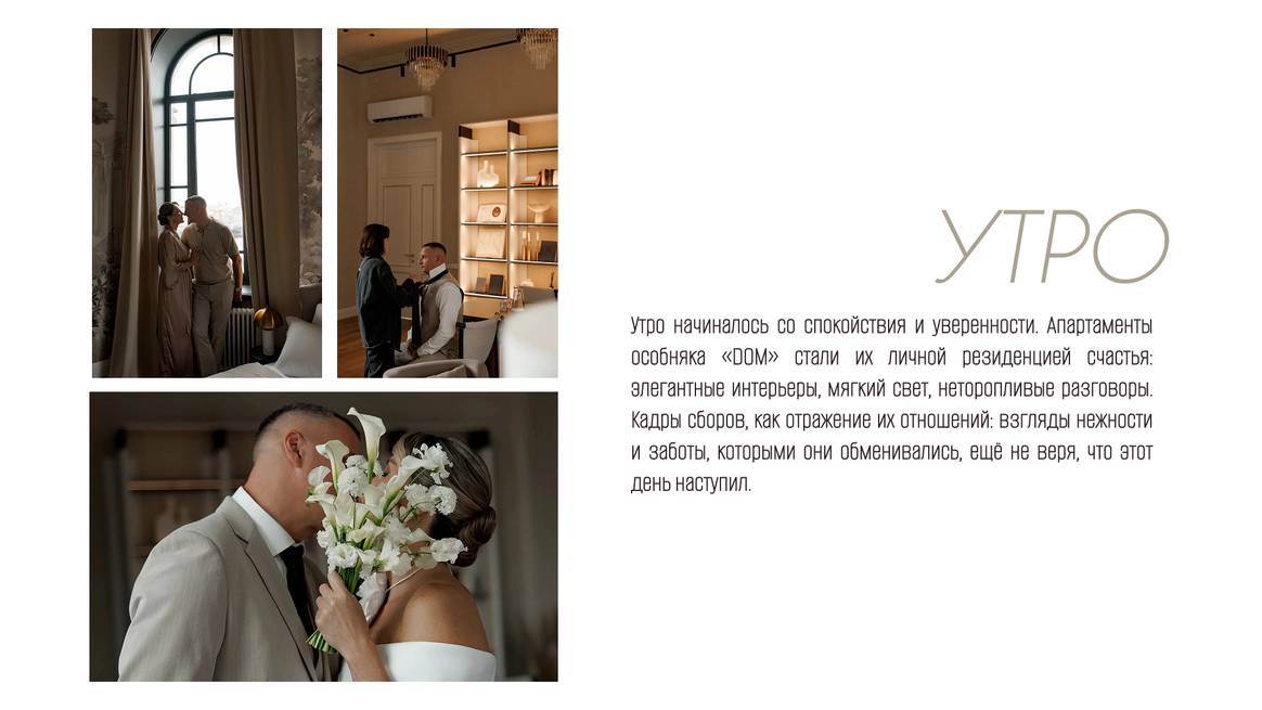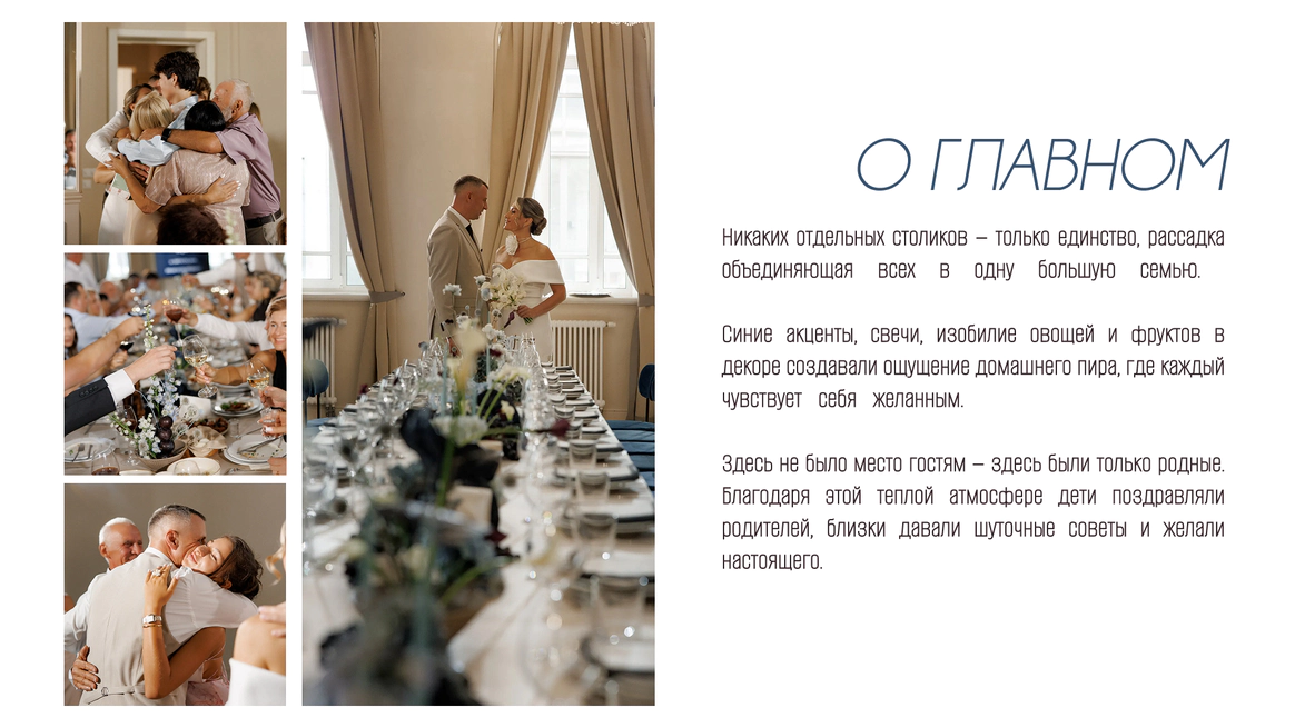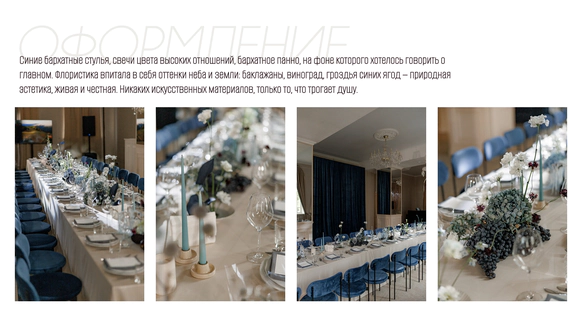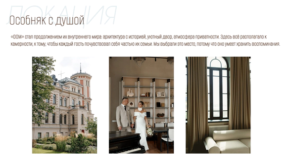 Подбирая локации, основывались на желании найти место, которое бы имело многоуровневость, классические интерьеры, атмосферу дома и уюта, будто пара и гости собрались на семейный праздник в своём собственном камерном особняке.