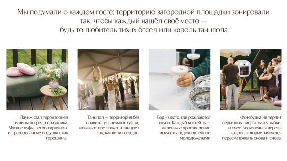 После этого диалога, решили предложить ребятам загородную локацию, которая бы позволила на закрытой территории создать зоны активности их любви: там где можно танцевать до утра, без оглядки играть в бир-понг, подпевать любимому артисту Невесты, дурачиться перед камерой, втискиваясь вдвоем в рамку «Love is».
