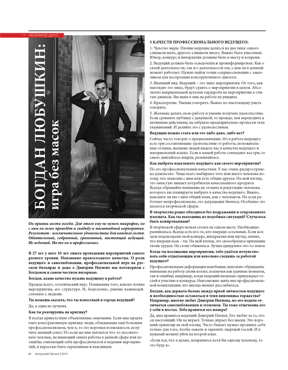 Родился в 1992 году. Это было легко. С детства любил веселить людей и быть в центре внимания. Был в центре внимания детской комнаты милиции. Подрос. Провёл первую свадьбу в 2009-м. Молодожёны рады. Мне заплатили, понравилось. В 2010-м провёл первый развод. Пара счастливее, чем в 2009-м. Странно. Заплатили чуть больше. Поступил в институт культуры на продюсера-постановщика культурно-досуговых программ. Стал умнее. Теперь хочу добраться до вершины event-индустрии, пожать руку Нагиеву, Урганту и Белову. Можно только Белову.