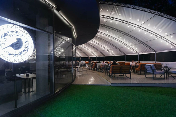 Малиновка – новая страница парка Сокольники. Малиновка – новый семейный ресторан в парке Сокольники, не выезжая из города, вы будете чувствовать себя в единение с природой. Большая летняя терраса на 250 мест поможет почувствовать себя загородом в окружении леса. Сквозь огромные панорамные окна основного зала замечательно наблюдать за неспешной сменой 4-х сезонов. Мы сохранили традиции гостеприимства, начатые в конце 19 века в парке Сокольники. Ведь здесь было одно из первых кафе в Москве, построенное по проекту архитектора Чеканова. Мы добавили современные технологии, чтобы сделать наше кафе еще лучше для каждого. 4-х метровых LED-экран, сценический свет и звук, чтобы сделать каждое событие запоминающимся и ярким. При проведении строительных работ в фундаменте кафе была найдена книга с рецептами конца 19 века. Было решено сохранить эти рецепты и добавить их в наше меню, чтобы каждый гость мог попробовать традиционные блюда. Меню состоит из популярных и узнаваемых блюд европейской кухни с авторскими акцентами. Аквариум со свежими устрицами и морскими ежами. Стоит обязательно попробовать паштет из птицы с овощами пай в авторском исполнении, тартар из говядины с айоли из черного чеснока, салат с томатами и кремом из баклажан, казаречче с крабом, консоме из лесных грибов с уткой. Отдельный раздел в меню отведен пицце, 8 позиций, приготовленных в каменной печи, привезенной из Италии. И конечно нужно пробовать десерты: баскский чизкейк, сырная груша, мильфей с малиной и тот самый малиновый щербет, который был в первом кафе в парке Сокольники. Отдельно нужно сказать о барной карте. Авторские коктейли названы птичьими названиями: Голубка, Фламинго, Райские птицы, Настоящий орел. Сеты шотов: Малиновое небо, Закат в Сокольниках, Сливочные облака, а также авторские наливки и настойки помогут сделать вечер гостей веселее. Дизайн «Малиновки» выполнен также в природных цветах и оттенках, чтобы еще больше соединить с природой. Высокие потолки Бетон и стекло в оформлении, компенсируются натуральным деревом и текстилем. Большой контактный бар и аквариум с живыми морепродуктами. В «Малиновке» каждый найдет что-то близкое и приятное для себя. Ведь тут так много всего: и вкусная еда и питкие коктейли за контактным баром, ивенты и праздники, детская комната и отдельный караоке-зал на 20 человек. Где как не здесь, отметить День рождения, встретиться с друзьями, сделать предложение, сыграть Свадьбу в Малиновке и просто наслаждаться жизнью…