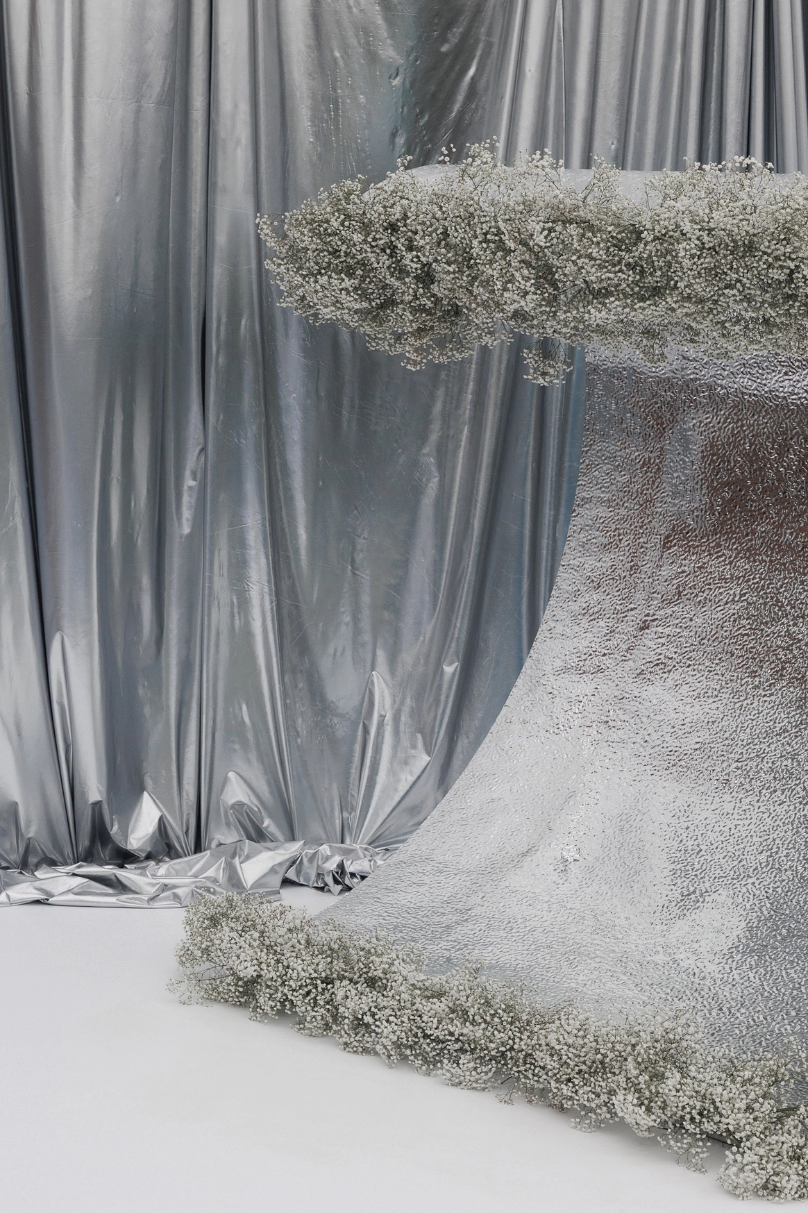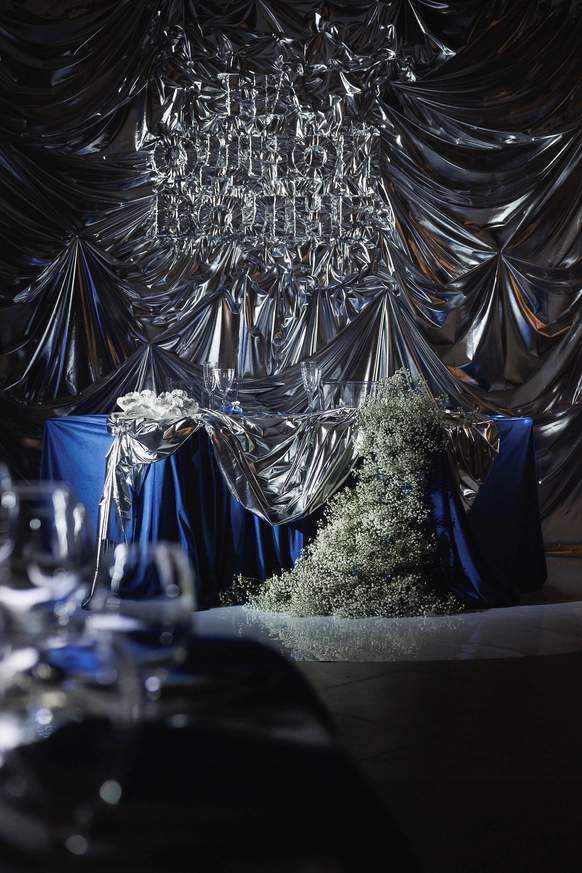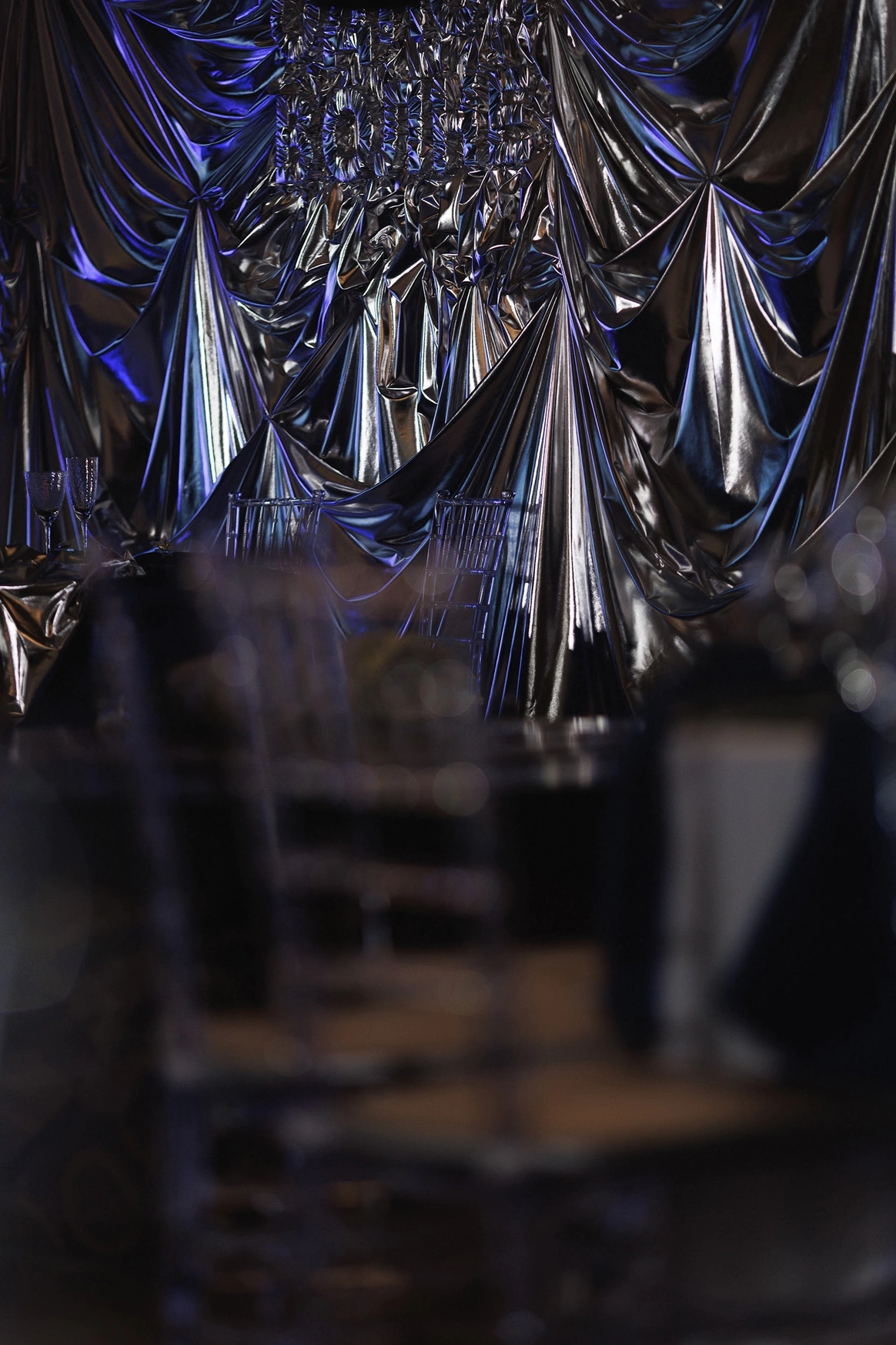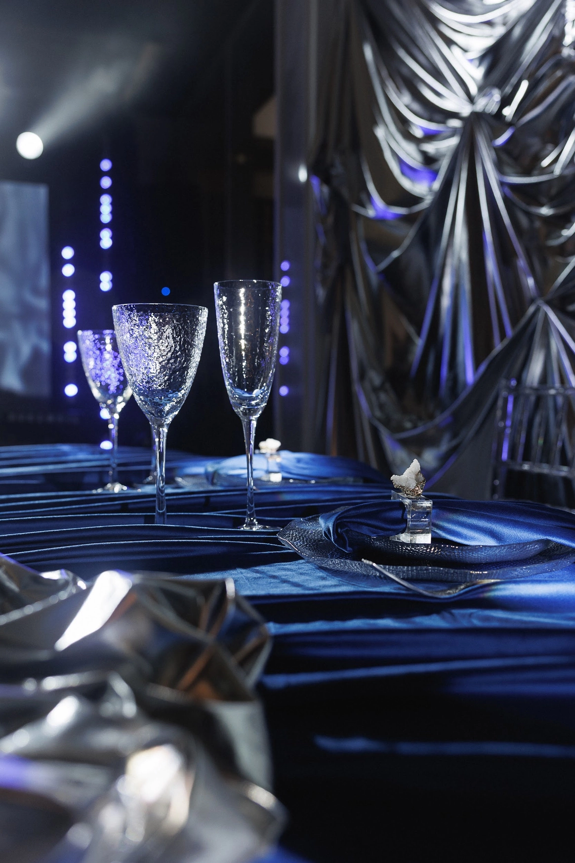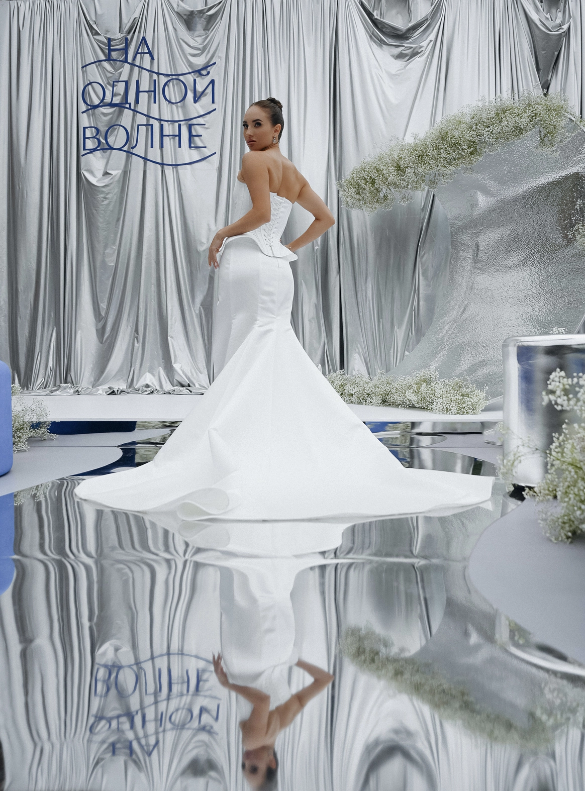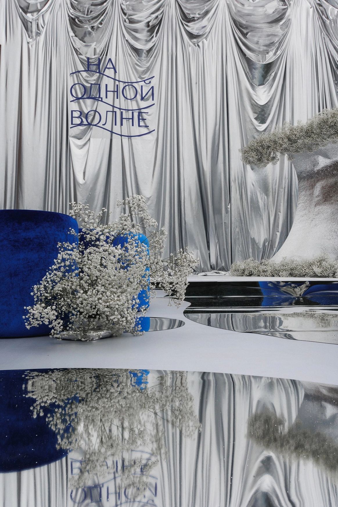 Плавные линии, отражения и свет создавали ощущение движения и глубины. Зеркальная драпировка и покрытие пола создавали эффект водной глади.