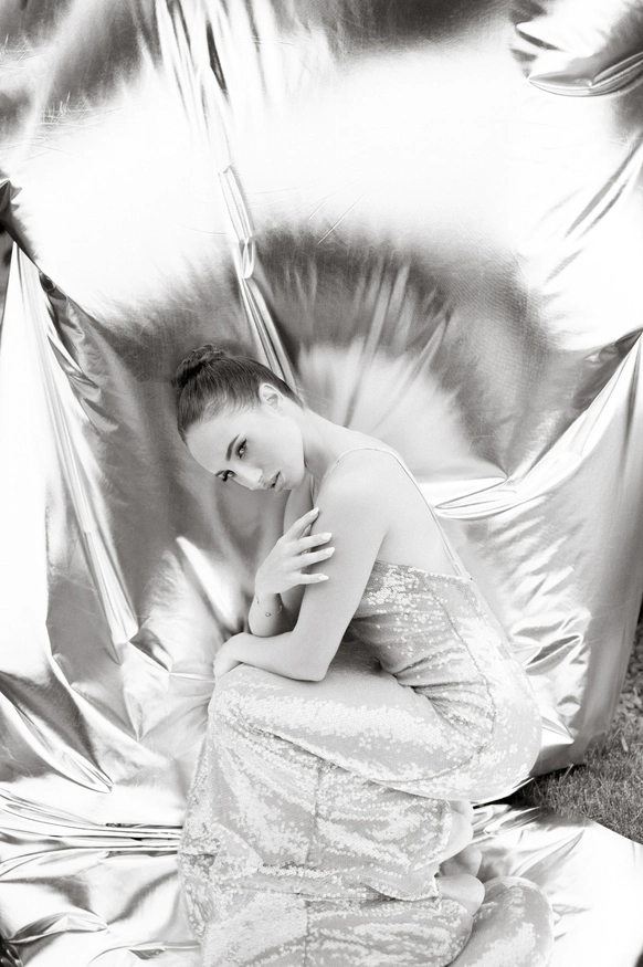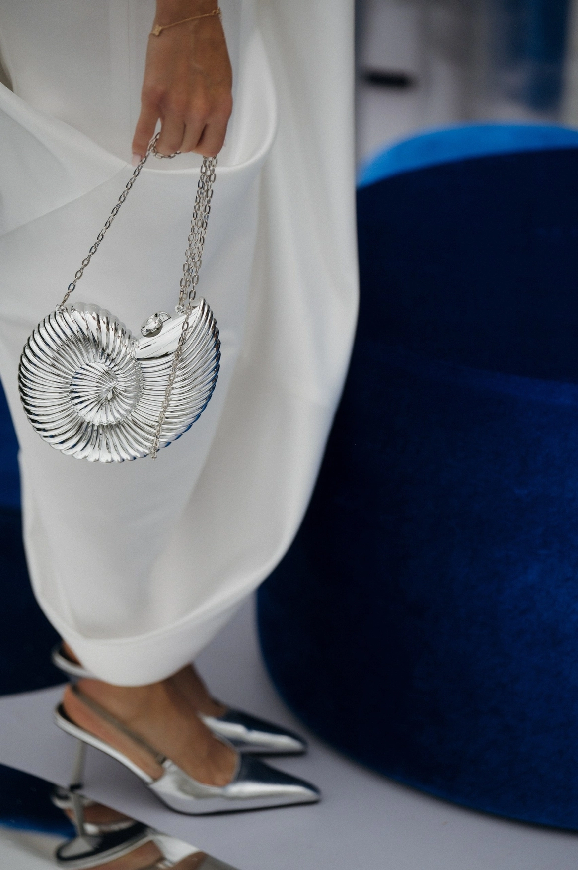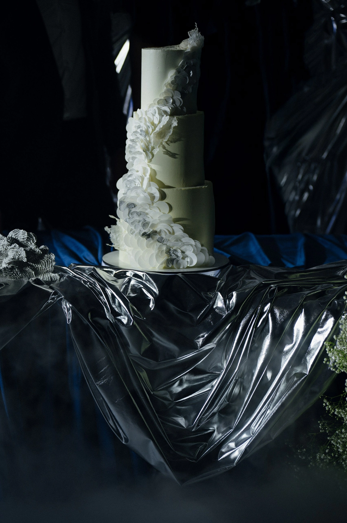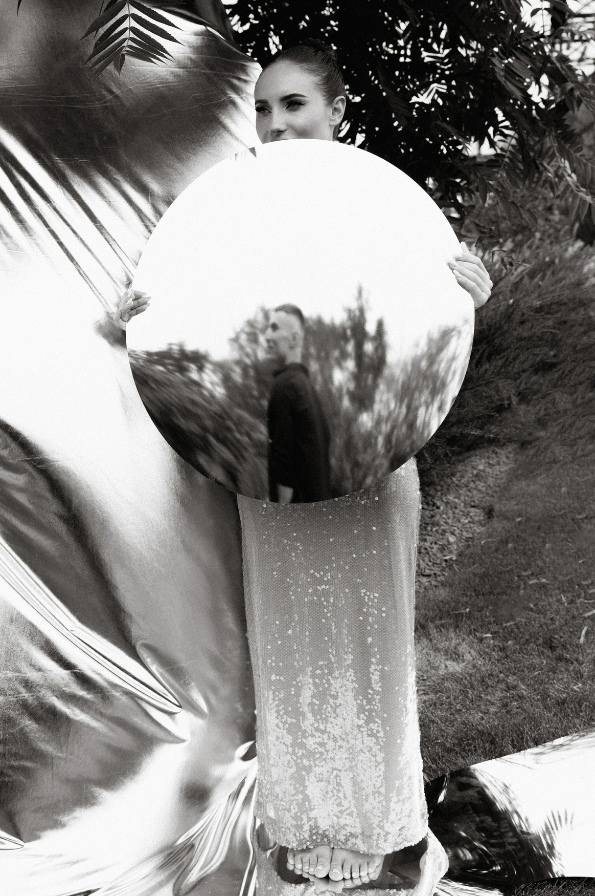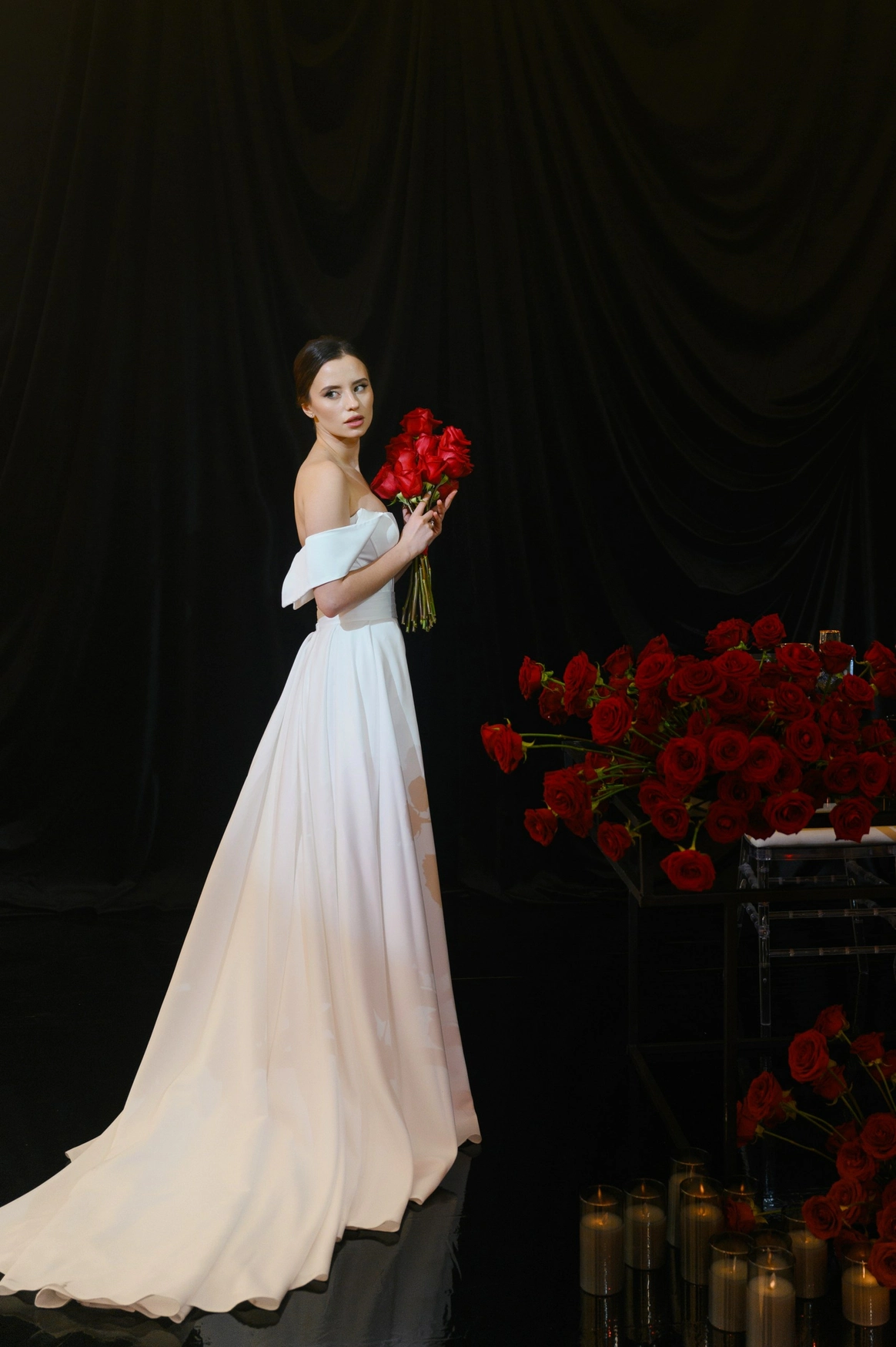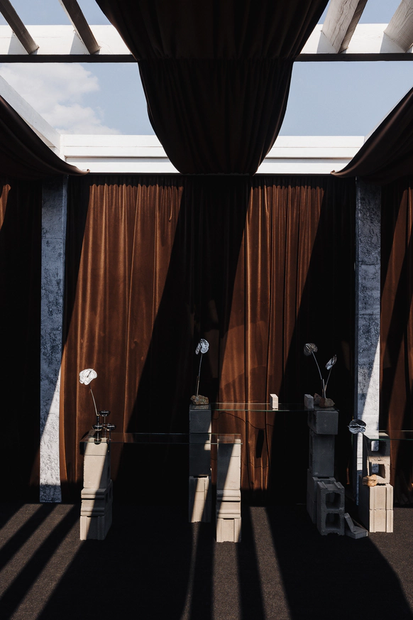Плавные линии, отражения и свет создавали ощущение движения и глубины. Зеркальная драпировка и покрытие пола создавали эффект водной глади.