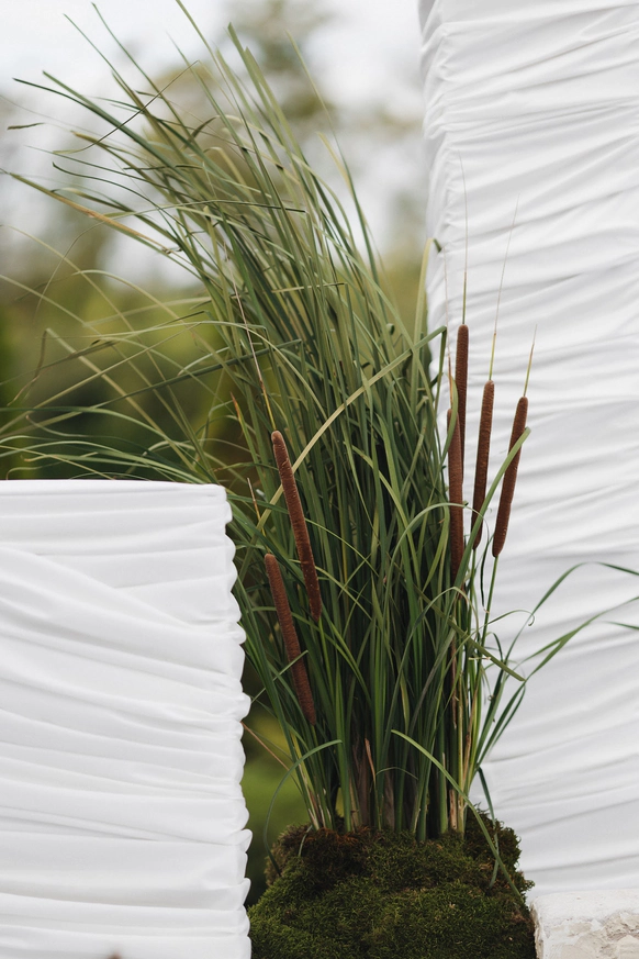 В декоре мы использовали рогоз, который собрали на берегу той самой реки. Эти природные элементы стали частью сценографии церемонии и зоны ужина.