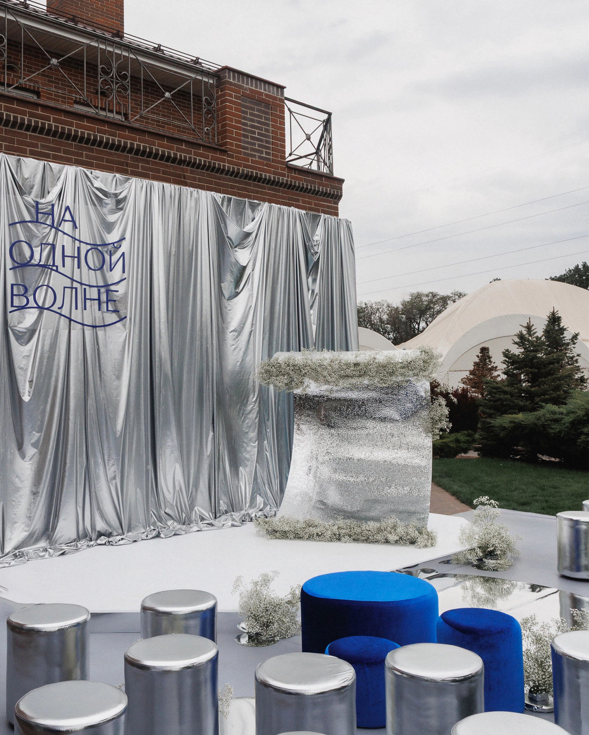 Чтобы создать цельную картину, тротуарную плитку площадки полностью закрыли белым полотном. Это позволило убрать фактуру покрытия и объединить фон и пол церемонии, создав масштаб.